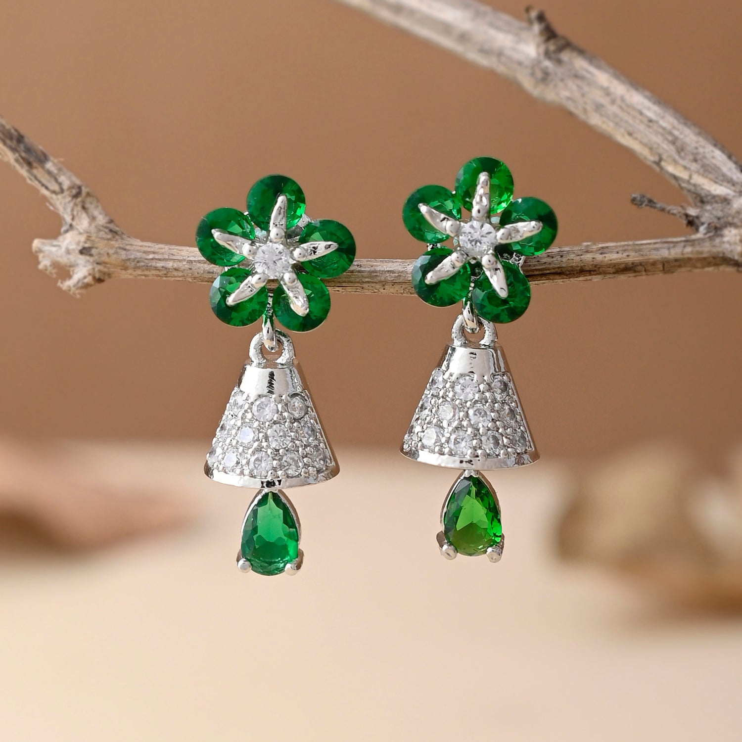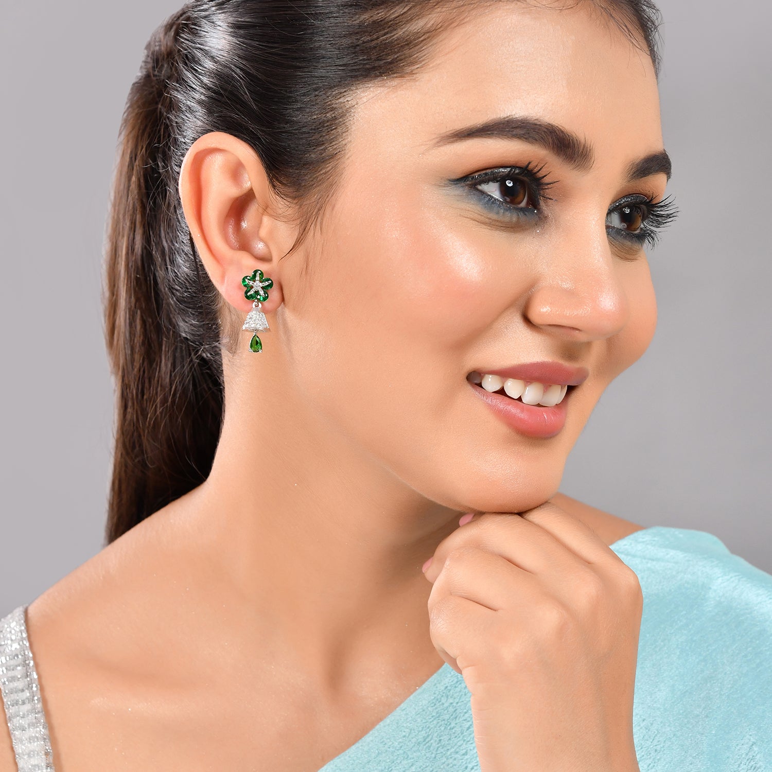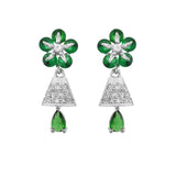 Sparkly drop earrings, perfect for casual wear. Made from brass and silver plated, the pair has been embellished with green and white CZ gemstones. Versatile and comfortable.