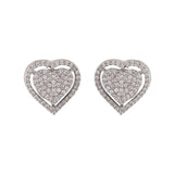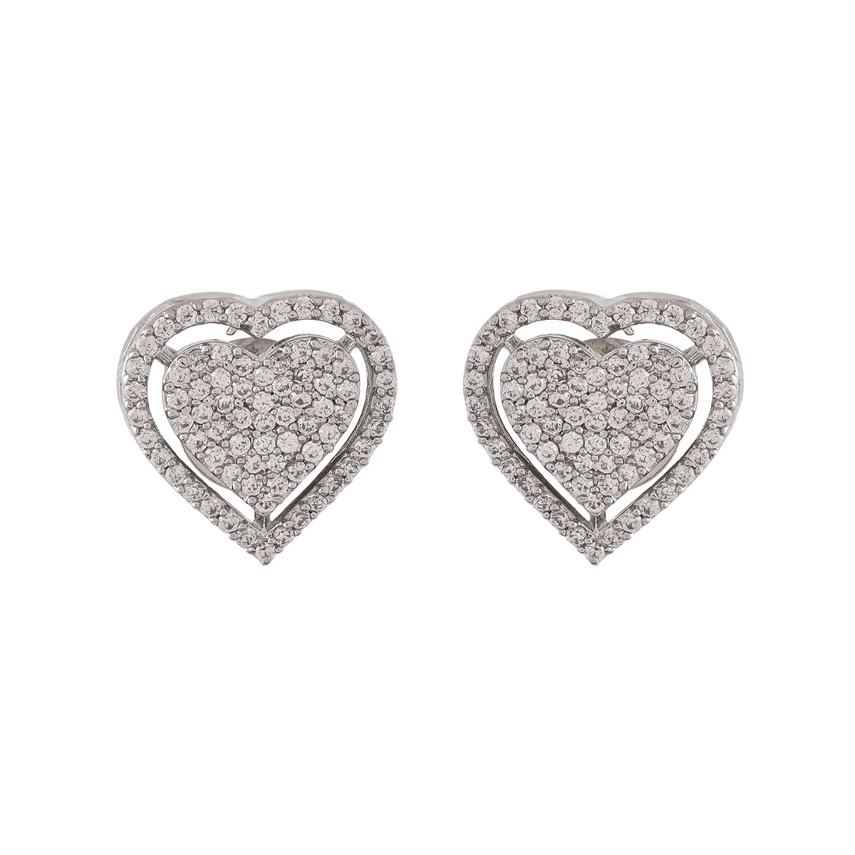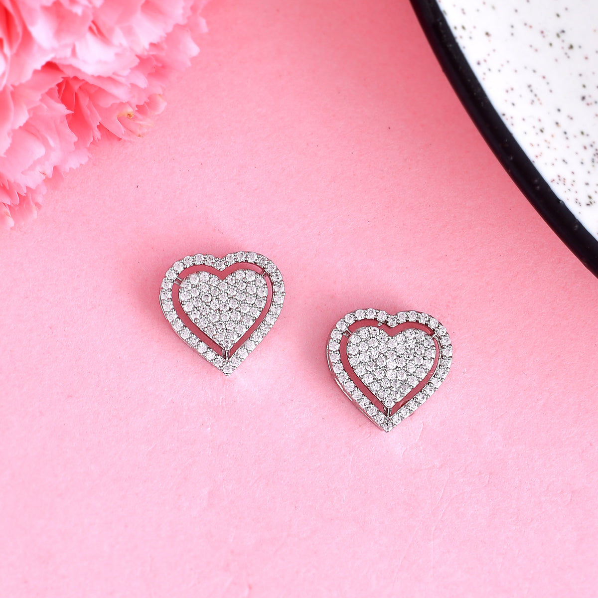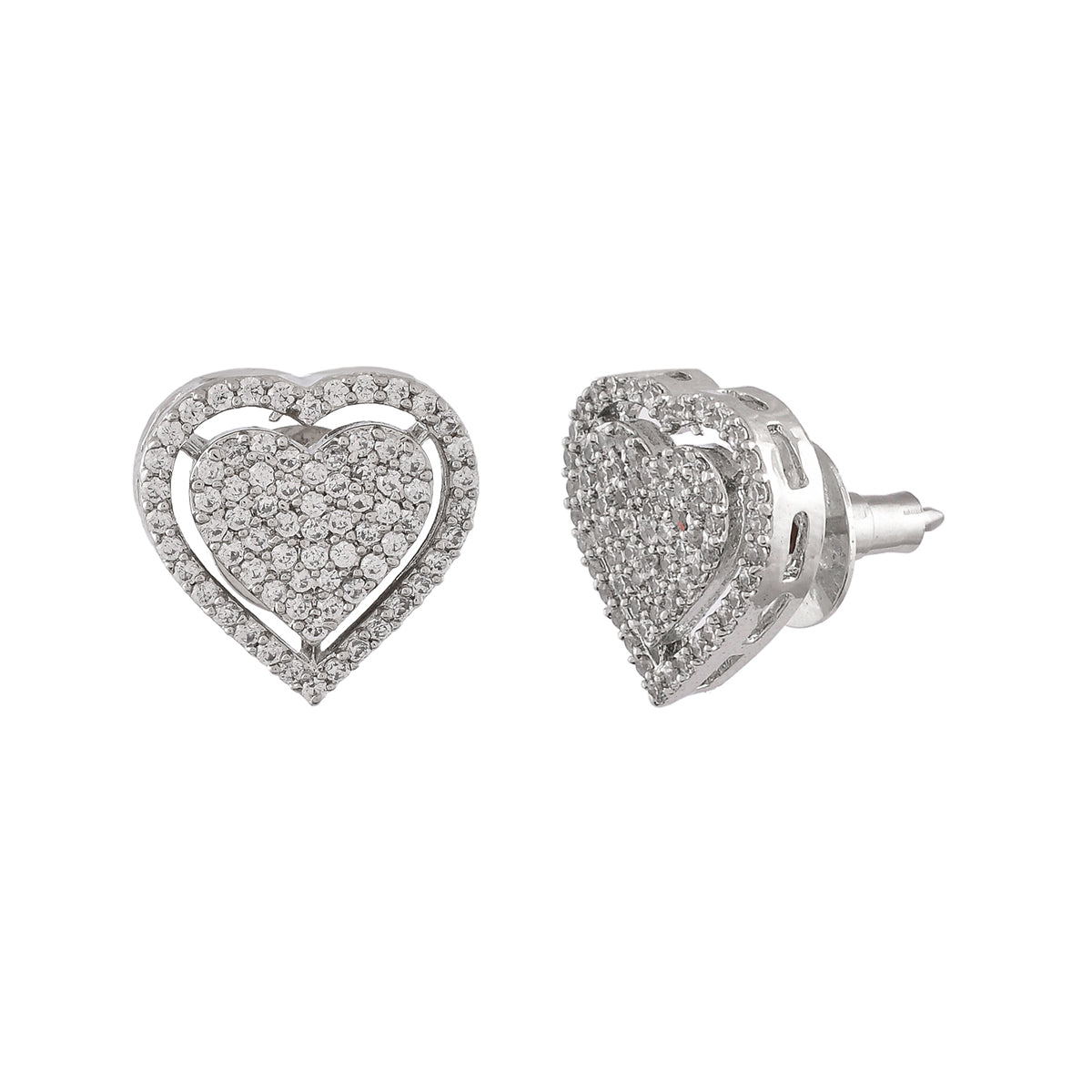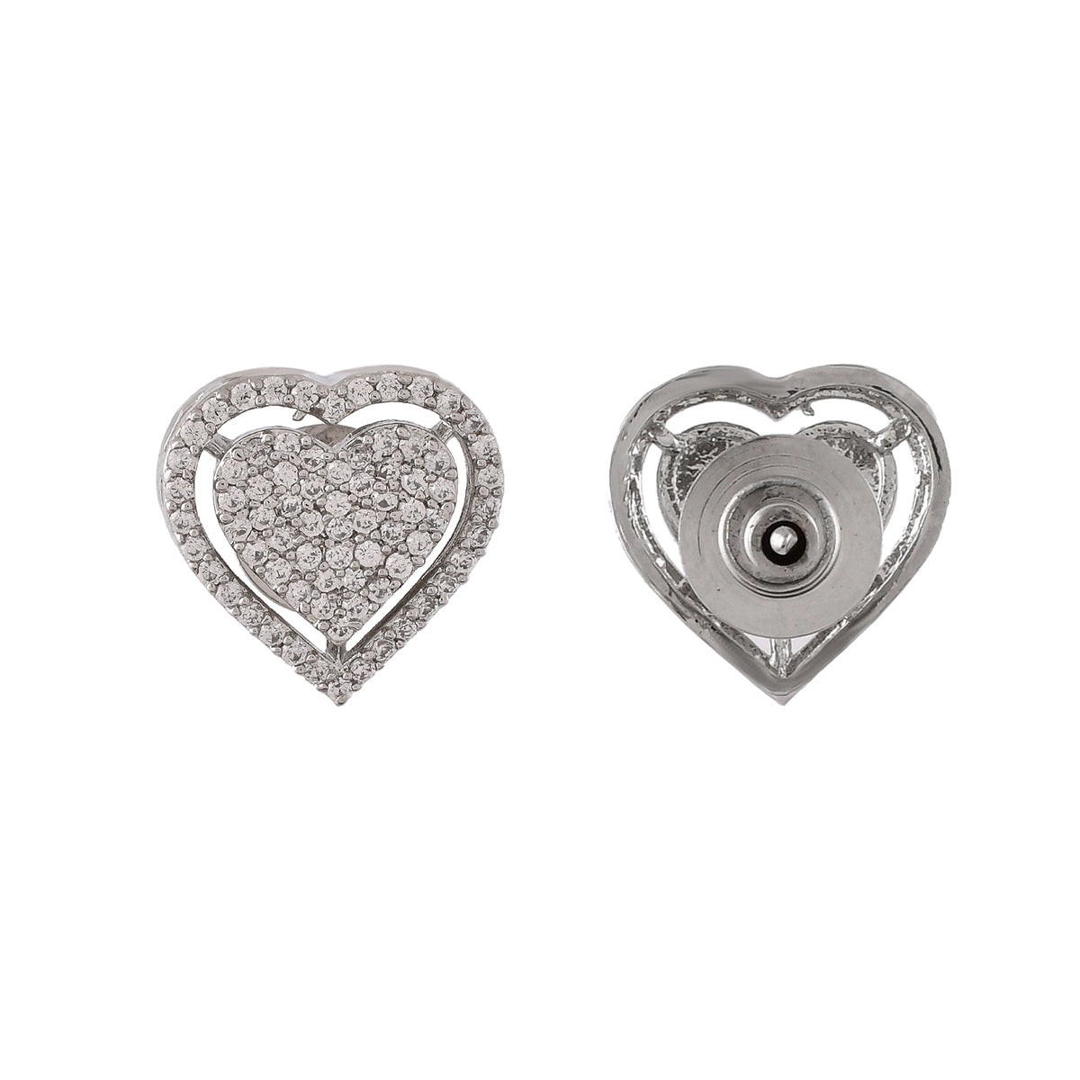 Casual stud style earrings in a heart shape, fashioned out of brass and silver plated. Embellished with CZ gemstones. Good for everyday wear.