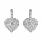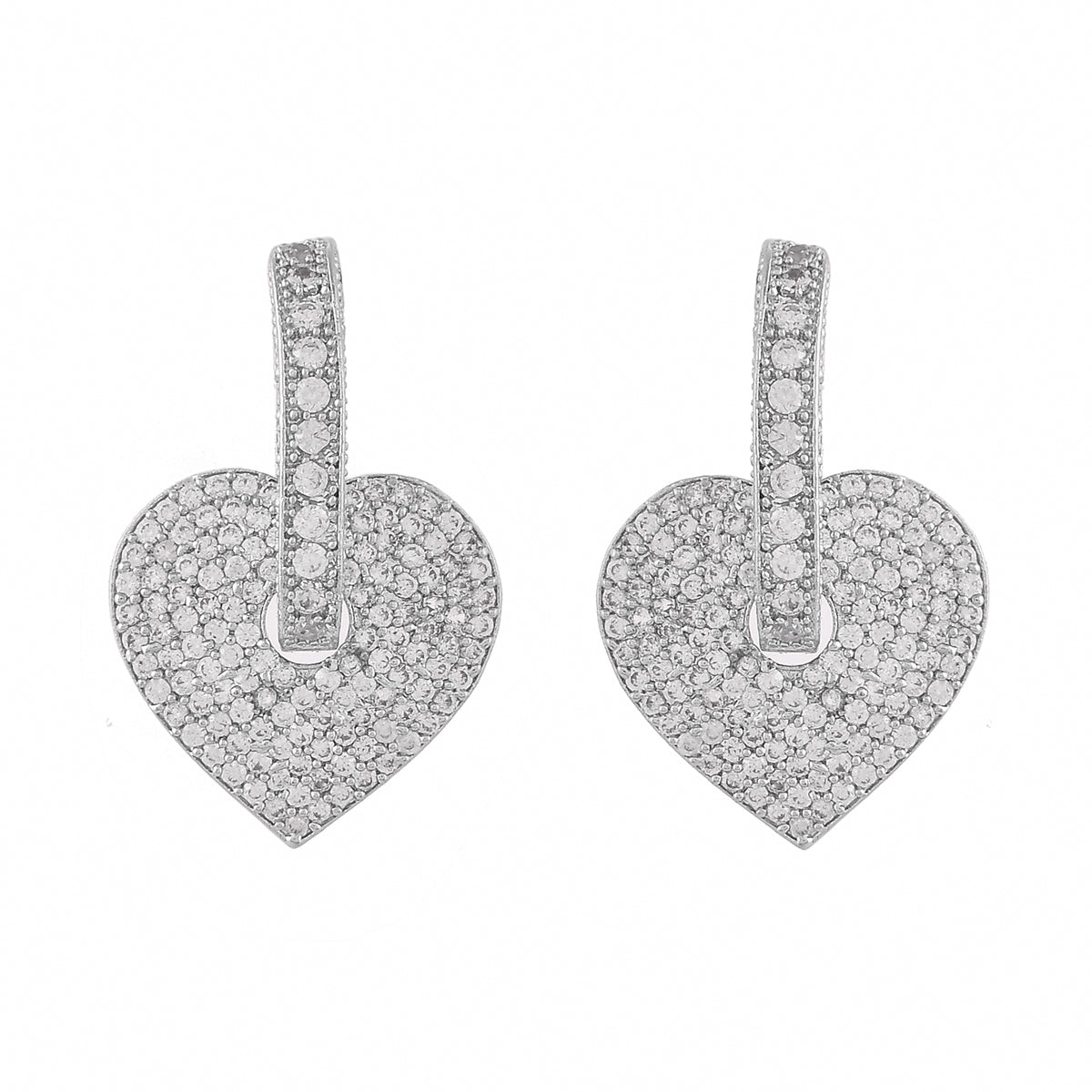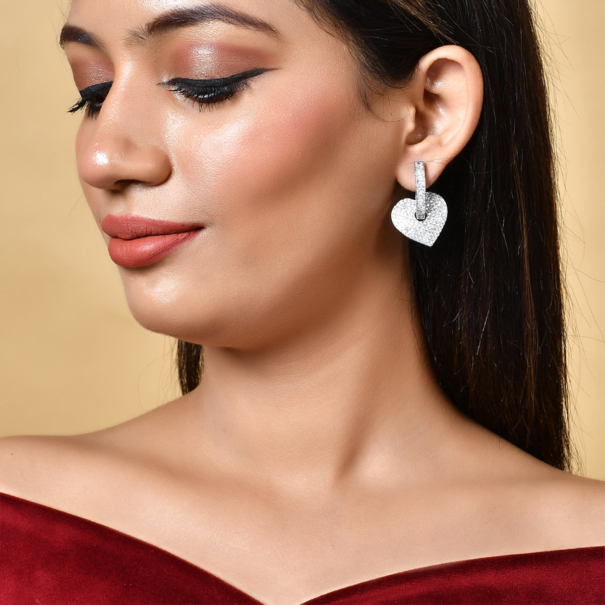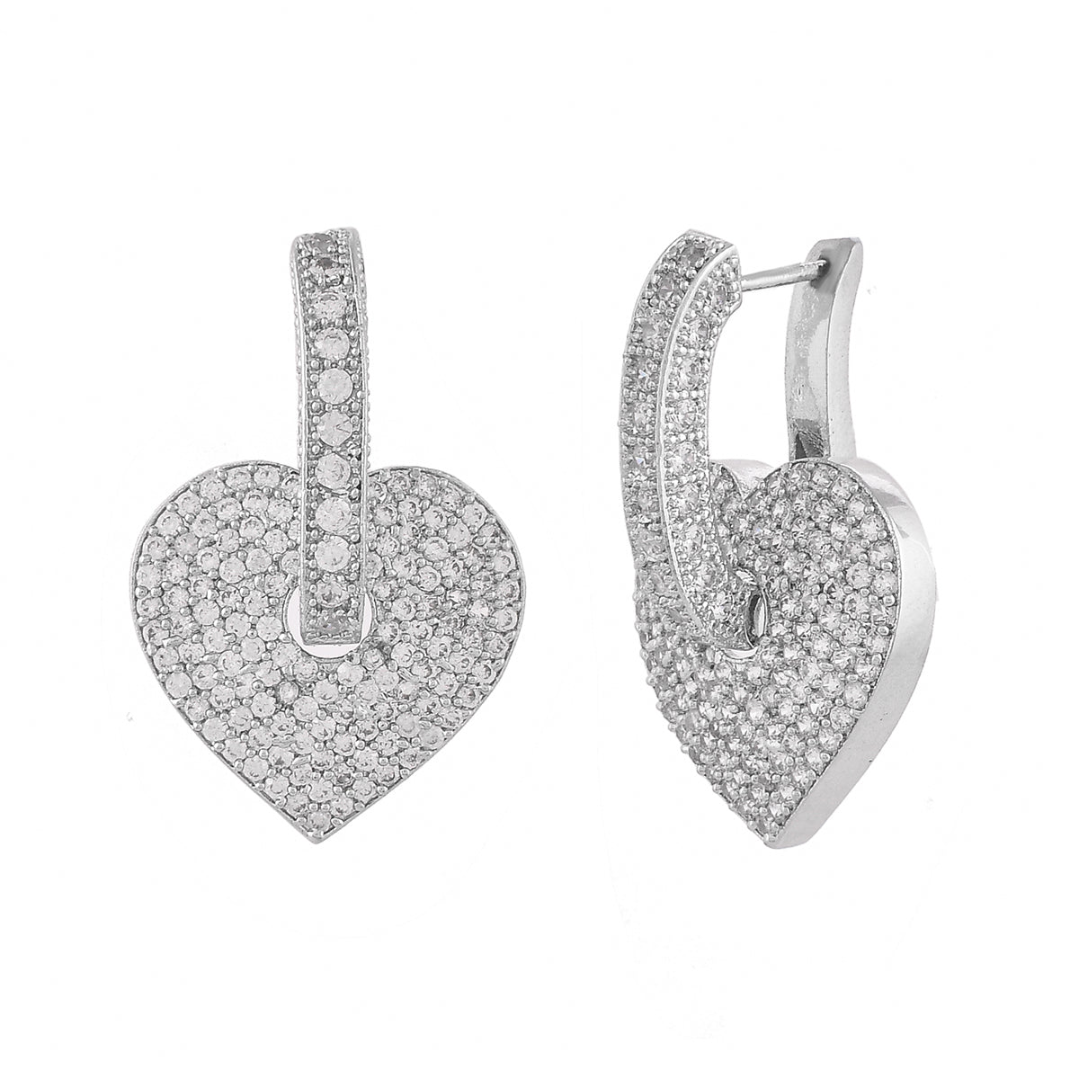 Delicate and charming heart huggie earrings embellished with round cut CZ gems in a cluster setting. Made from brass and silver plated. Pair with any of your favorite outfits.