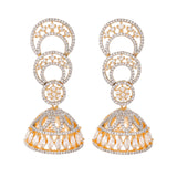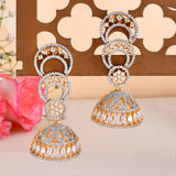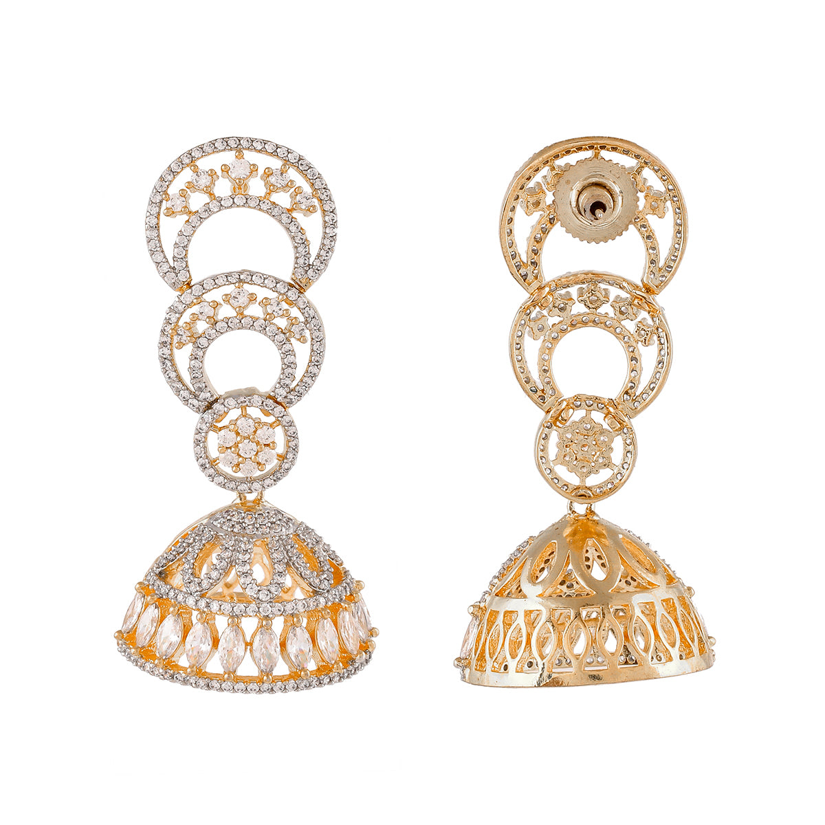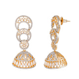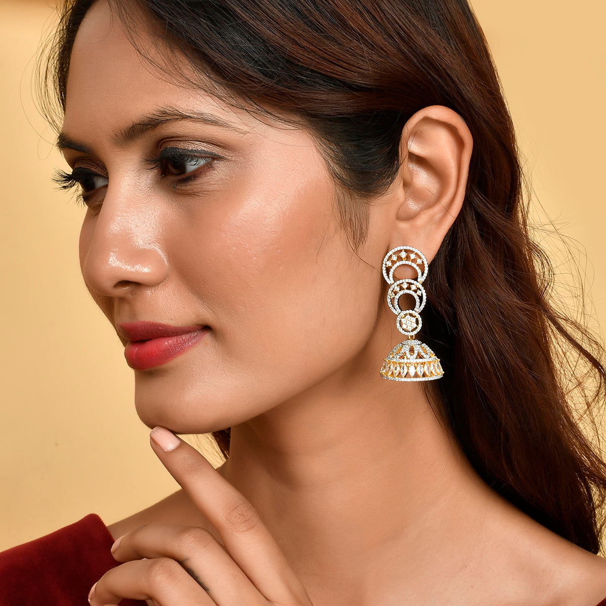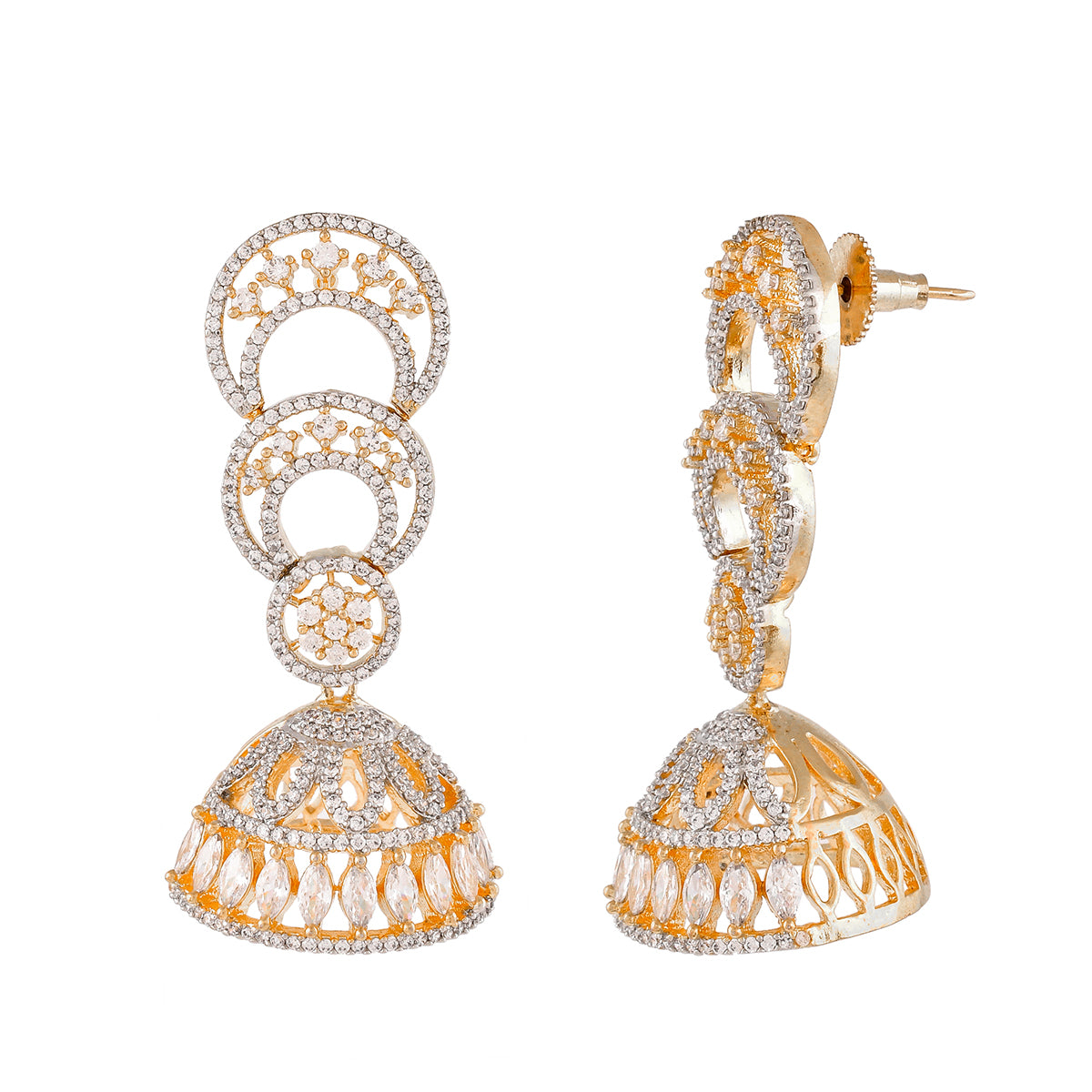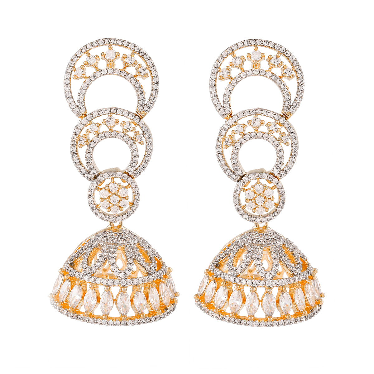 Jhumki drop earrings heavily embellished with zirconia gemstones and two tone plated. Made from brass and featuring a high polish finish. Good for formal wear.