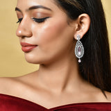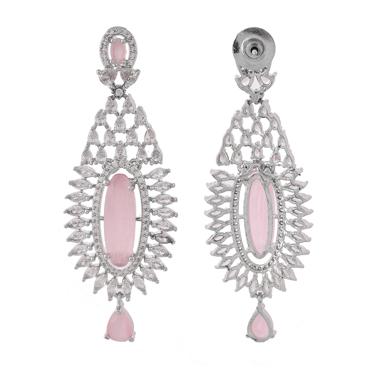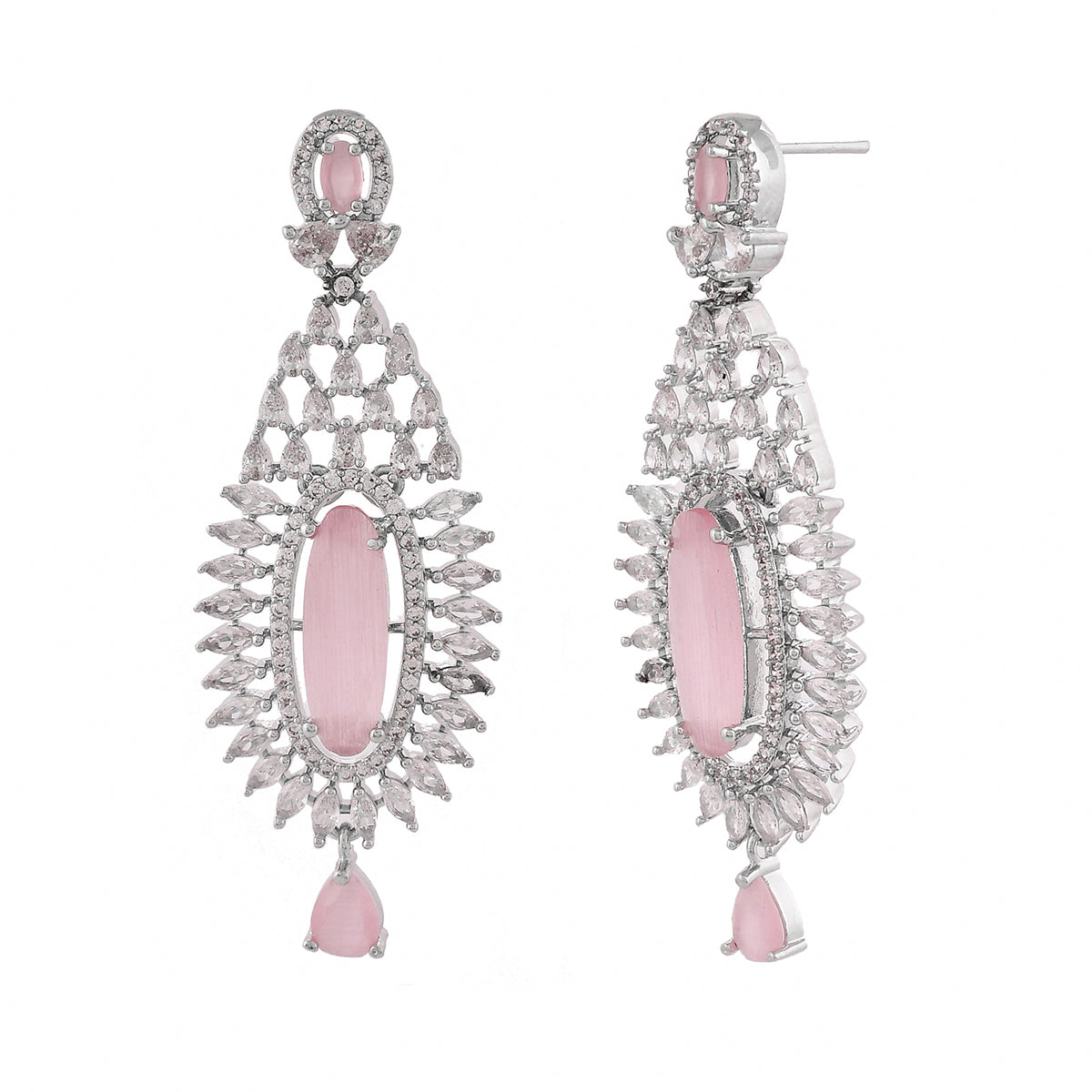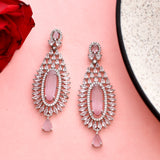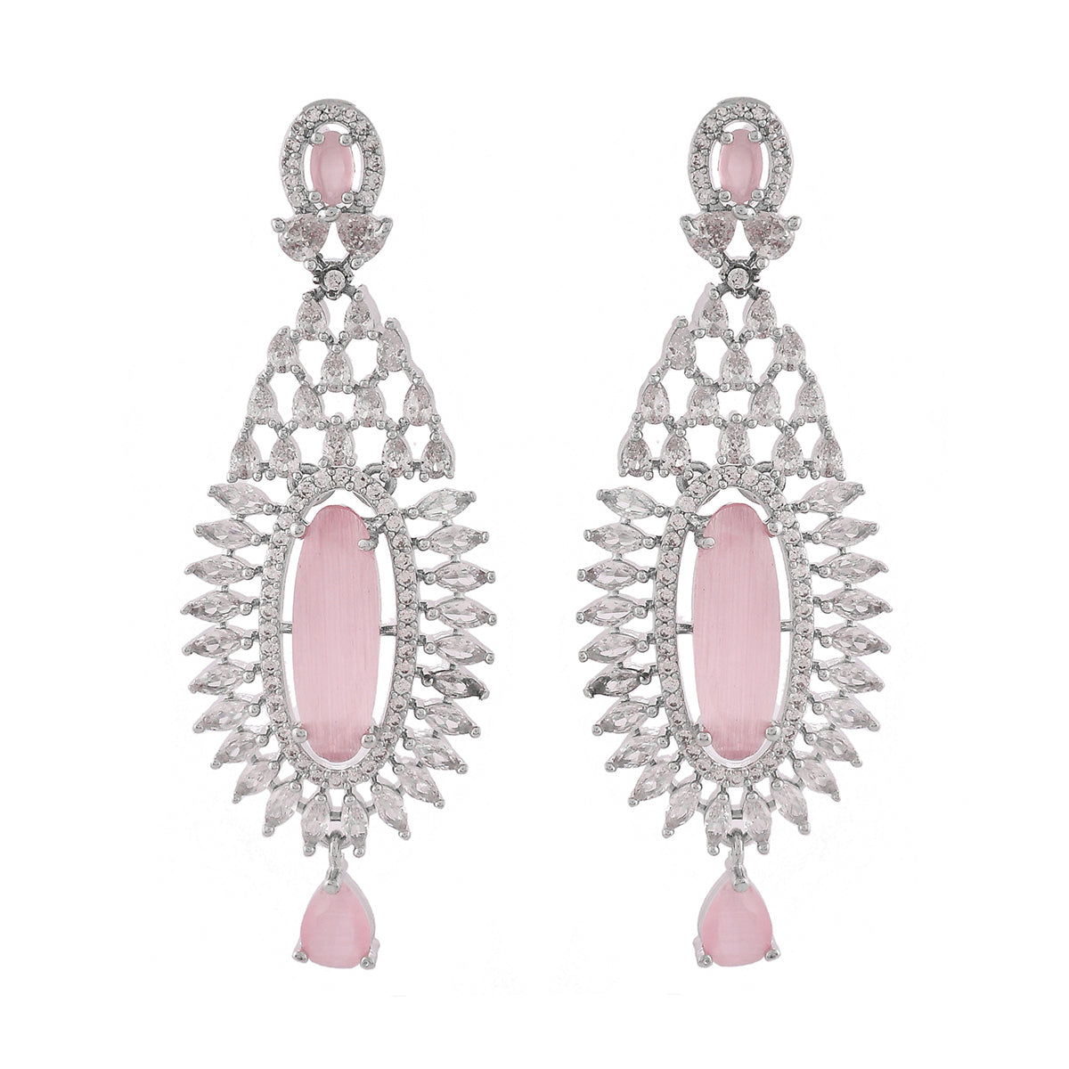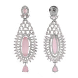 Elegant chandelier earrings made from brass and embellished with light pink and white CZ gems. Silver plated for added charm. Good for formal wear.