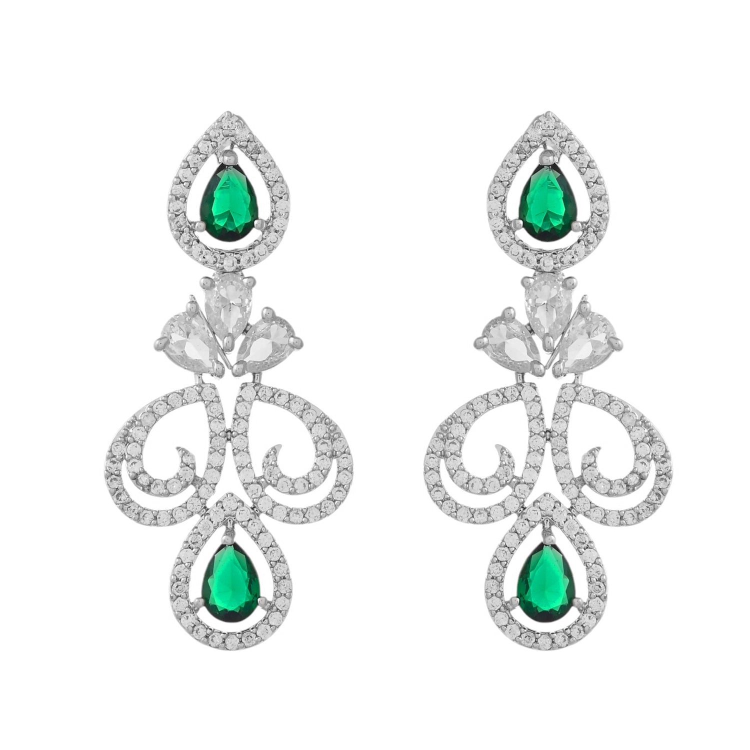 Elevate your festive look with this exquisite Voylla American Diamond Necklace Set, perfect for Navratri, Diwali, Durga Puja, Rakhi, and other celebrations. Crafted from high-quality brass and adorned with sparkling cubic zirconia stones, this set features a stunning rhodium plating that enhances its elegance. The necklace and matching earrings showcase a beautiful design with green teardrop-shaped stones surrounded by intricate white cubic zirconia, creating a captivating contrast. This necklace set for women is an ideal gift for your wife, sister, girlfriend, mother, or friend, making it a thoughtful choice for any special occasion. Embrace the festive spirit with this luxurious and timeless piece from Voylla.
