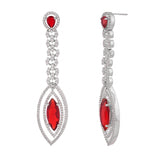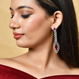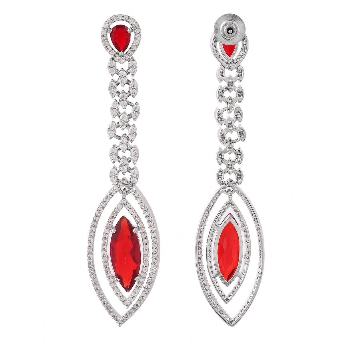Elegant chandelier earrings made from brass and embellished with maroon and white CZ gems. Silver plated for added charm. Good for formal wear.