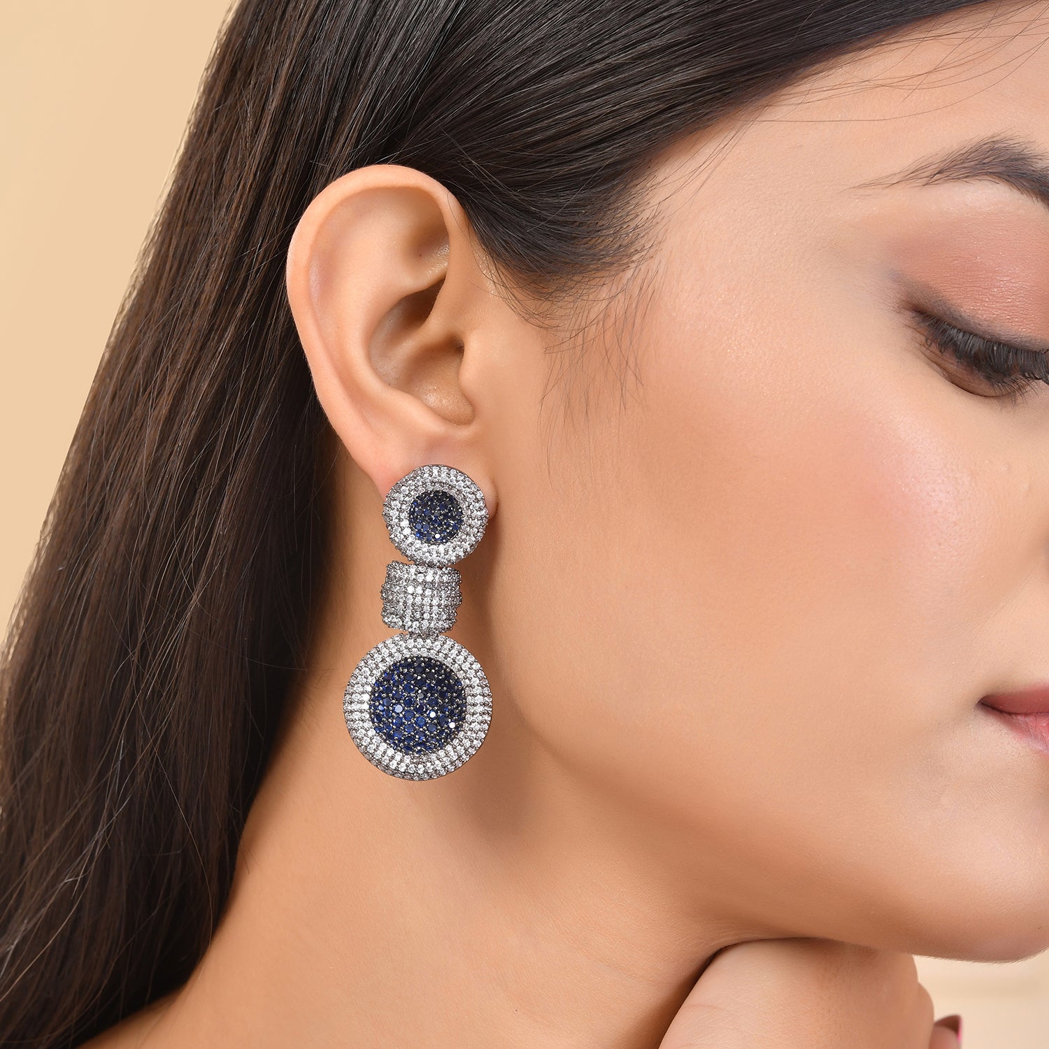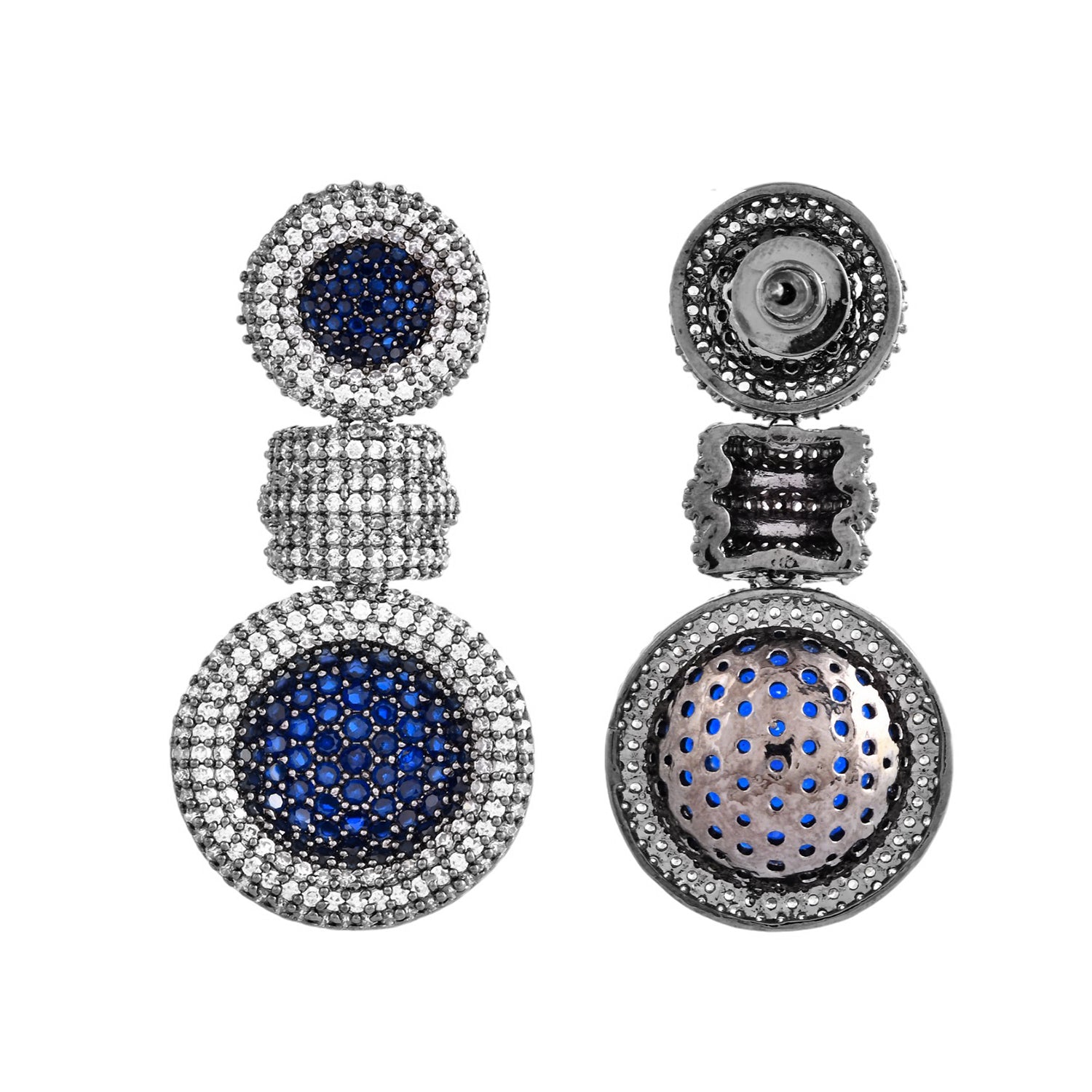 Fashioned from high-quality brass and coated with lustrous black rhodium plating, they present a striking contrast that catches the eye. The centerpiece of each earring is an impeccably faceted American diamond stone, encircled by smaller cubic zirconia that glimmer with every turn. The contrast between the deep Blue hue and the dazzling stones creates a captivating visual effect that complements both traditional and contemporary outfits. These earrings for women are versatile enough for wedding wear or party wear, making them an ideal gift for women who appreciate the finer things in life. Whether it’s for your sister, mother, or a special someone during Diwali, Rakshabandhan, or any festive occasion, these American diamond earrings embody the spirit of celebration and tradition. Their design resonates with the grandeur of pooja wear while maintaining a modern edge suitable for any gathering.