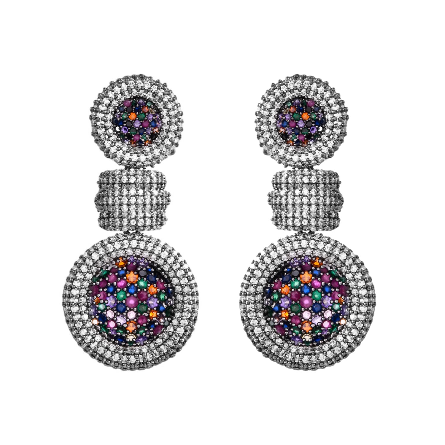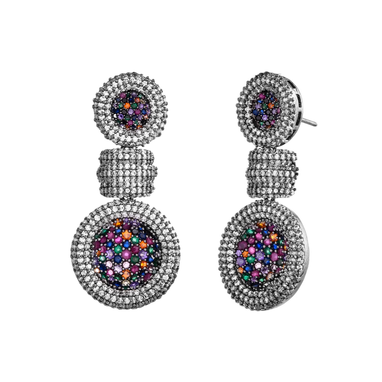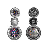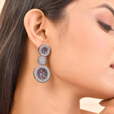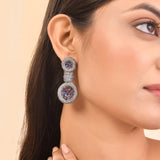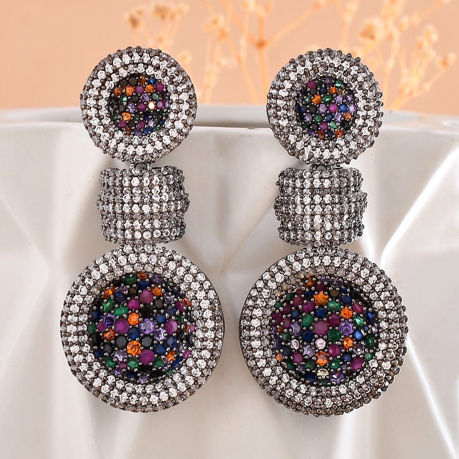 Fashioned from high-quality brass and coated with lustrous black rhodium plating, they present a striking contrast that catches the eye. The centerpiece of each earring is an impeccably faceted American diamond stone, encircled by smaller cubic zirconia that glimmer with every turn. The contrast between the multicolored hue and the dazzling stones creates a captivating visual effect that complements both traditional and contemporary outfits. These earrings for women are versatile enough for wedding wear or party wear, making them an ideal gift for women who appreciate the finer things in life. Whether it’s for your sister, mother, or a special someone during Diwali, Rakshabandhan, or any festive occasion, these American diamond earrings embody the spirit of celebration and tradition. Their design resonates with the grandeur of pooja wear while maintaining a modern edge suitable for any gathering.