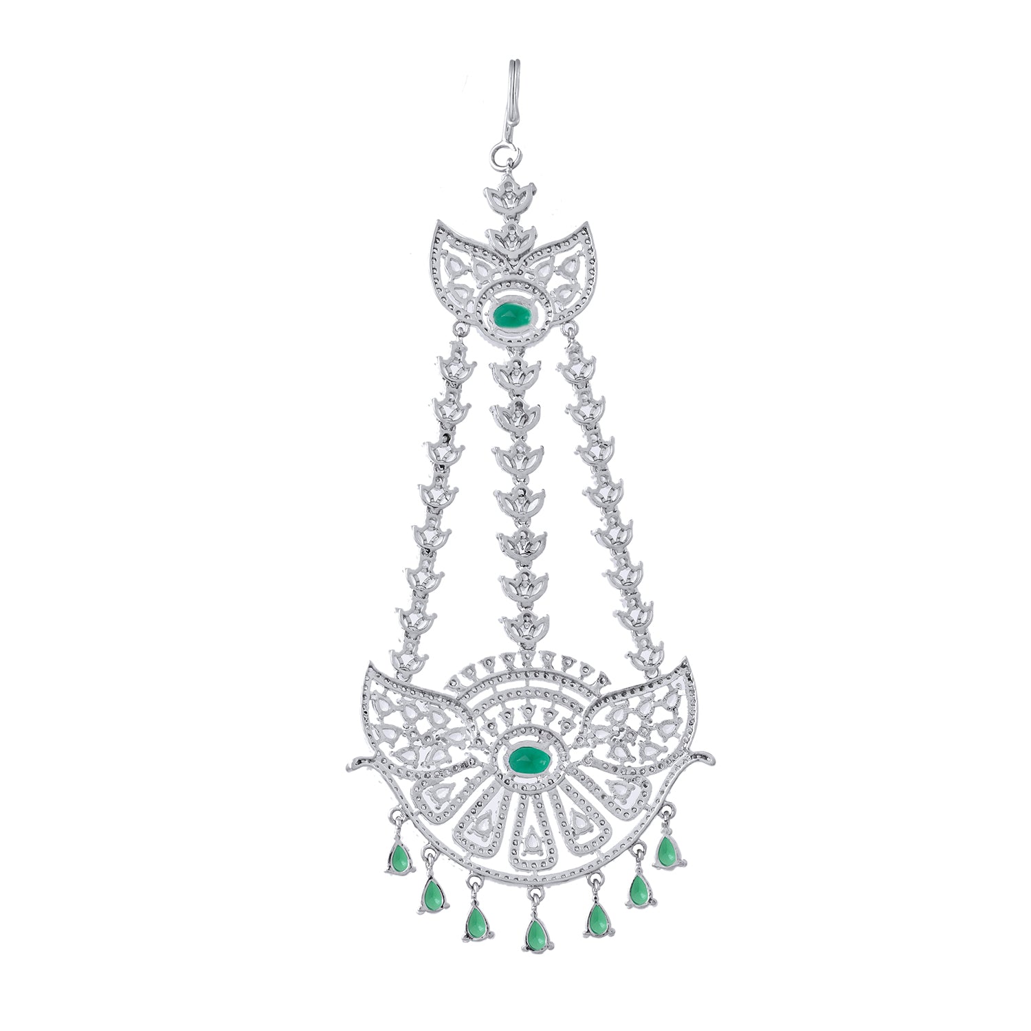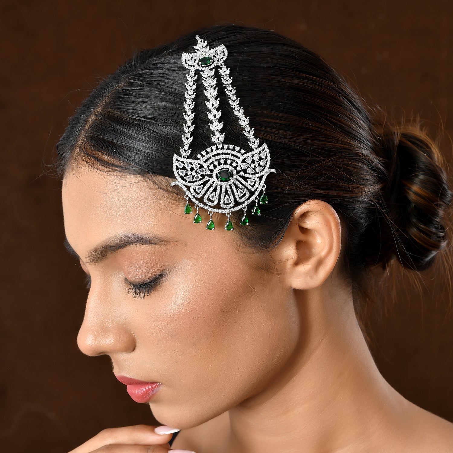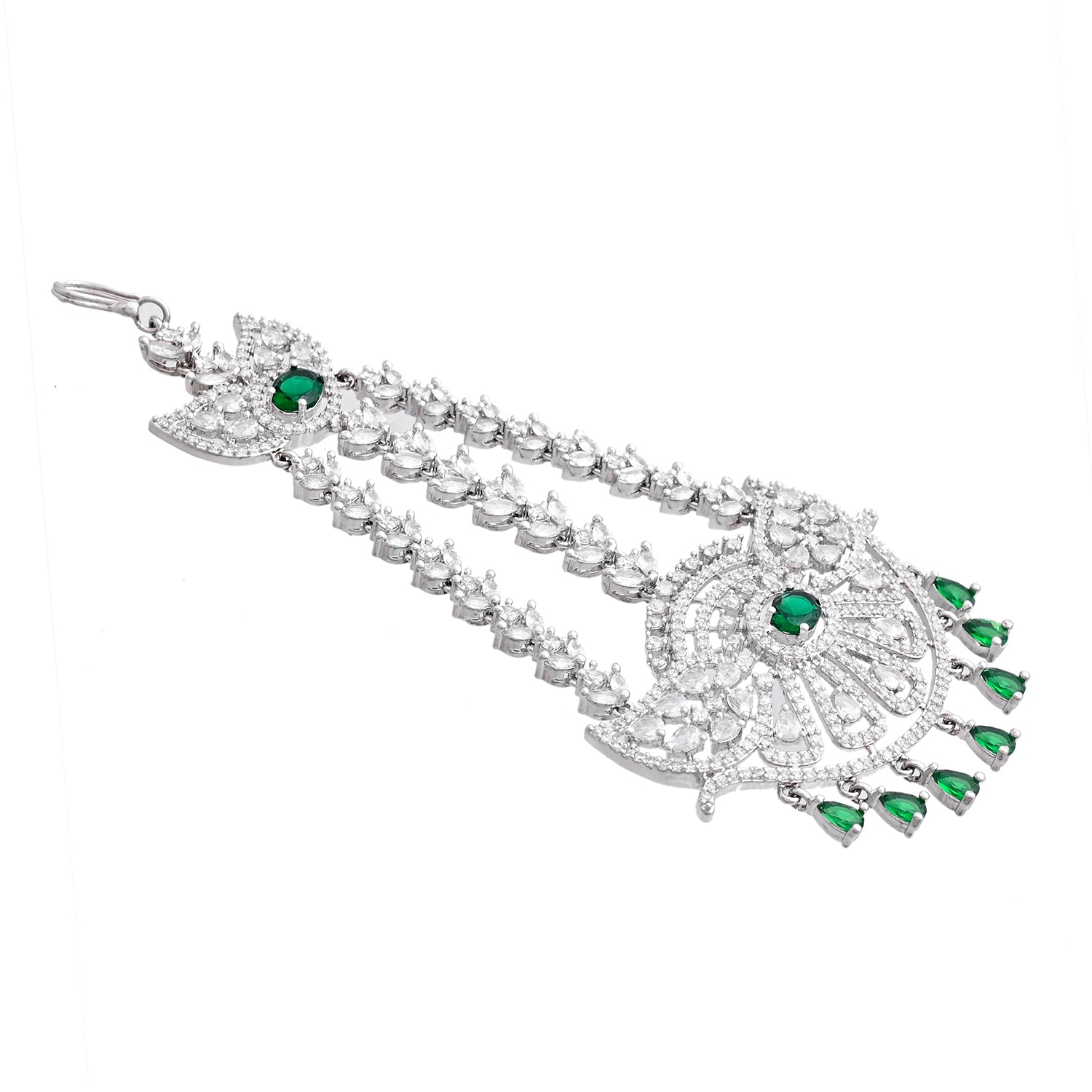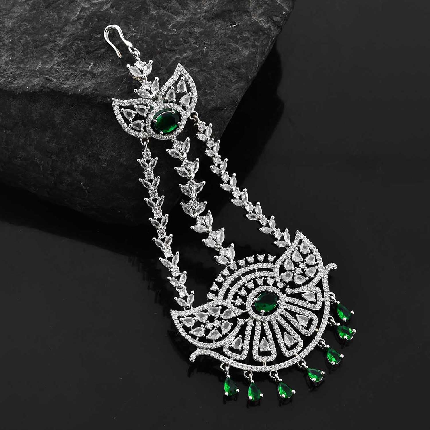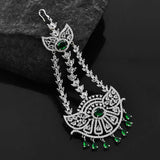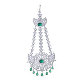 The Sparkling Elegance Noor-e-Zevar American Diamond Passa Maang Tikka from the Sparkling Elegance collection is a masterpiece of refined beauty and cultural significance. Crafted with premium brass and enhanced with brilliant white rhodium plating, this accessory showcases a dazzling arrangement of American diamonds and vibrant green accents. Perfect for Muslim weddings, Eid celebrations, or festive occasions like Diwali and Rakshabandhan, its versatile charm allows it to pair effortlessly with ethnic ensembles such as sarees and lehengas, or with modern outfits for a chic statement. An ideal gift for your sister, girlfriend, wife, mother, or friend, this Maang Tikka is a radiant symbol of elegance and tradition for life's special moments.