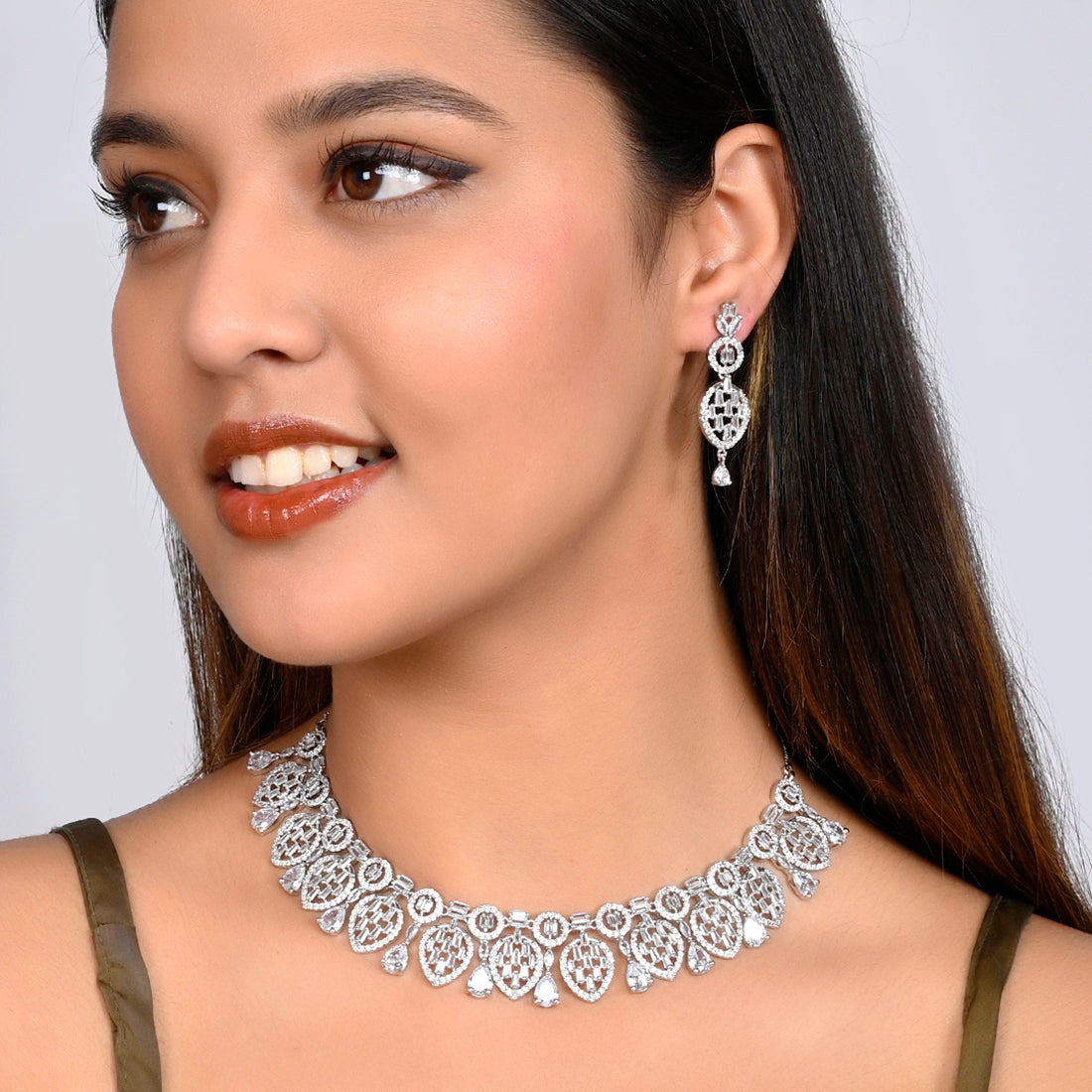 An opulent and heavily embellished zirconia gems jewellery set. Made from brass and silver plated. Pair with formal looks of all kinds.