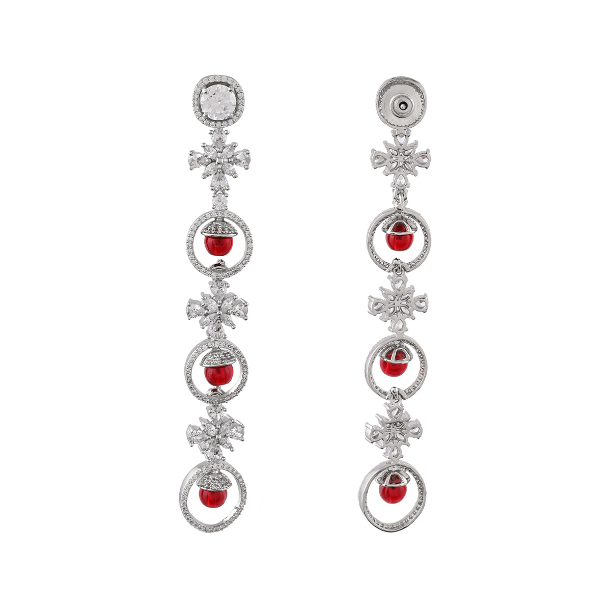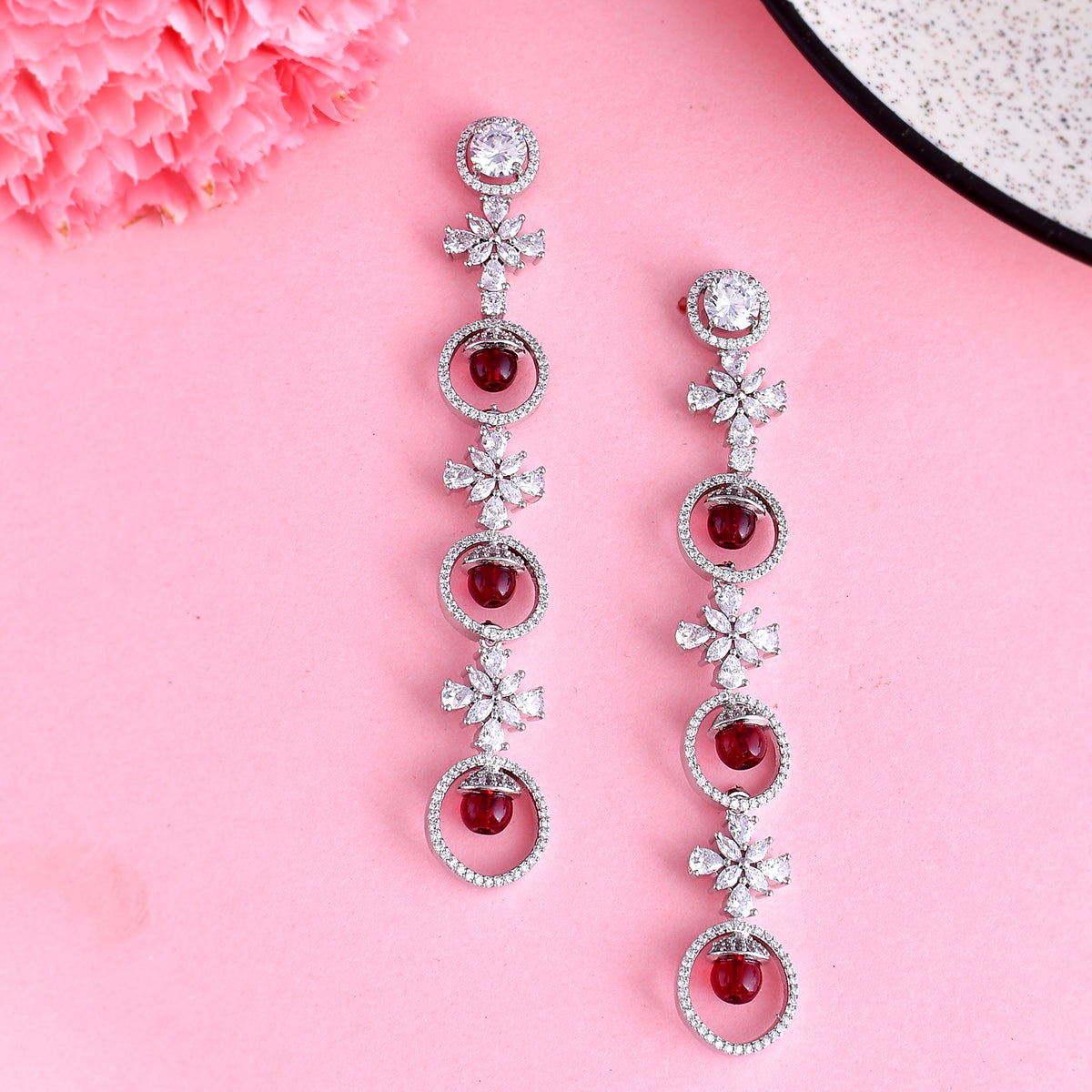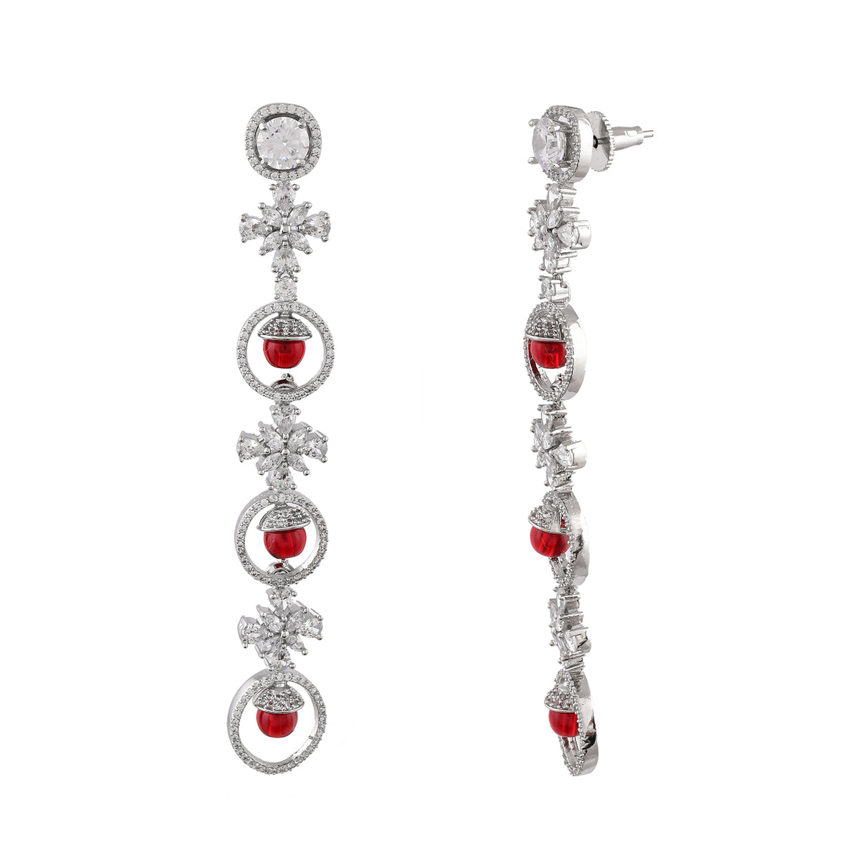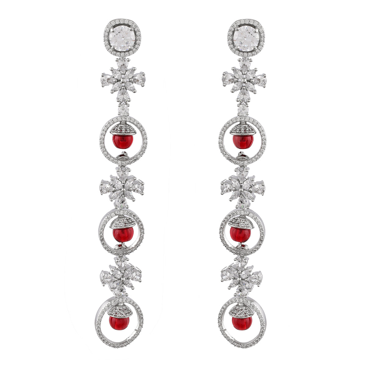 Contemporary style delicate drop earrings, made from brass and silver plated. Embellished with pear cut zirconia gemstones. Pair with formal gowns.