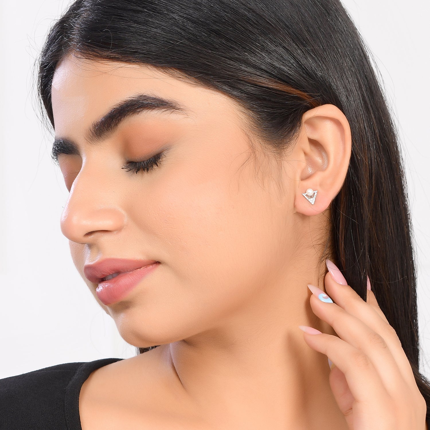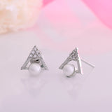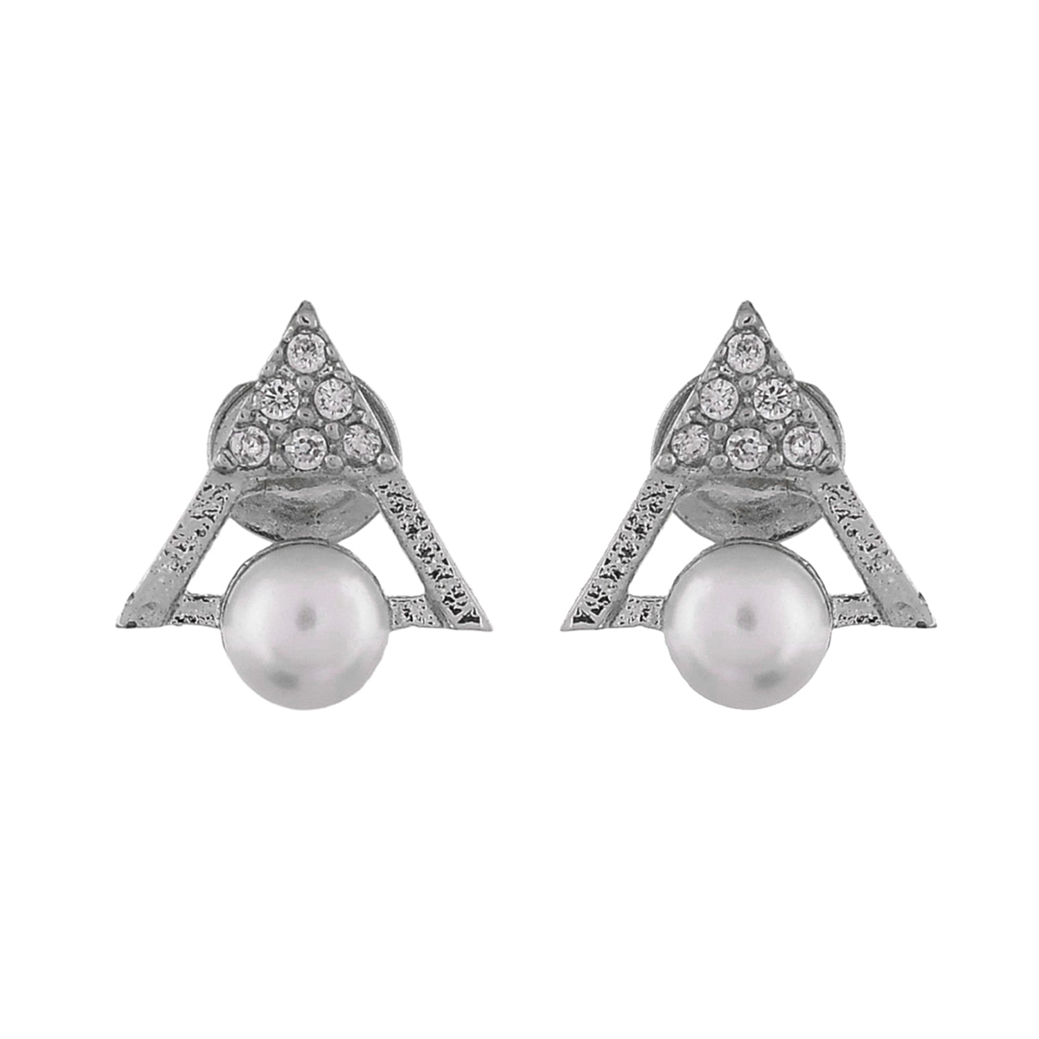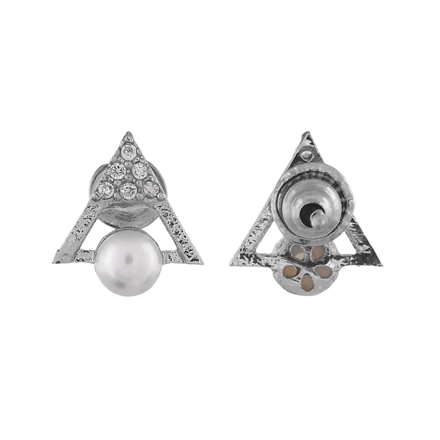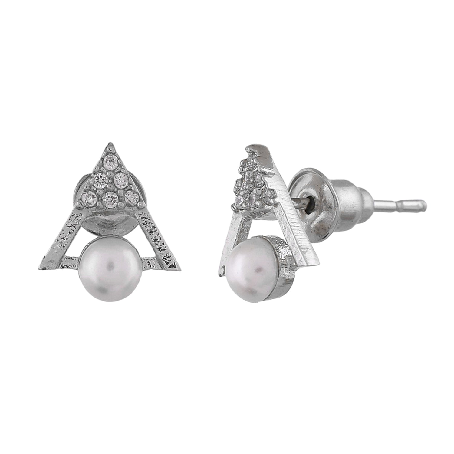 Tiny stud earrings with white pearls and CZ gemstones. Made from brass and silver plated. Perfect for everyday wear.