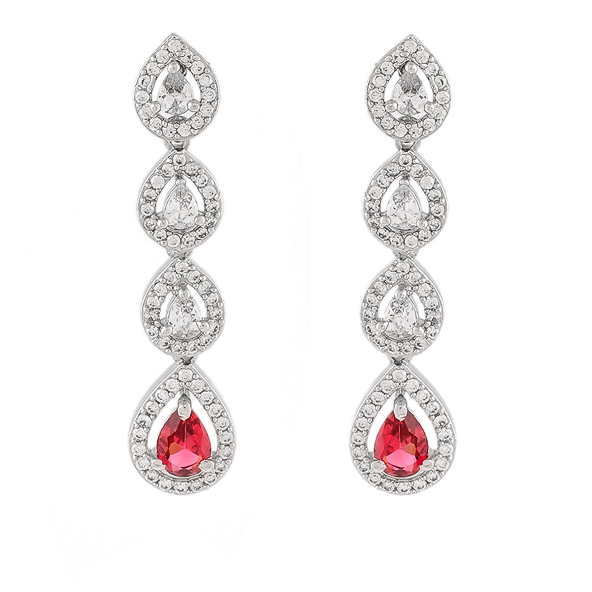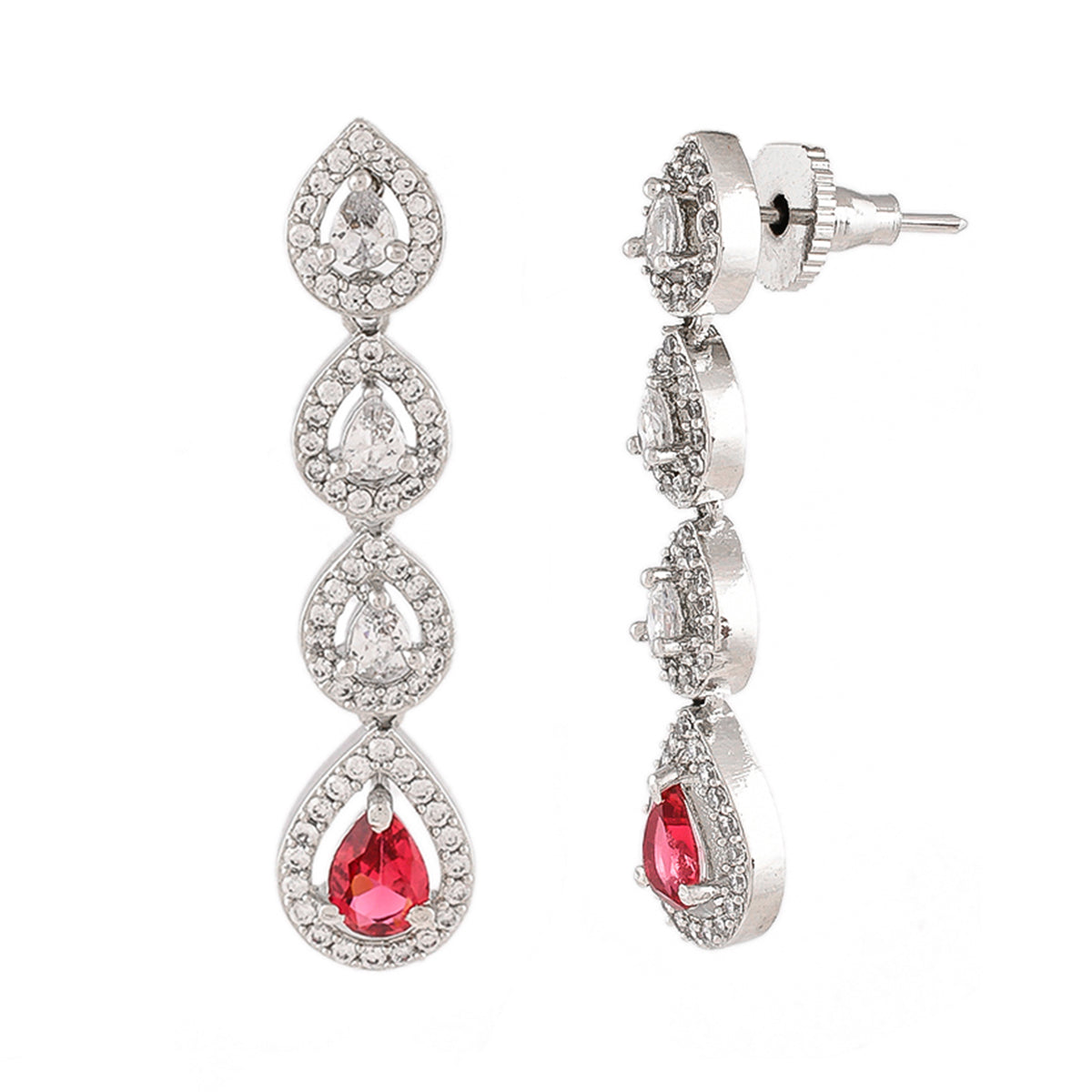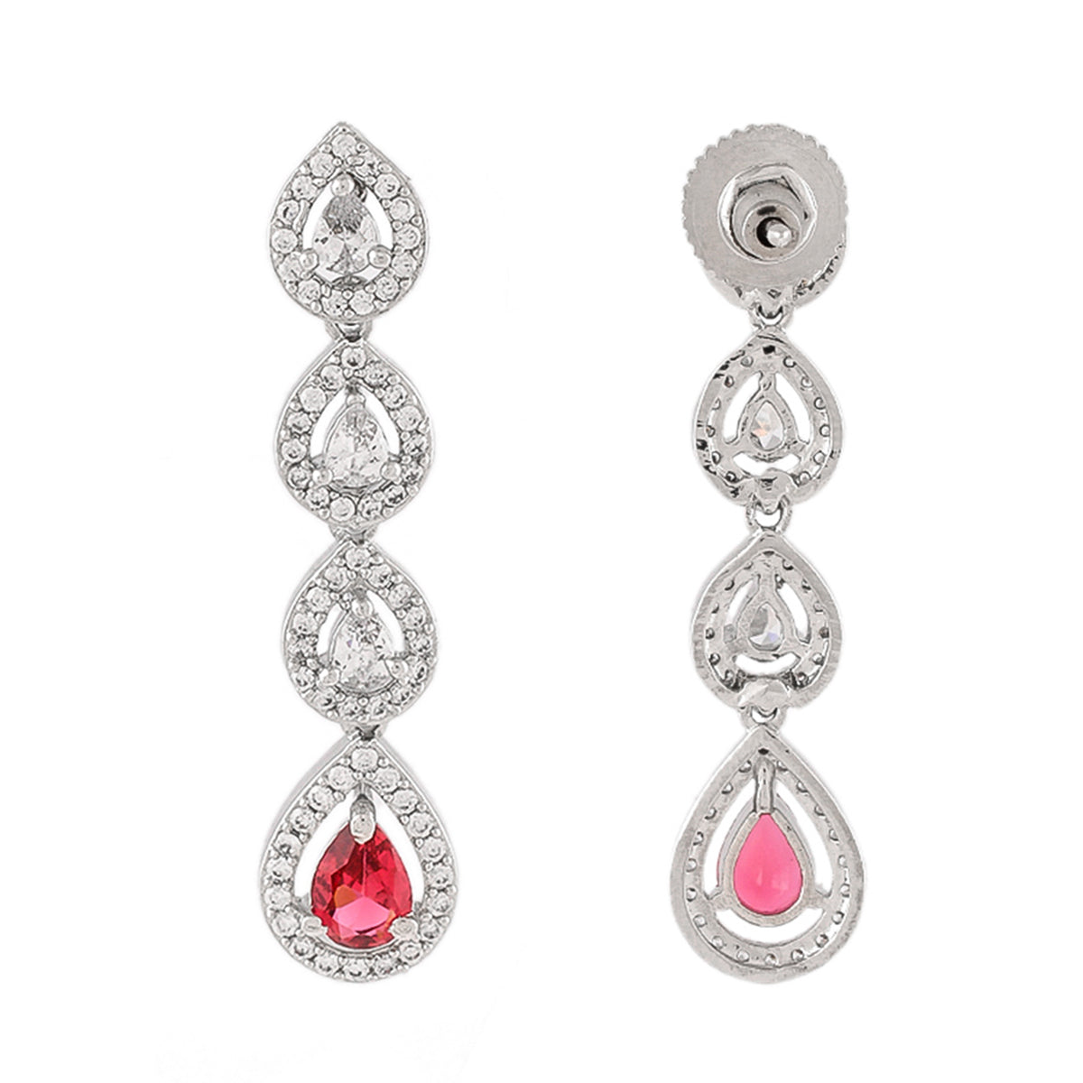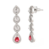 Elegant dangler earrings, made from brass and white rhodium plated. Featuring a high polish finish and adorned with pink and white zirconia gemstones. Pair with a formal gown.