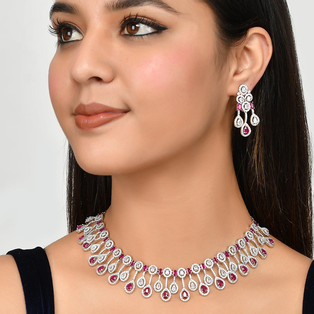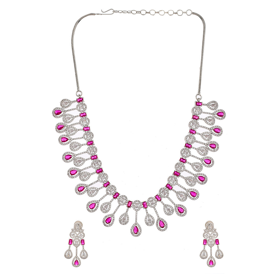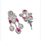Indulge in the timeless elegance of this sparkling silver necklace set. The chain is adorned with shimmering red crystals that catch the light with every movement, exuding grace and sophistication. The matching earrings complete the set, making it a perfect accessory for any occasion. Embrace your inner elegance with this stunning piece.