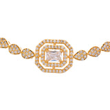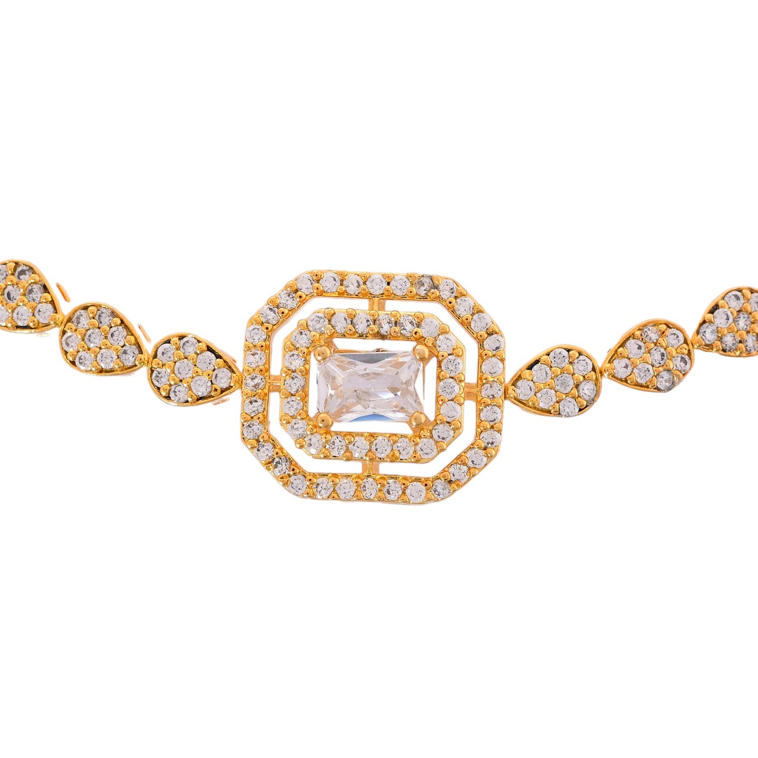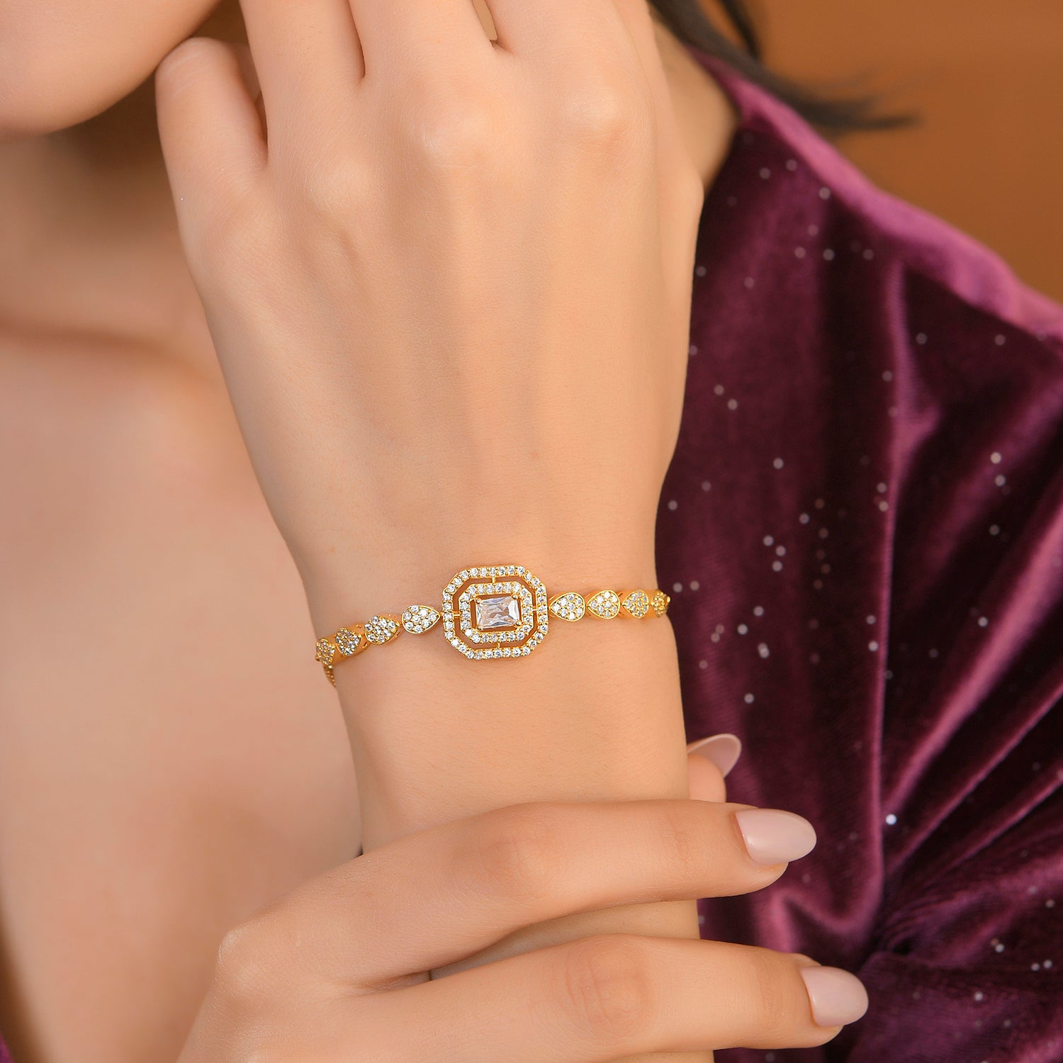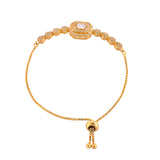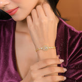 Crafted from high-quality brass and adorned with shimmering American Diamonds, this bracelet is a testament to exquisite craftsmanship. The central square motif, encrusted with diamonds, is flanked by delicate circular patterns that add to its allure. Whether you’re looking for a thoughtful gift for your wife, sister, or celebrating Rakhi, this bracelet is an impeccable choice. It’s not just a piece of jewelry but a versatile accessory fit for any party wear ensemble. This women’s bracelet exudes luxury and style that will complement the grace of any woman or girl who wears it. Make every moment memorable with Voylla bracelets’ timeless beauty—a treasure in your jewelry collection.