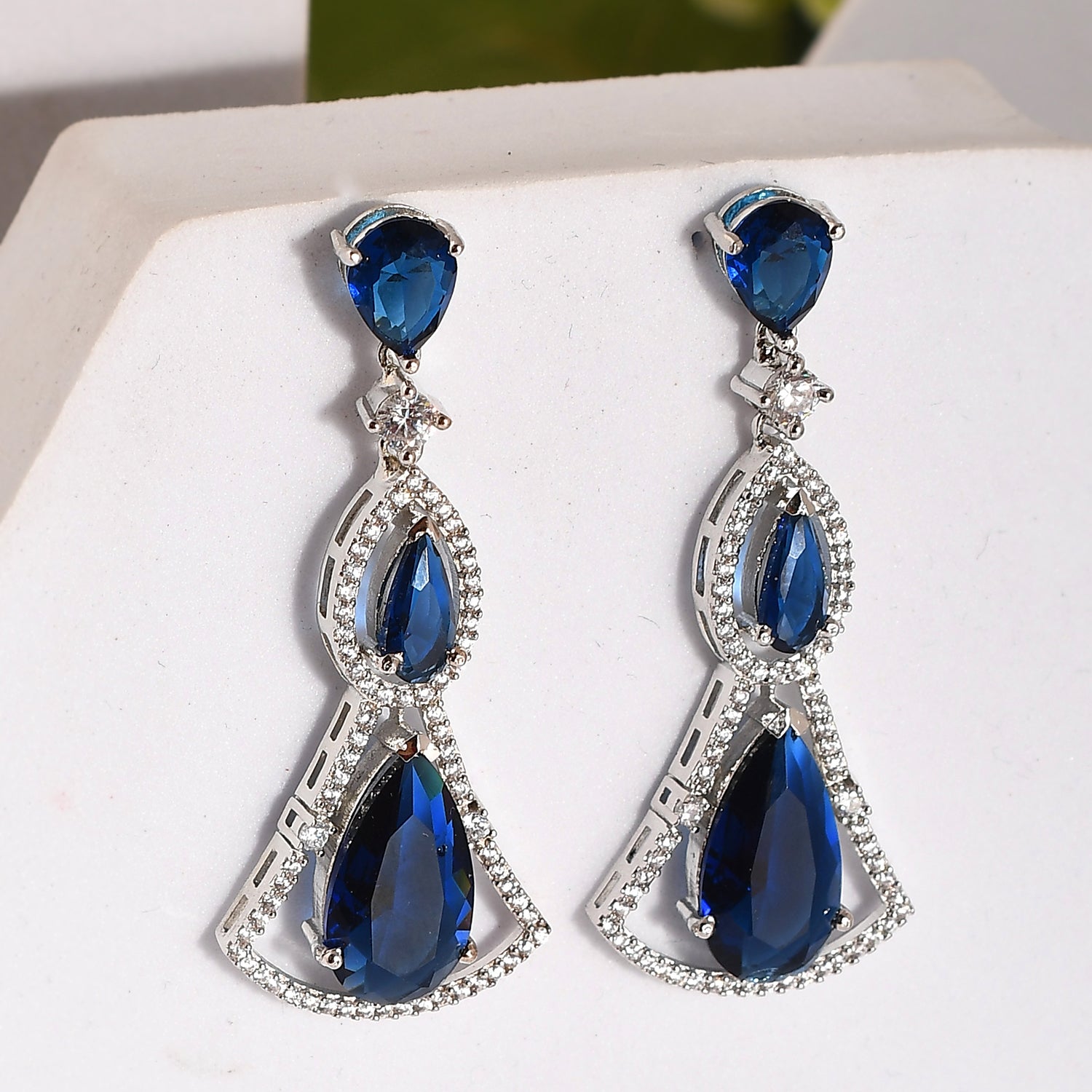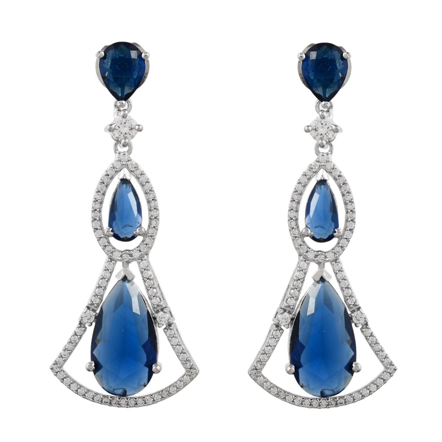 Crafted from high-quality brass and plated with lustrous white rhodium, these dangler earrings for women are designed to impress. Each earring features a deep blue teardrop gem, elegantly suspended within an openwork frame adorned with sparkling American diamonds. The upper part of the earrings showcases a smaller blue gem, adding a touch of sophistication. Whether you’re looking for party wear dangler earrings for women or a thoughtful gift for your wife, sister, or for Rakhi, these earrings are sure to delight.