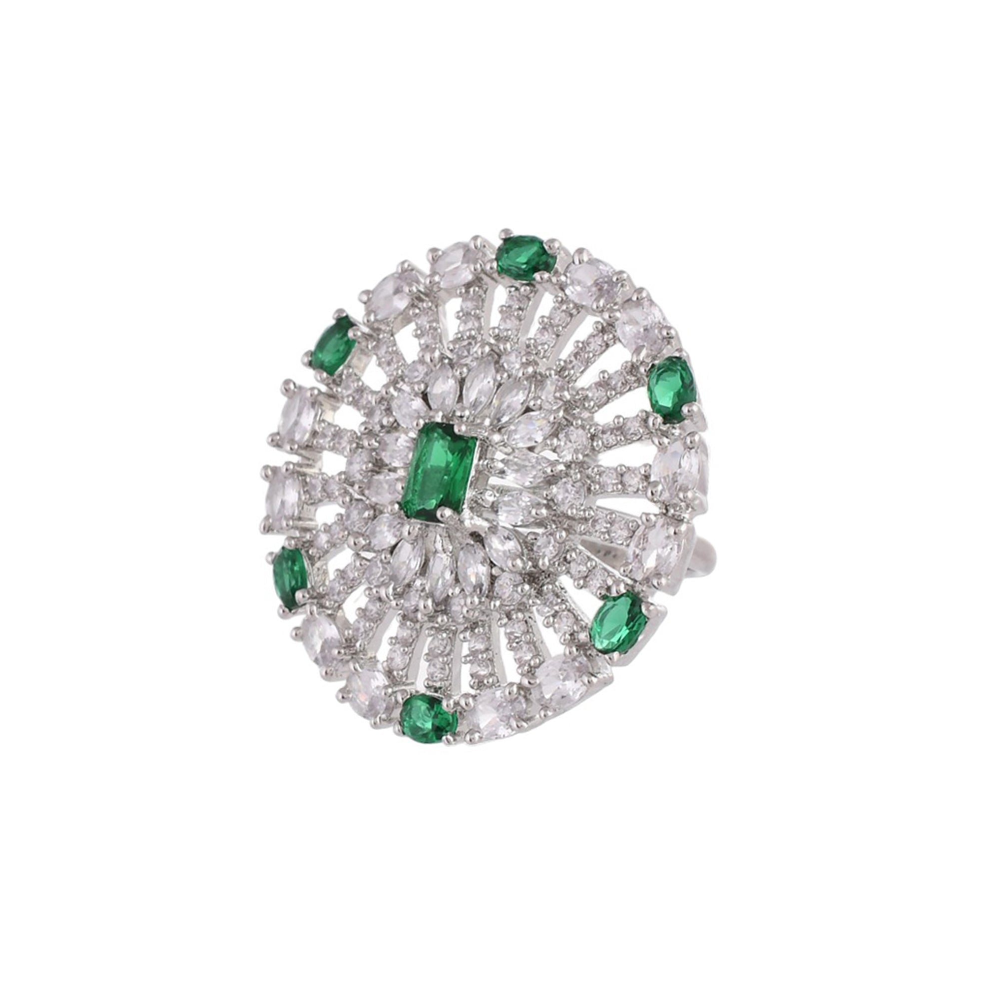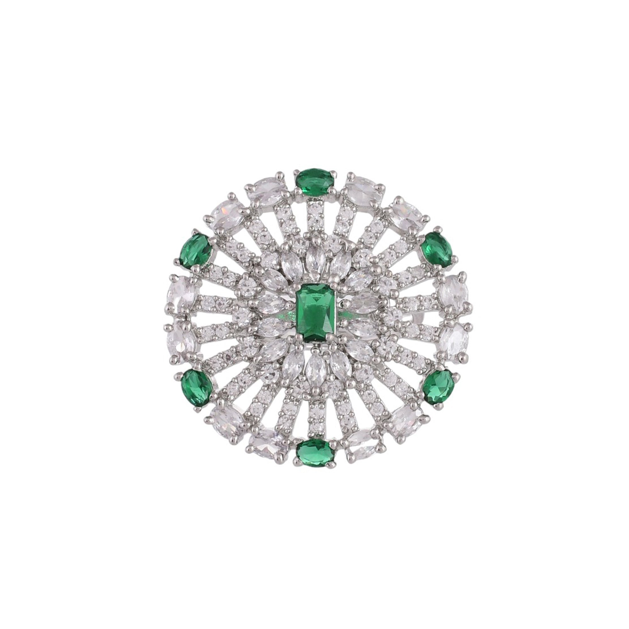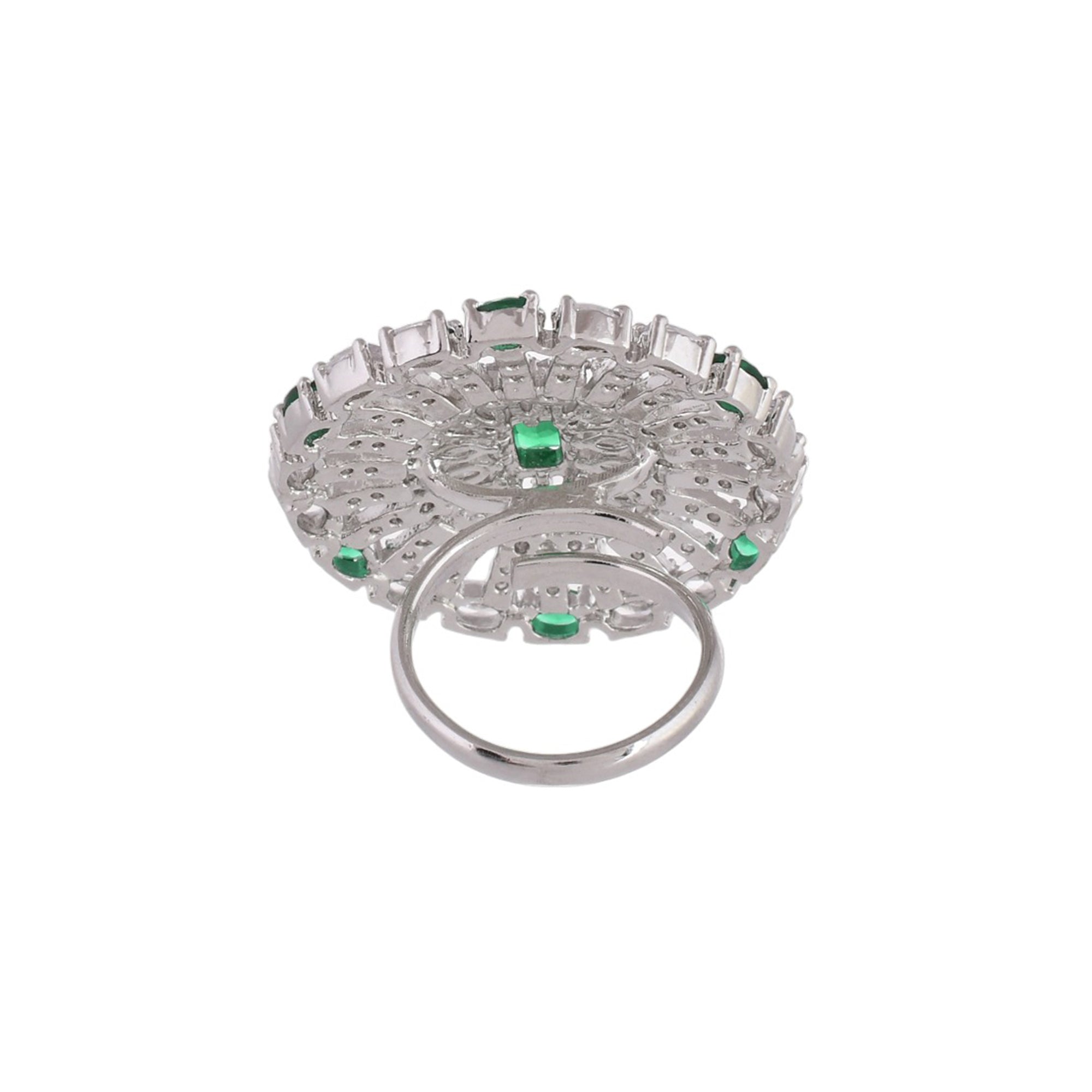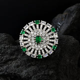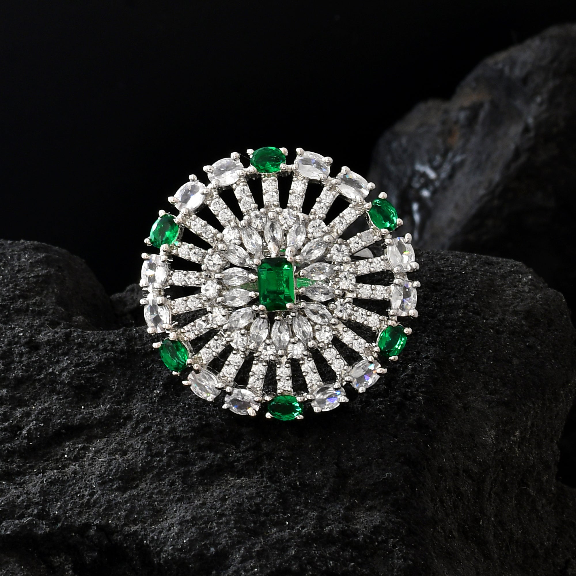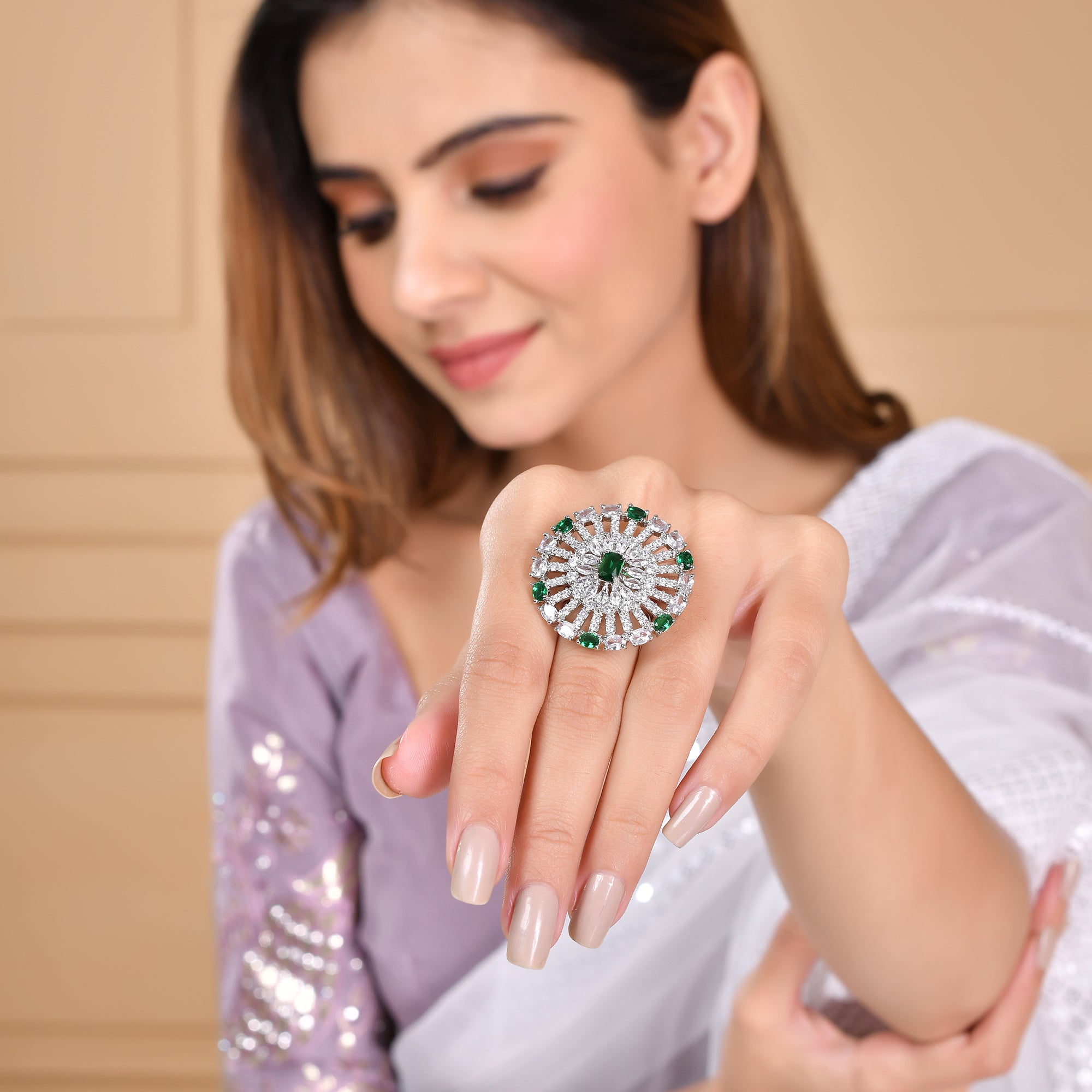 This ring is adorned with meticulously studded white and a few green CZ stones, creating a mesmerizing contrast reminiscent of an enchanted garden. Whether you're looking to add a touch of glamour to your everyday ensemble or make a statement at a special event, the Enchanted Emerald Elegance Ring is a symbol of opulence and elegance.