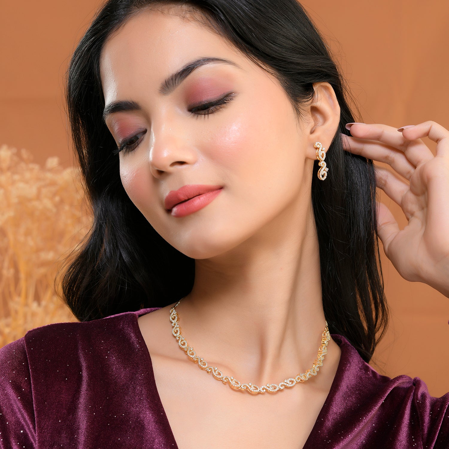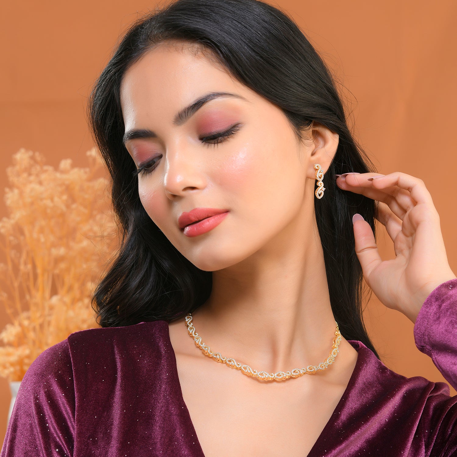 Elevate your elegance with this exquisite Voylla jewellery set for women, meticulously crafted from high-quality brass and luxuriously gold-plated for a radiant finish. This stunning necklace set for women features intricate links forming a delicate chain, each adorned with sparkling American Diamonds that shimmer with every movement. The matching earrings echo the necklace’s design, creating a cohesive and stylish statement jewellery set for women. The classic golden hues of this necklace for women make it a versatile addition to any wardrobe, perfect for both everyday wear and special occasions. Whether you’re looking for a thoughtful gift for your wife, a cherished present for your sister, a special Rakhi gift, or an indulgent treat for yourself, this Voylla necklace set for women is sure to be treasured and admired.