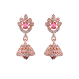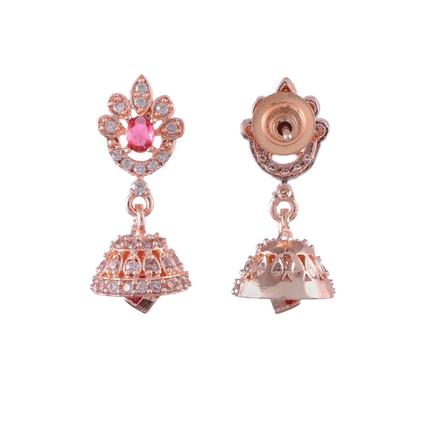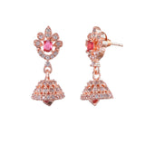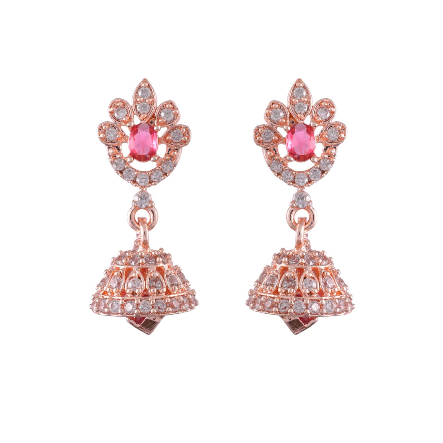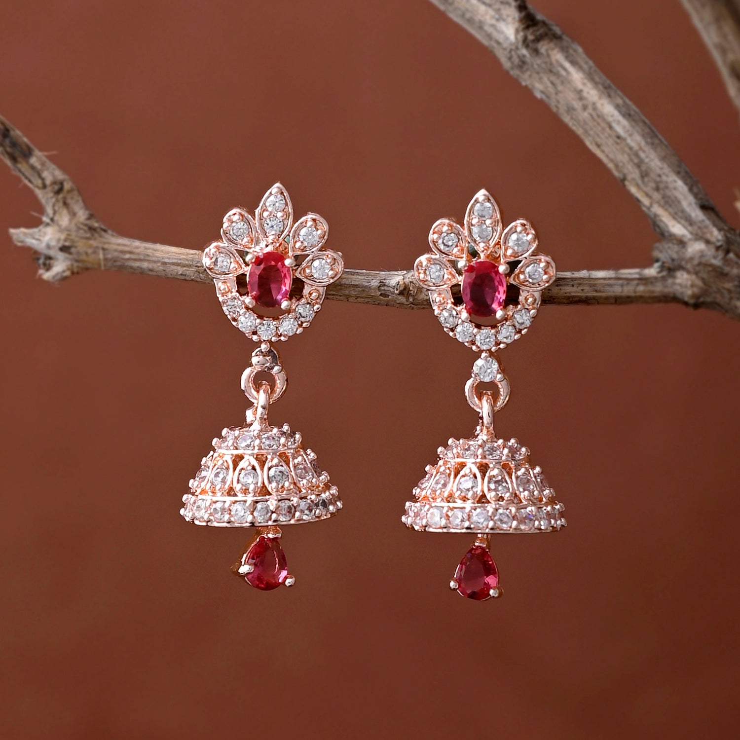 Sparkly drop earrings, perfect for casual wear. Made from brass and rose gold plated, the pair has been embellished with red and white CZ gemstones. Versatile and comfortable.