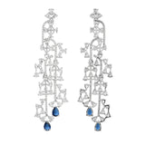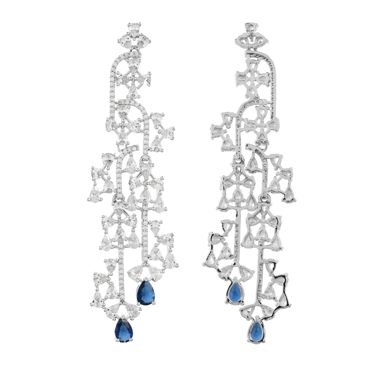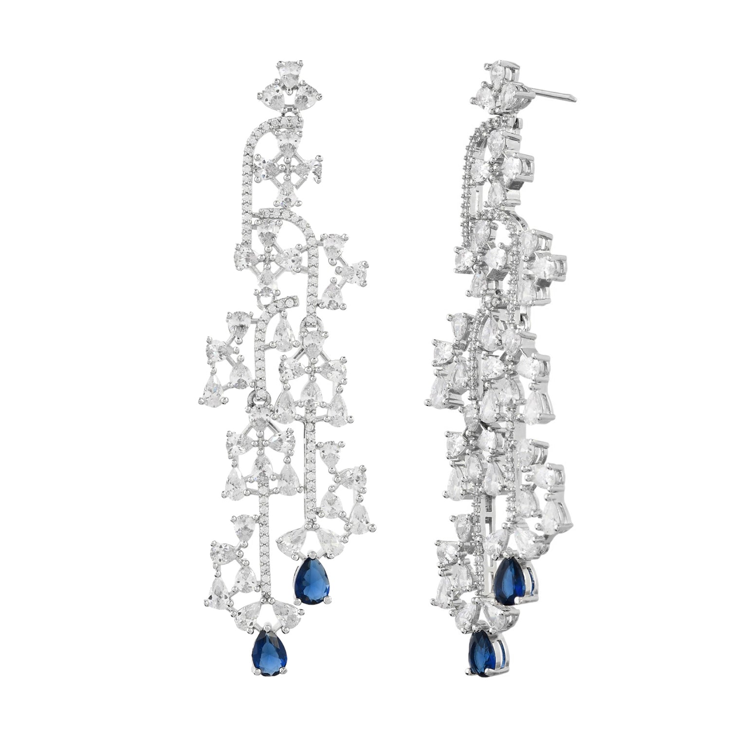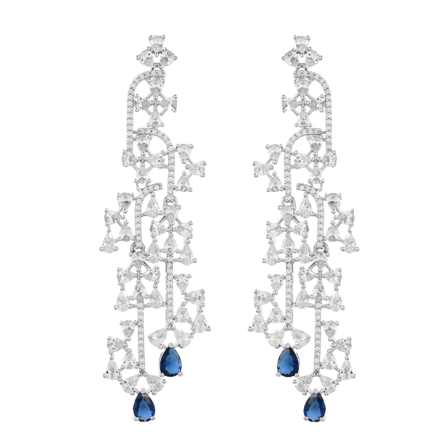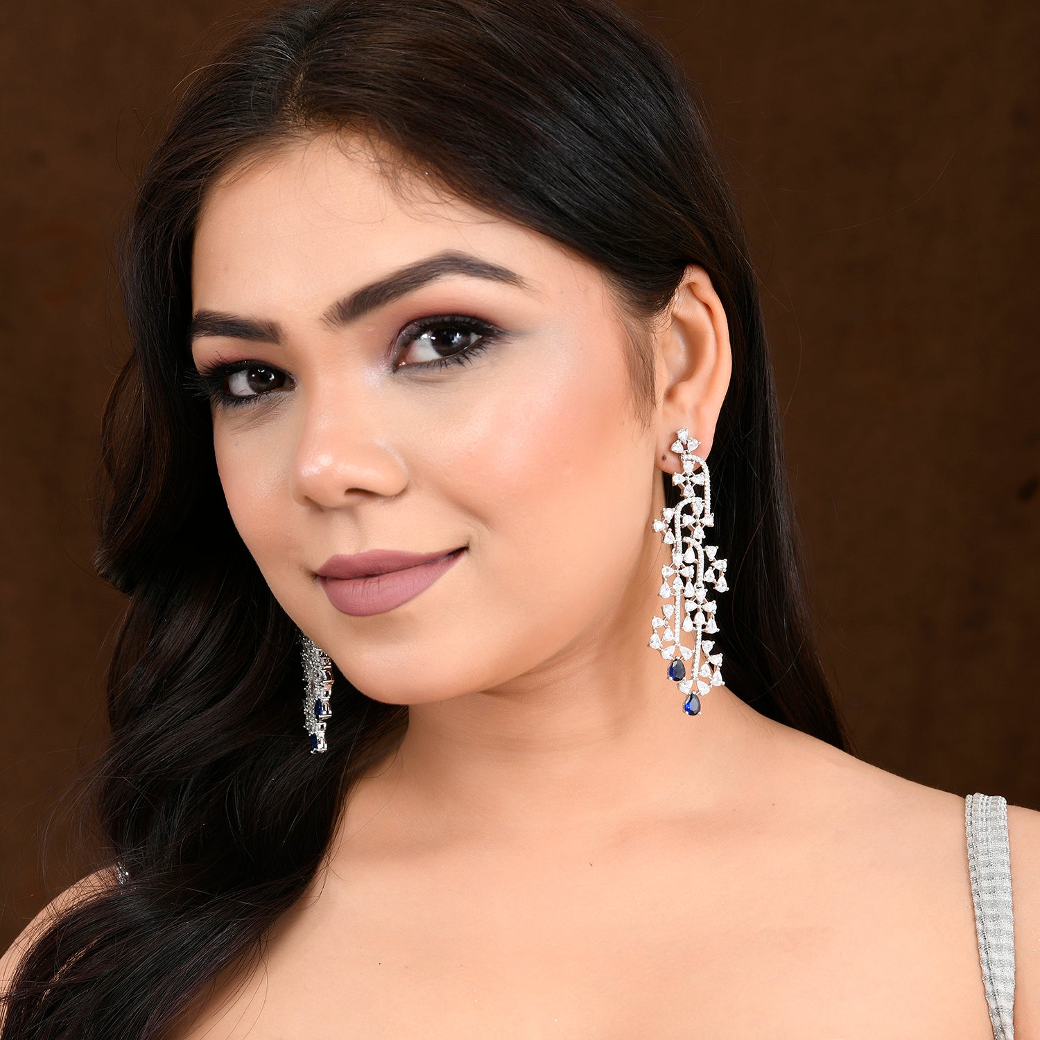 Crafted from high-quality brass and plated with lustrous White Rhodium, these exquisite Dangler Earrings for women are designed to captivate.The intricate design showcases multiple linked segments adorned with sparkling stones, culminating in a striking blue teardrop gemstone that adds a touch of regal charm. These Party wear dangler earrings for women are perfect for making a statement at any event, ensuring you stand out with every turn of your head. Ideal as Long Earrings for women, they beautifully frame the face and accentuate the neckline. Whether you’re looking for a Gift for wife, a Gift for sister, a Gift for Rakhi, or simply a Gift for self, these Voylla earrings for women are sure to enchant and delight.