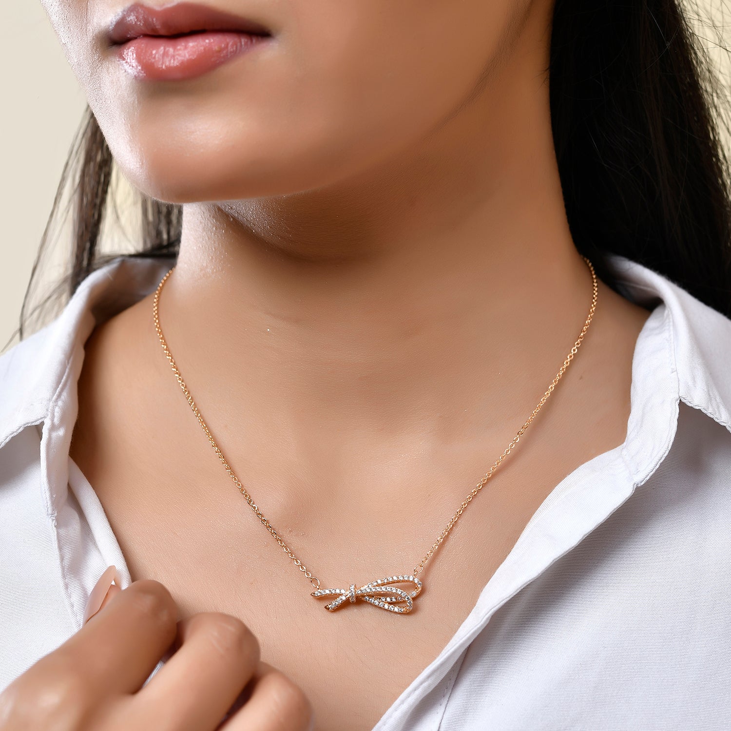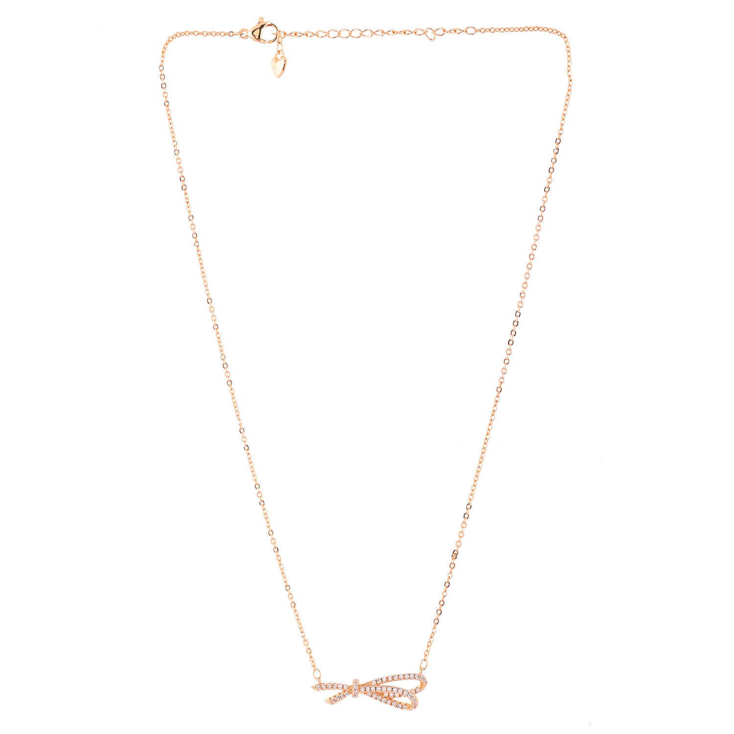 The Ribbon of Love Gold Necklace from the Sparkling Elegance collection is a masterpiece of delicate craftsmanship. Featuring a ribbon-shaped bow pendant adorned with sparkling American diamonds, this necklace embodies elegance and sophistication. Crafted from high-quality stainless steel with a luxurious gold plating, it ensures lasting beauty and durability. The intricate design showcases a warm gold hue that complements various outfits, making it a versatile accessory for both everyday wear and special occasions. Pair it with a chic evening dress for a glamorous look, or with a casual outfit for a touch of everyday elegance. Ideal for gifting, the Ribbon of Love Gold Necklace makes a thoughtful present for Valentine's Day, Diwali, Rakshabandhan, Christmas, New Year, and more. Whether for your girlfriend, wife, mother, sister, or friend, this timeless piece will be cherished for years to come.