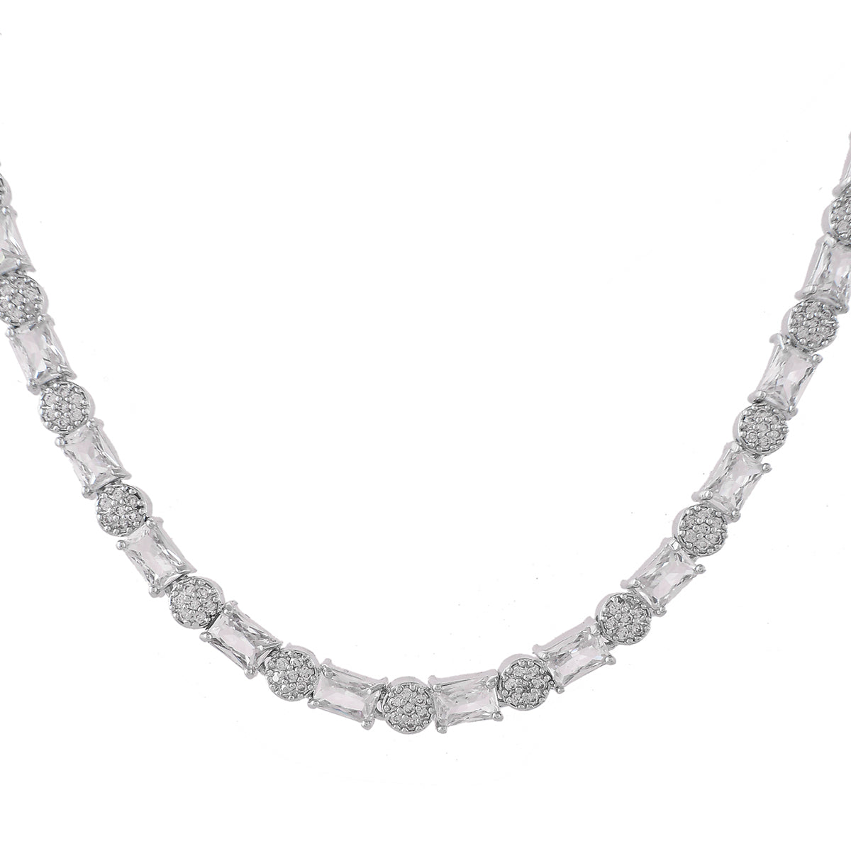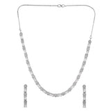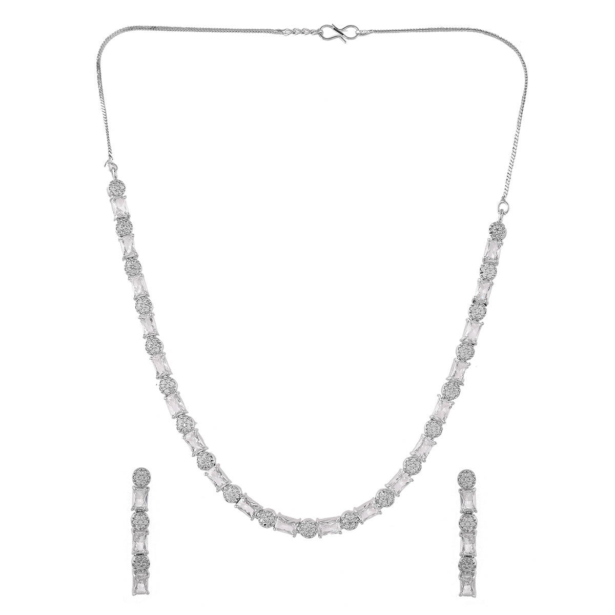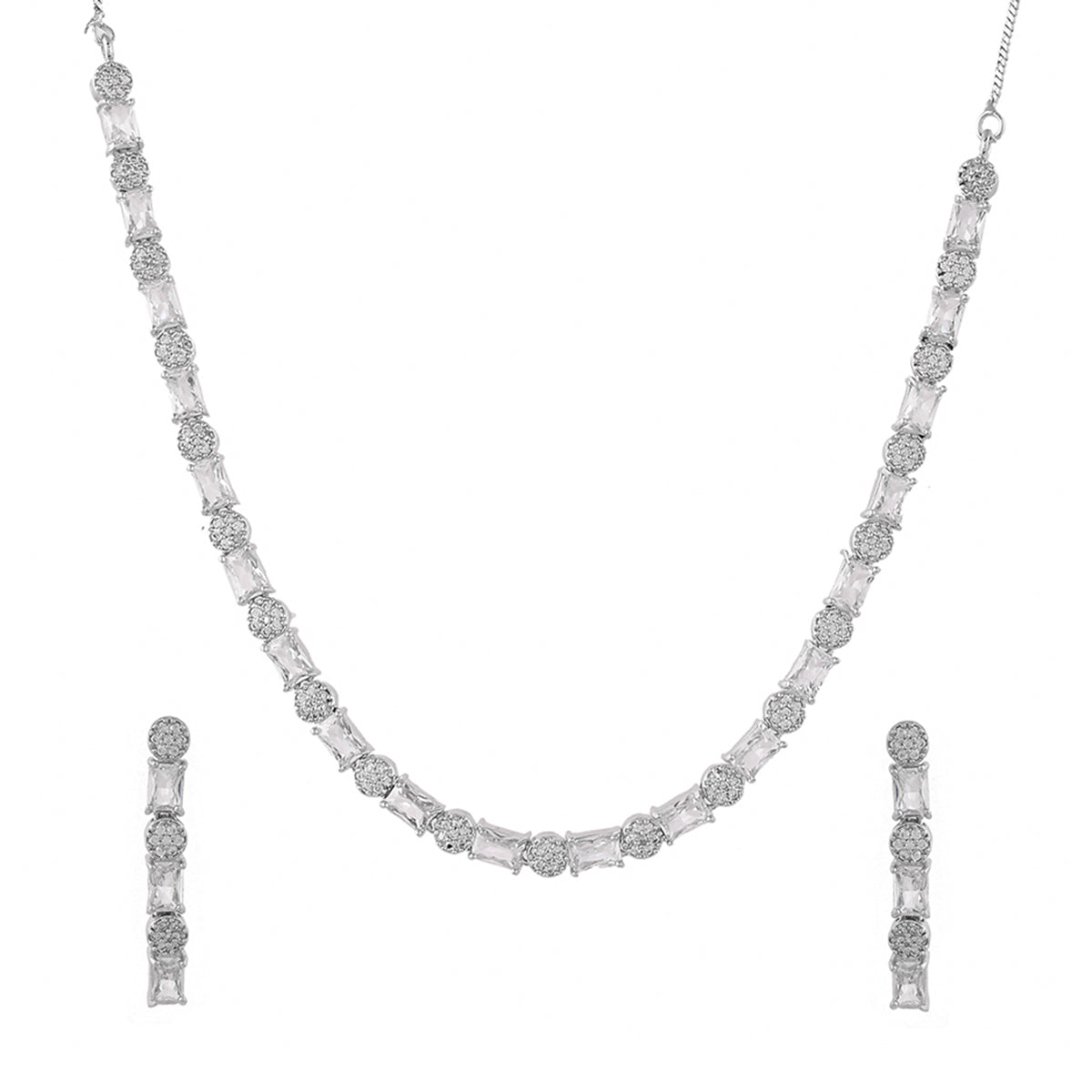 Brass jewellery set, embellished with CZ gems in classic round and rectangle cuts. Silver plated for added charm. Pair with formal attire.