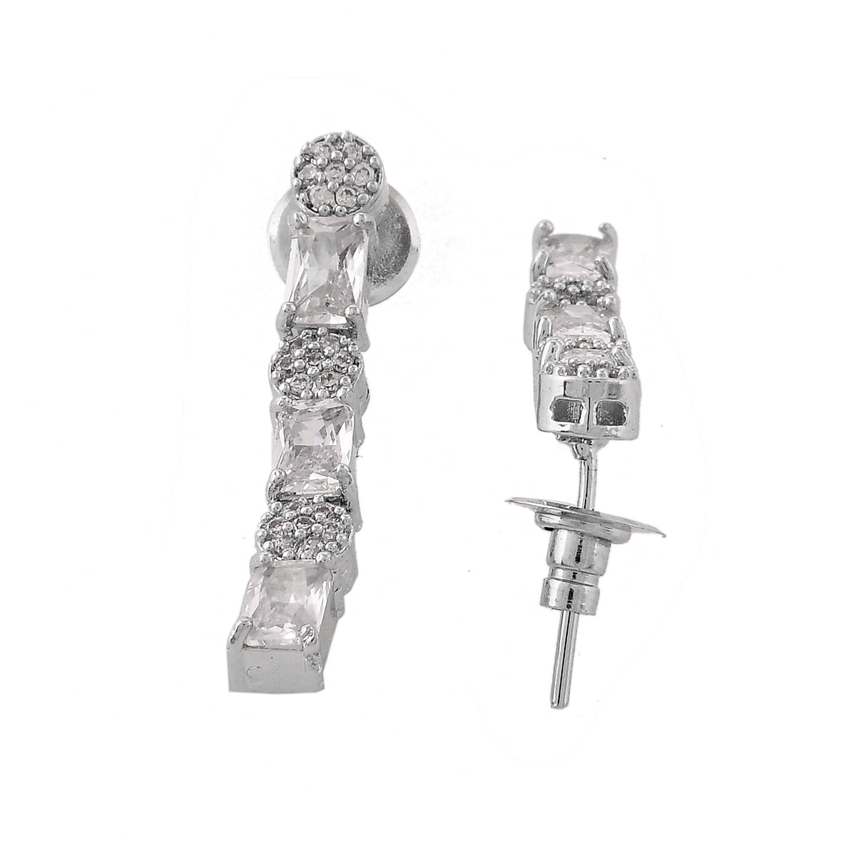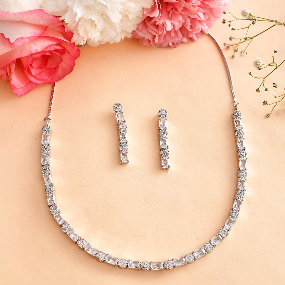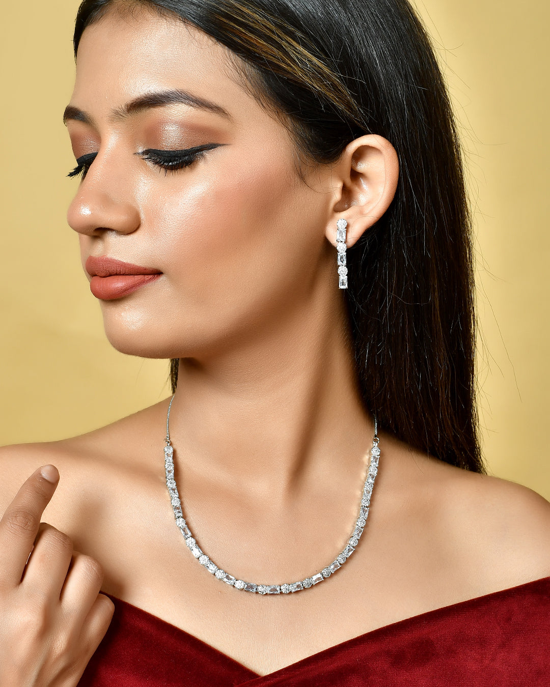 Brass jewellery set, embellished with CZ gems in classic round and rectangle cuts. Silver plated for added charm. Pair with formal attire.