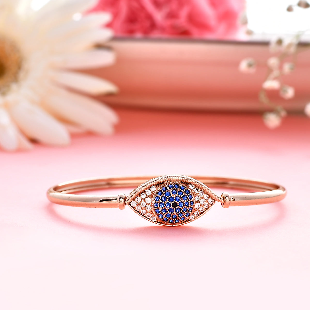An opulent and elegant evil eye bracelet made from brass and adorned with round cut blue and white zirconia gemstones in a classic cluster setting. Rose gold plating adds to the charm of this versatile adjustable bracelet.