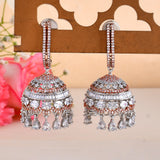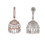 Lovely jhumki earrings fashioned out of brass and two tone plated. Featuring a high polish finish and embellished with round cut CZ gems in a classic cluster setting. Pair with ethnic attire.