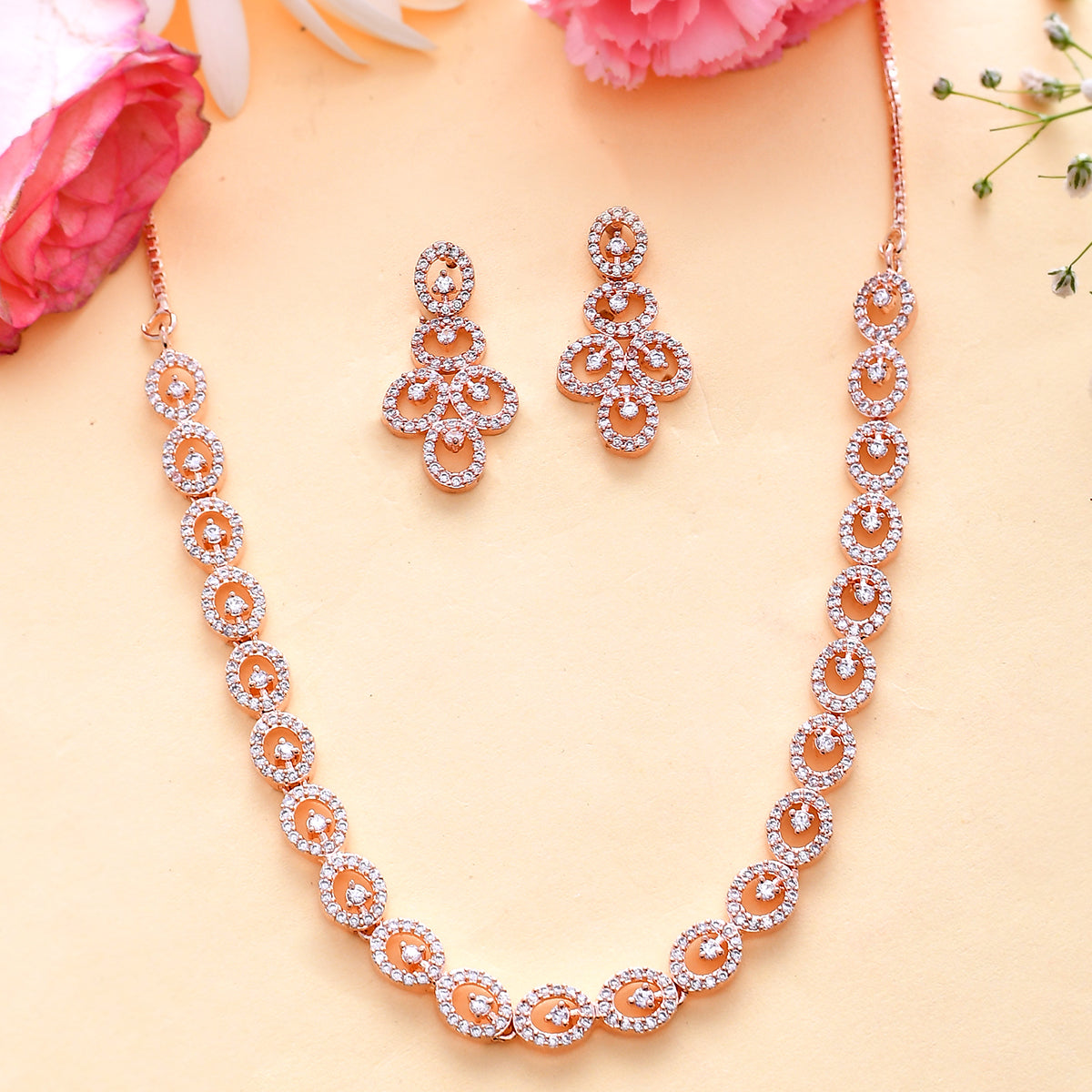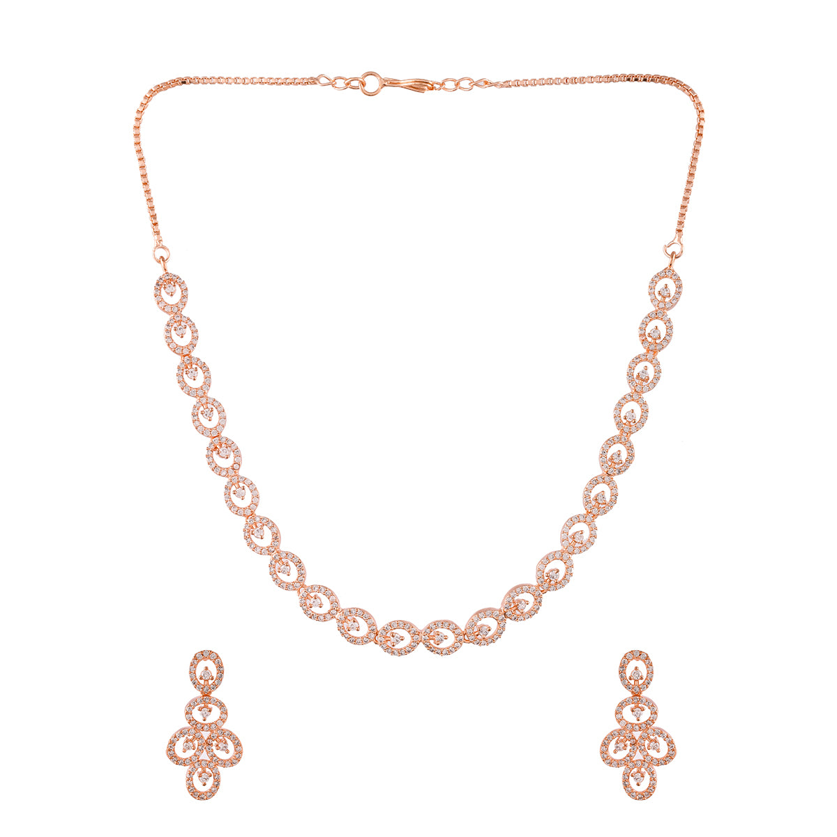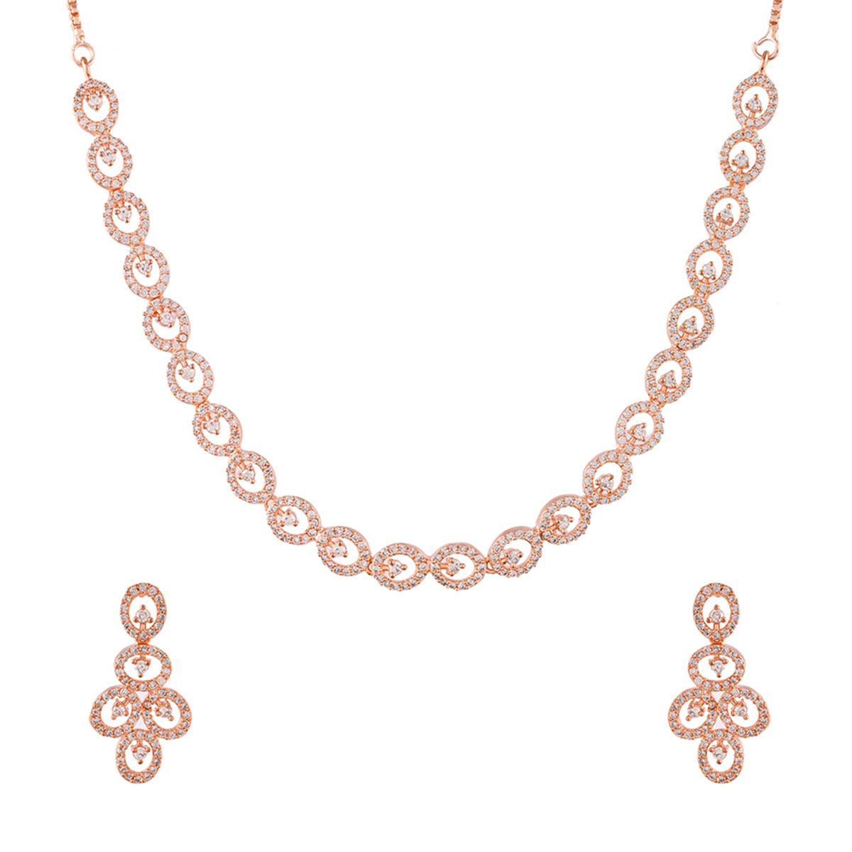 Round cut zirconia gemstones adorned brass jewellery set, designed for style and comfort. Rose gold plated and a perfect match for formal and semi-formal outfits.