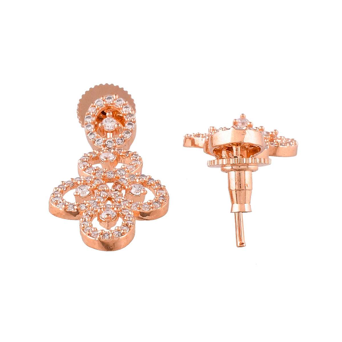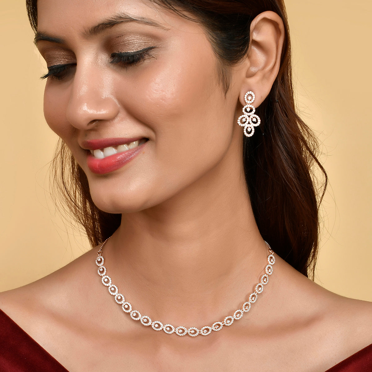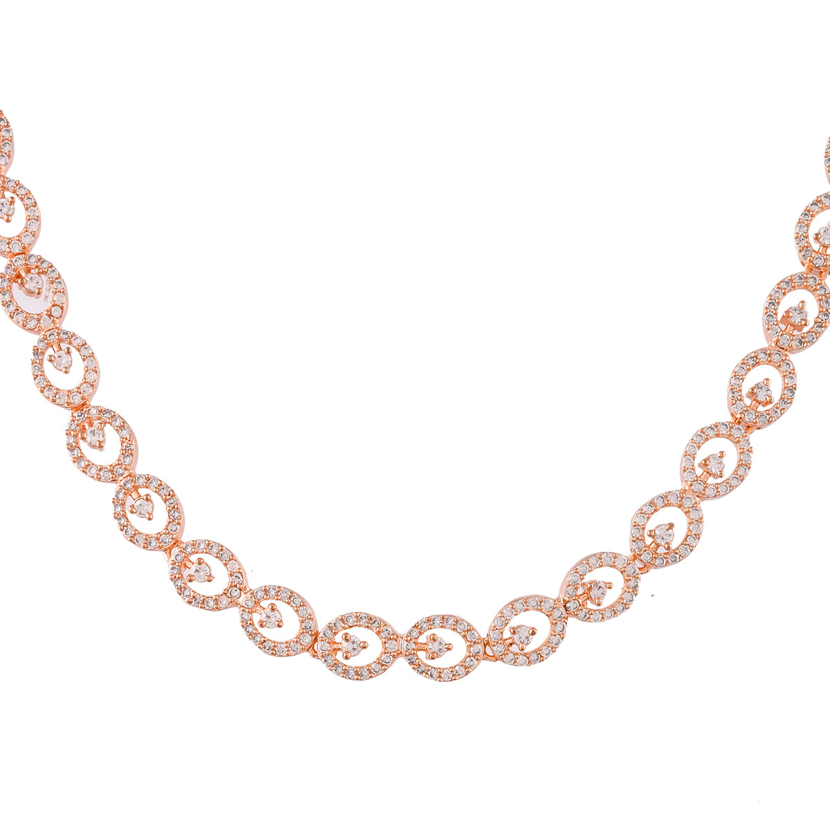 Round cut zirconia gemstones adorned brass jewellery set, designed for style and comfort. Rose gold plated and a perfect match for formal and semi-formal outfits.