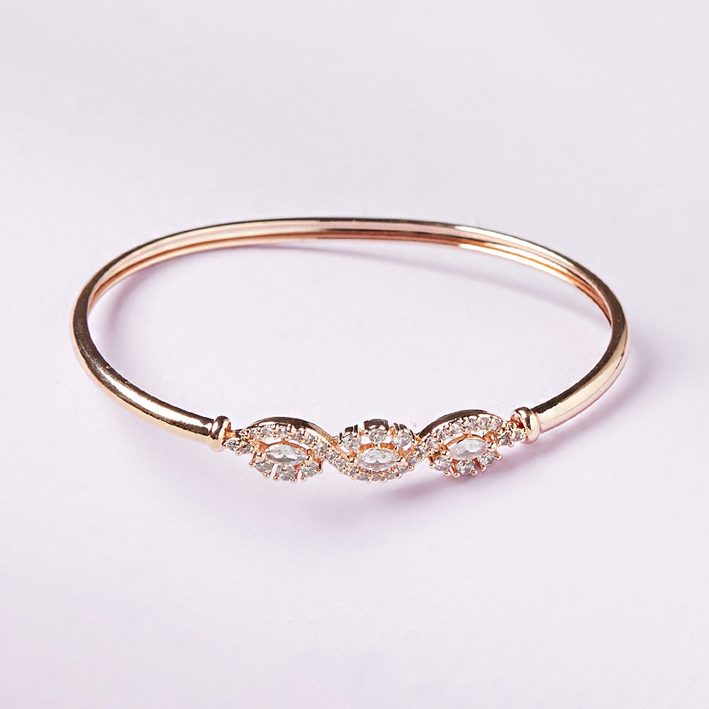 Classic round bracelet for women. Fashioned out of brass and rose gold plated. CZ gems adorned and good for formal looks.