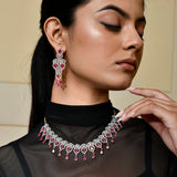 Elevate your elegance with this stunning necklace set from Voylla, crafted meticulously from high-quality brass and adorned with a luxurious gold plating. This exquisite set features a beautifully designed necklace and matching earrings, each embellished with sparkling American diamonds and vibrant pink teardrop stones. The intricate design showcases a harmonious blend of traditional and contemporary styles, making it perfect for festive occasions, weddings, parties, and special celebrations like Holi, Diwali, Rakshabandhan, and Christmas. This set is an ideal gift for women, whether it's for your sister, girlfriend, wife, mother, or as a thoughtful Valentine's or New Year gift. Make a statement and add a touch of glamour to your ensemble with this versatile and timeless piece.