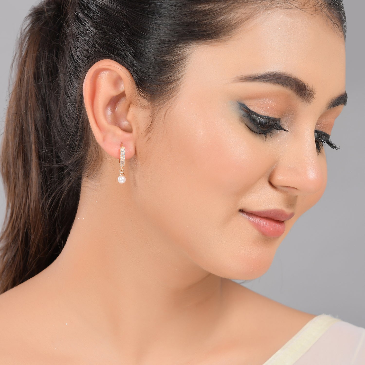 White pearls and zirconia gemstones adorned casual half-hoop earrings. Made from brass and silver plated. Pair with any of your favourite outfits.
