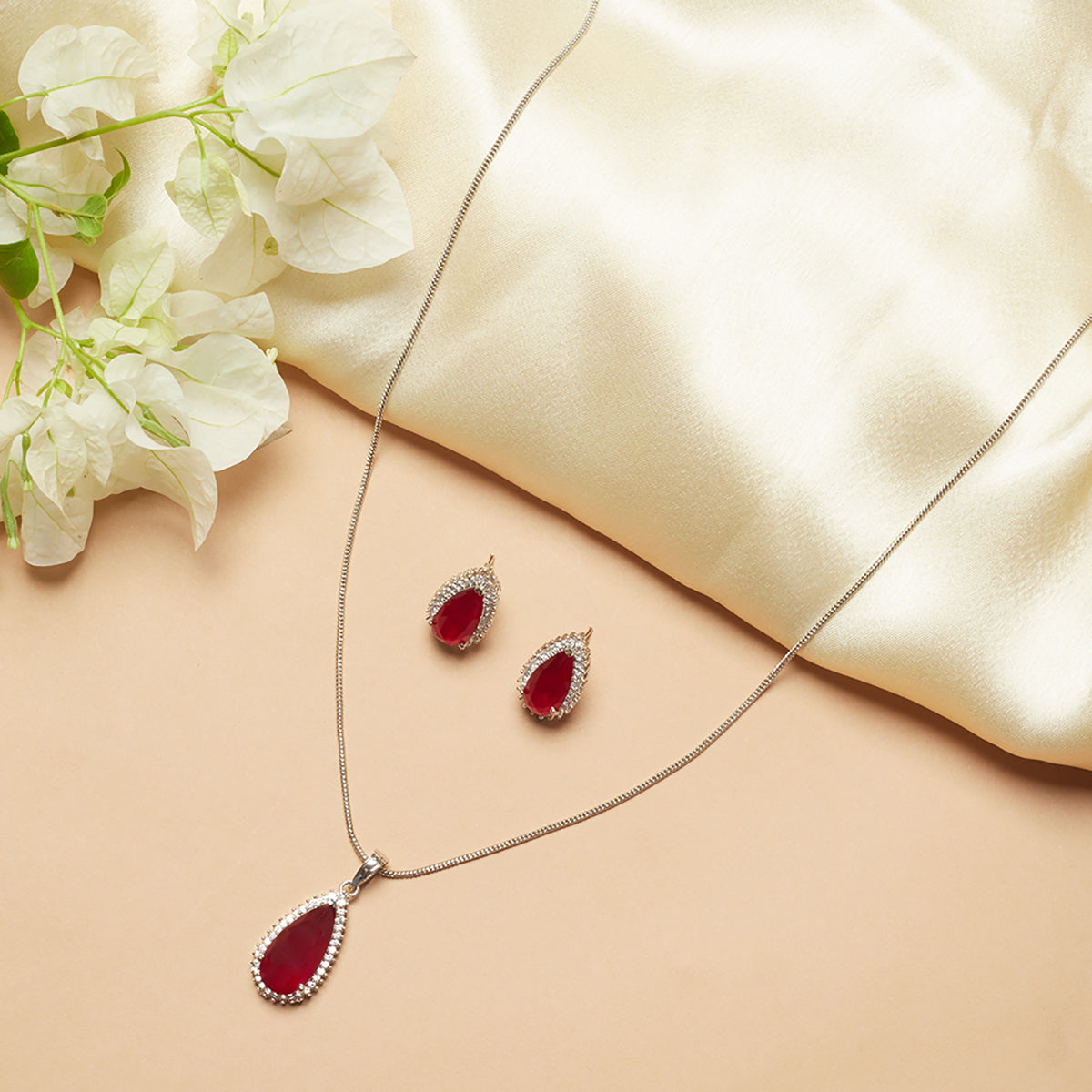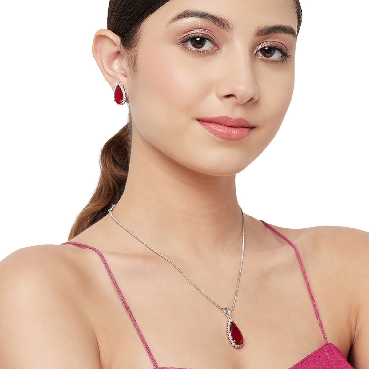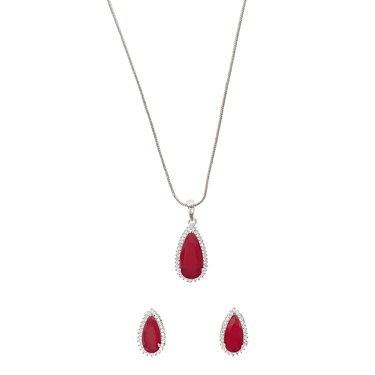 This beautiful silver tone pendant set is for you to enhance your appearance. Beautifully crafted with CZ Black stone in the center. It is the perfect match for your wedding and special occasion attire.
