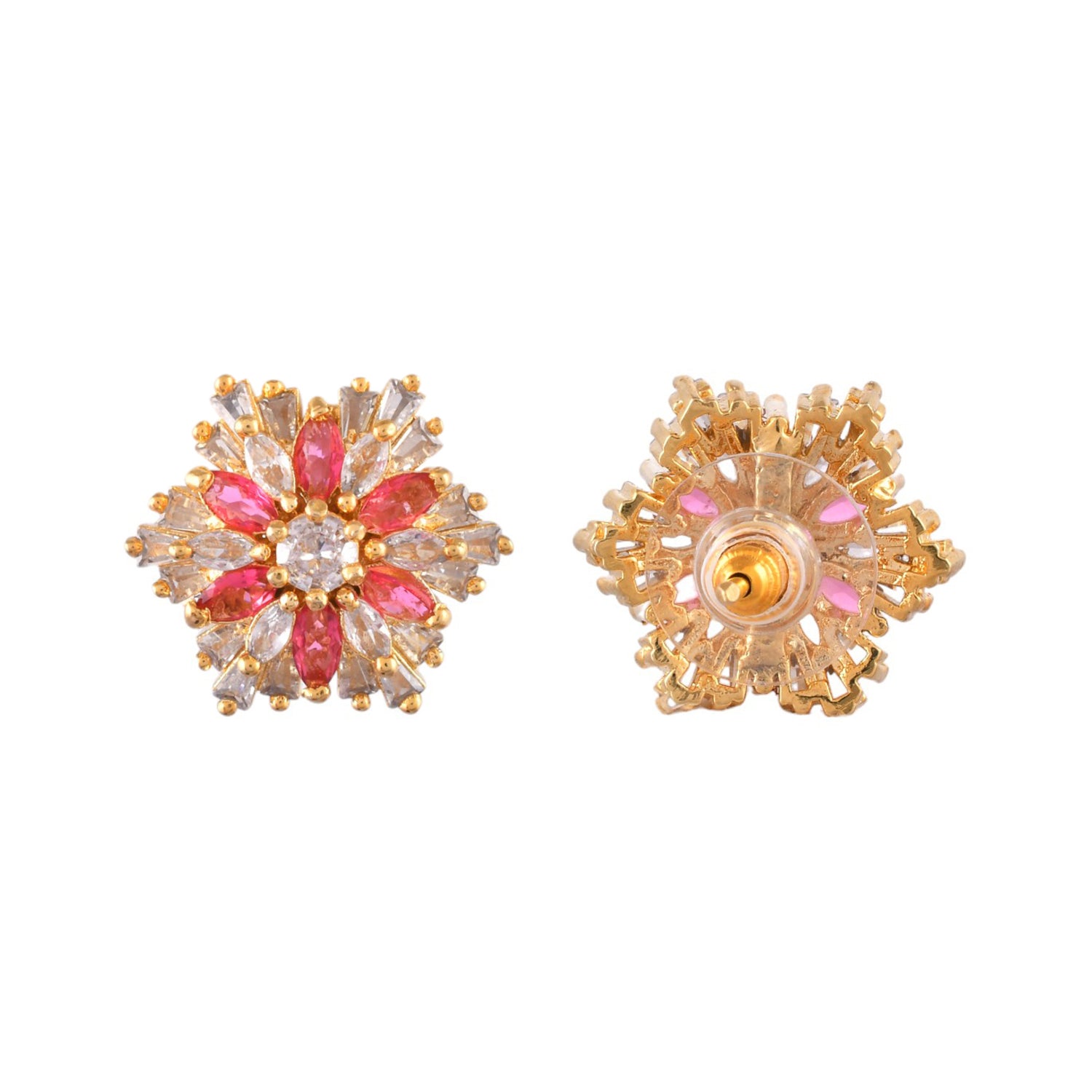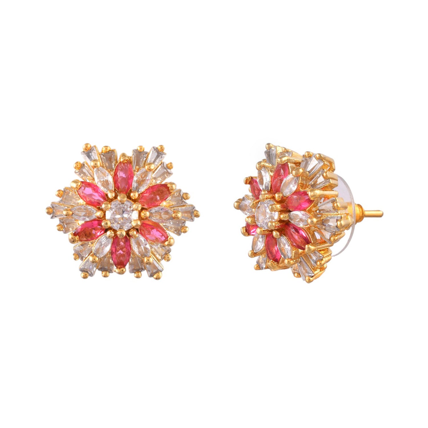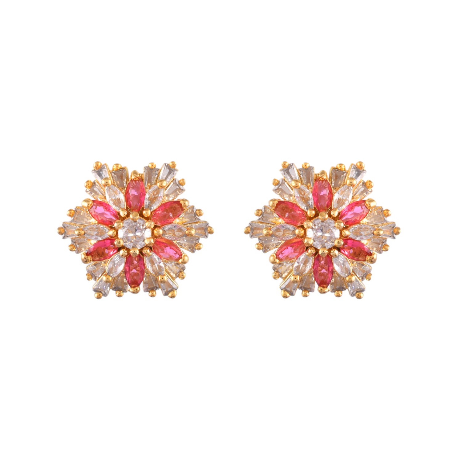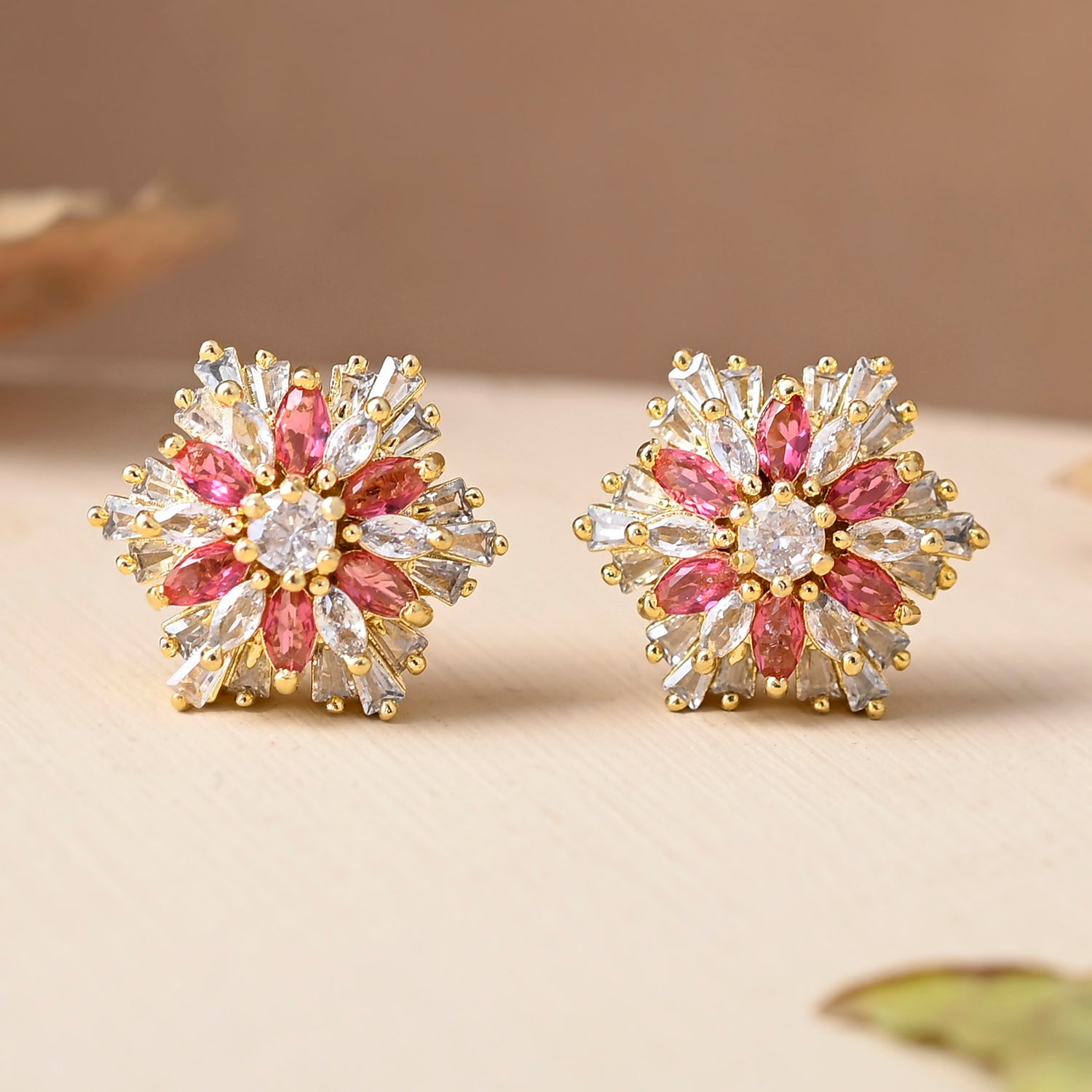 Crafted to perfection, these earrings feature a mesmerizing stylized floral design adorned with sparkling cubic zirconia stones, exuding elegance and grace. The rich dark pink hue adds a touch of sophistication, while the gold plating lends a luxurious finish. Perfect for special occasions