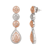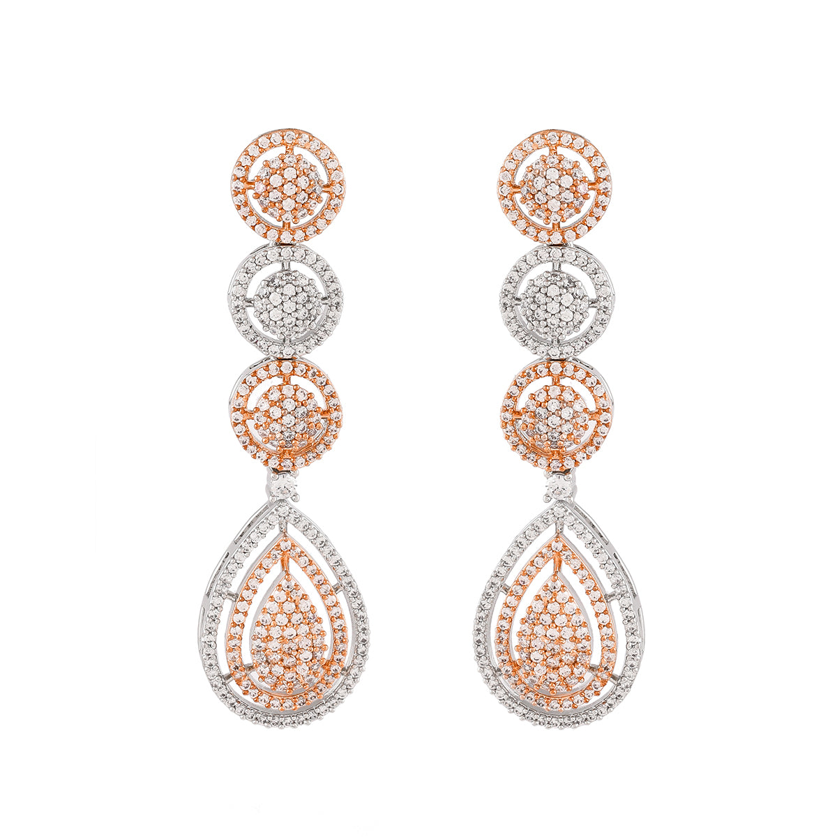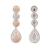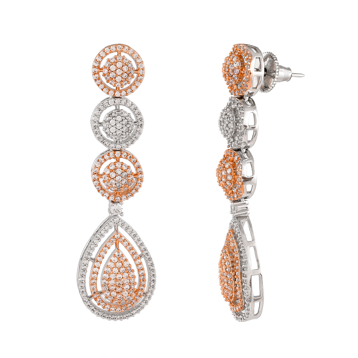 Luxurious cocktail dangler earrings made from brass and two tone plated. Adorned with teardrop cut zirconia gemstones and featuring a high polish finish. Pair with formal attire of all kinds.