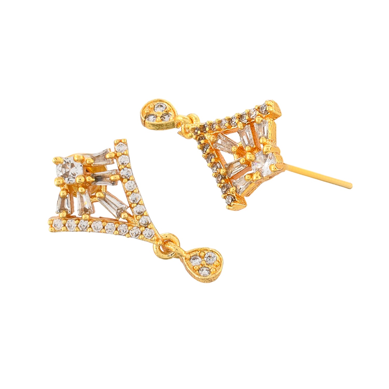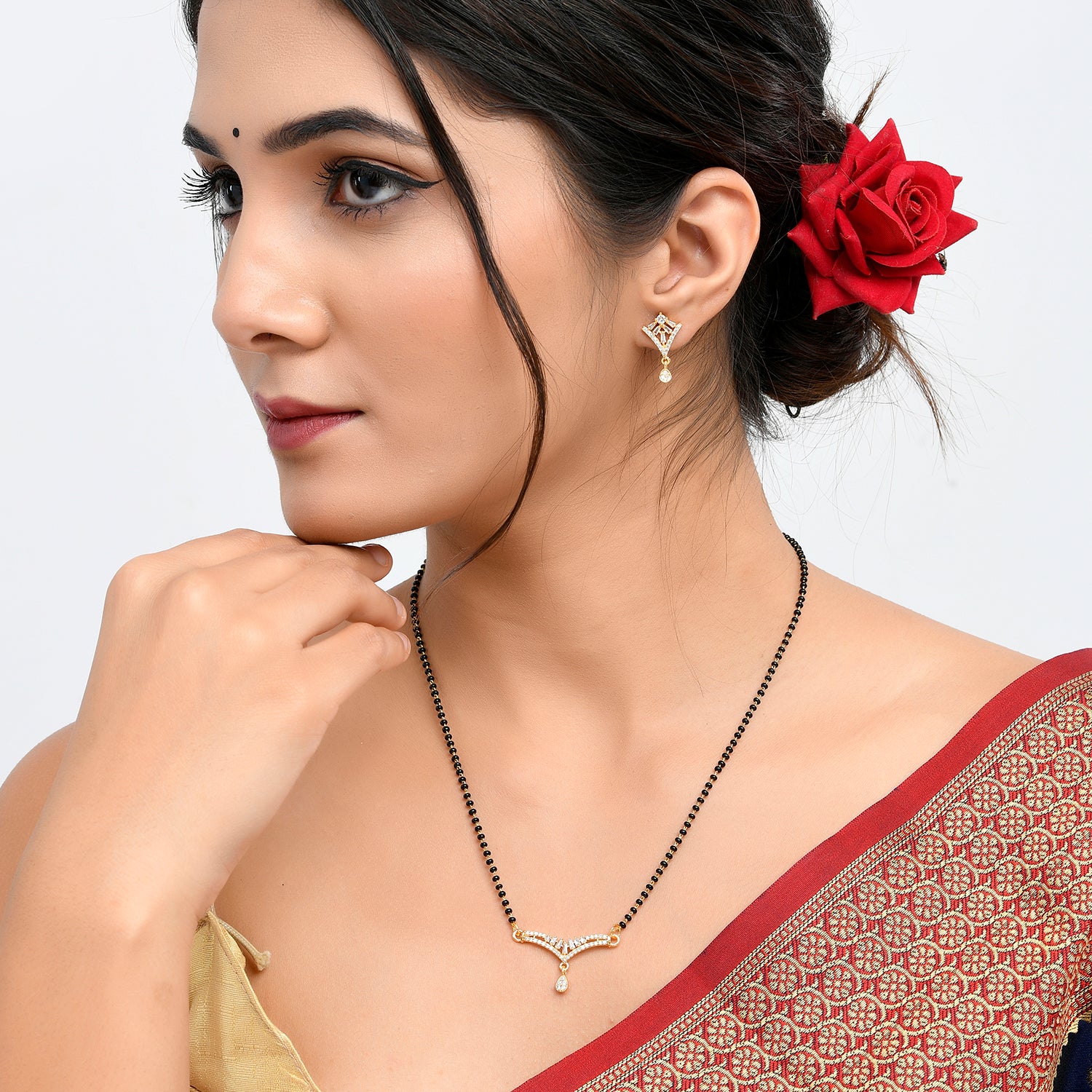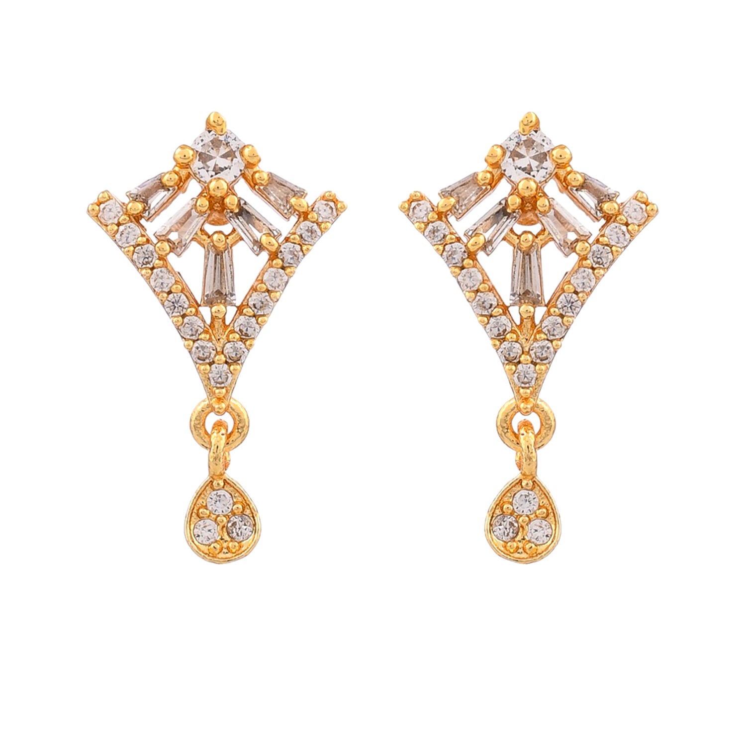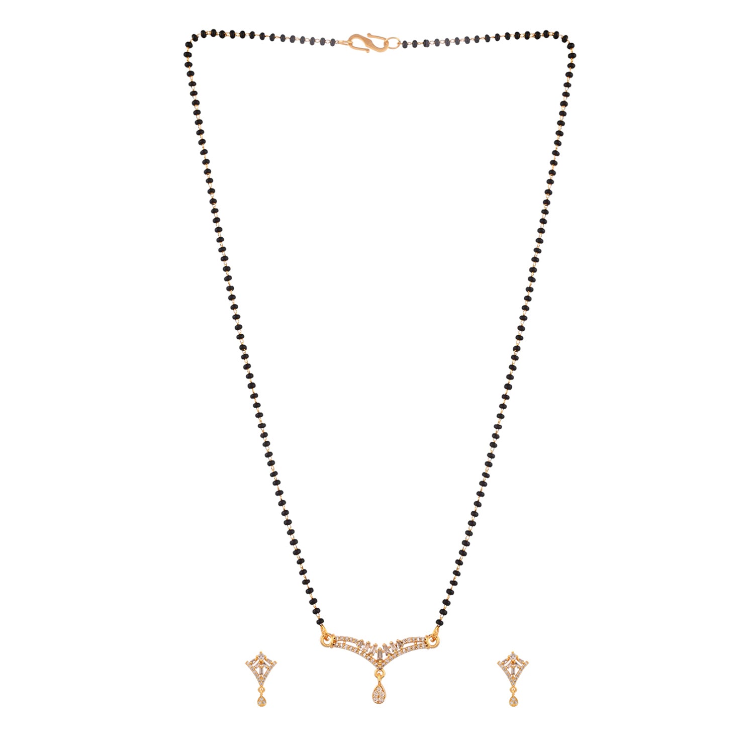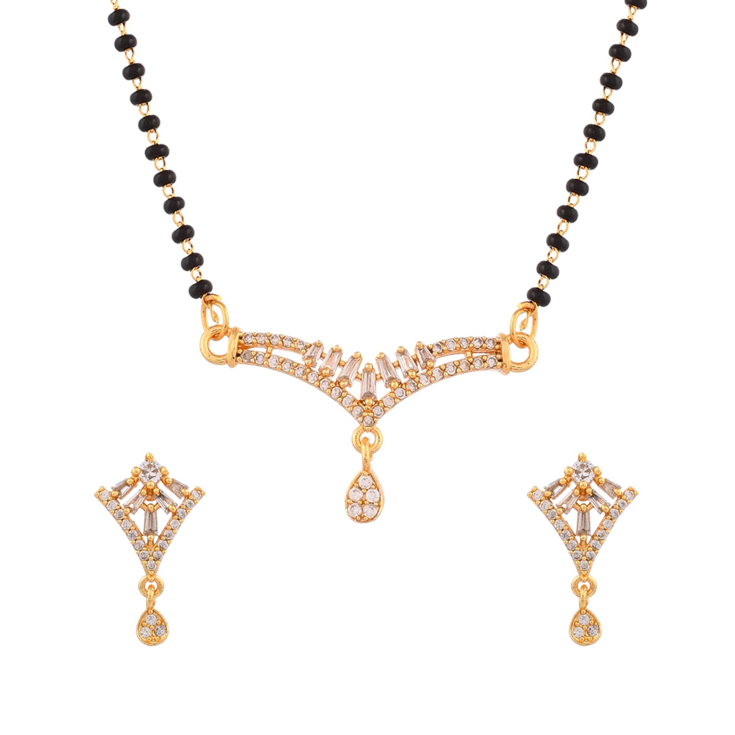 Teardrop cut zirconia gemstones adorned mangalsutra and stud earrings set. Made from brass and gold plated. Lightweight and versatile.