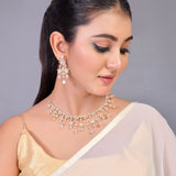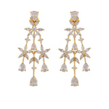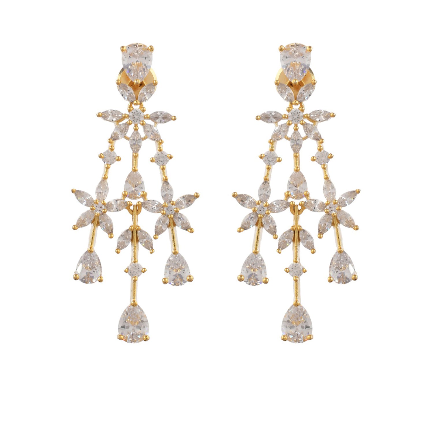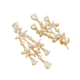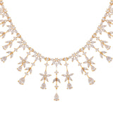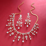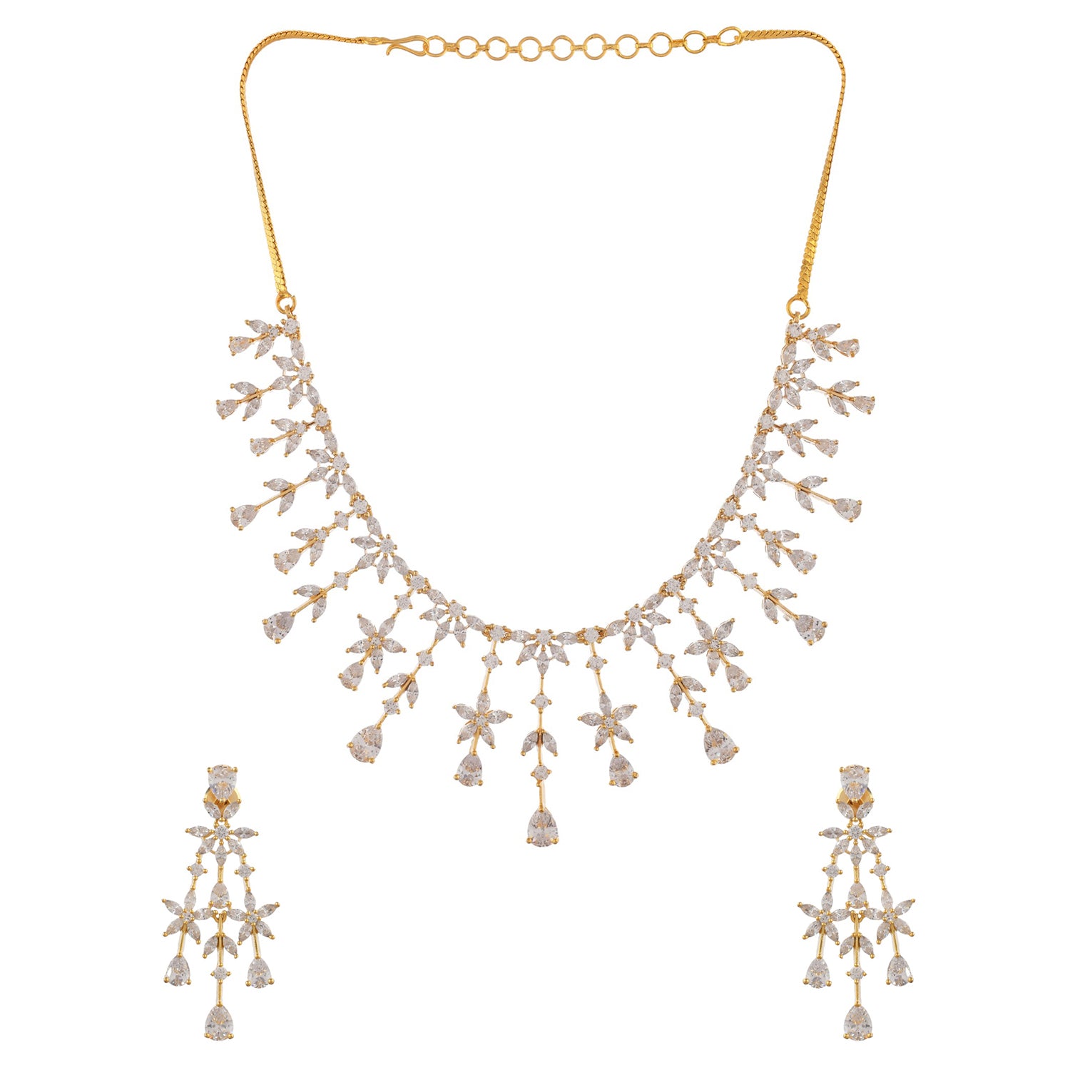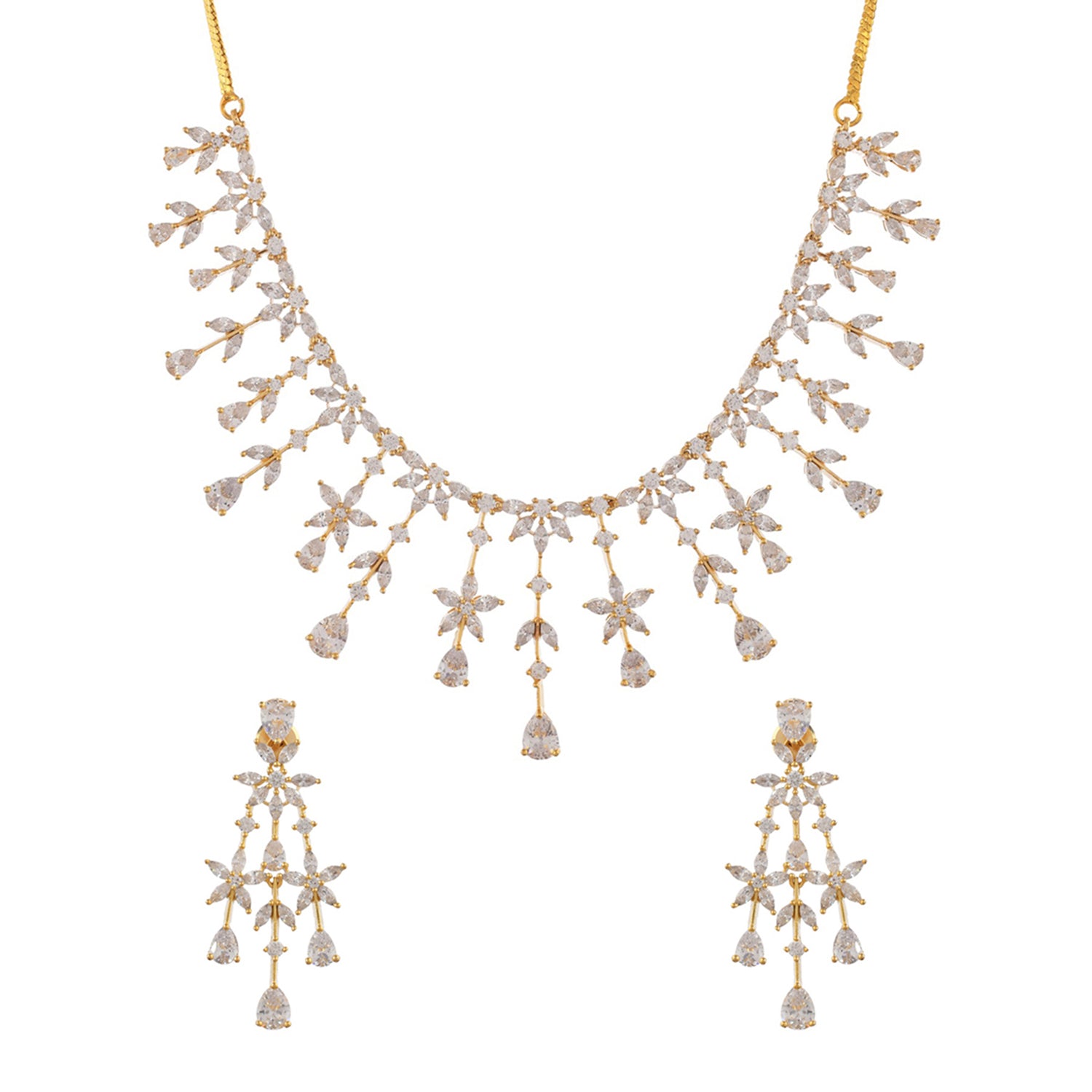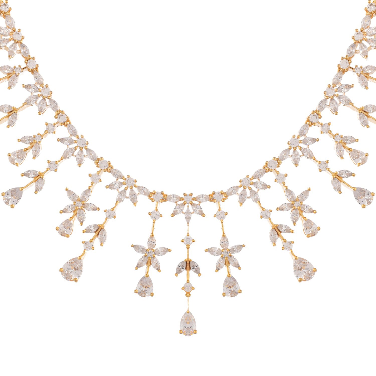 A luxurious jewellery set made from brass and embellished with lustrous teardrop cut white cubic zirconia gemstones, in a classic cluster setting. The floral motifs necklace and drop earrings have been given a gold plating. Pair with formal attire.