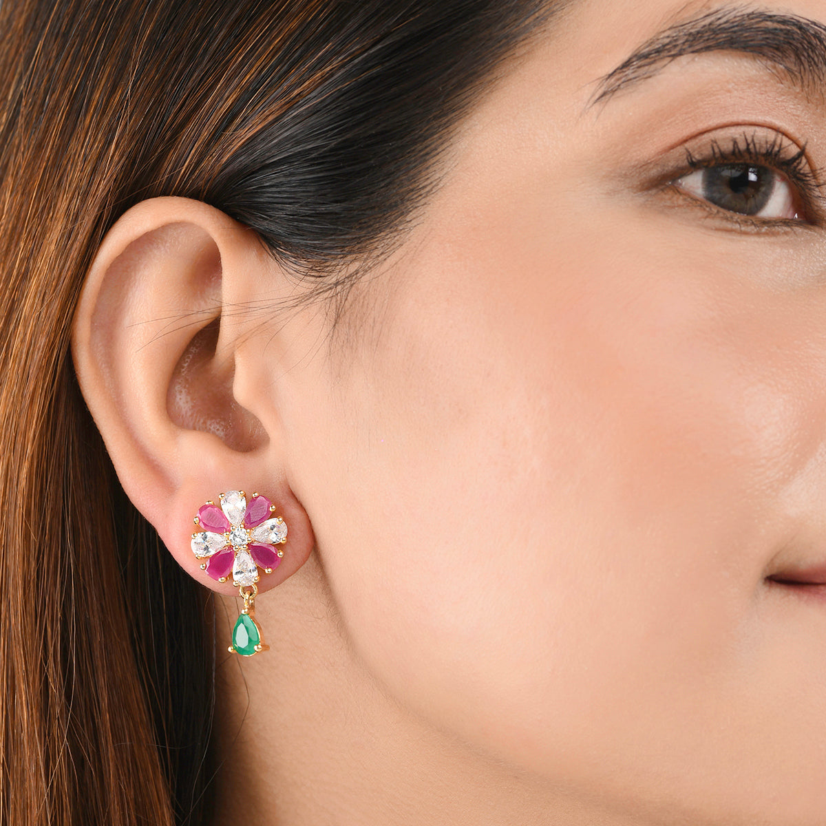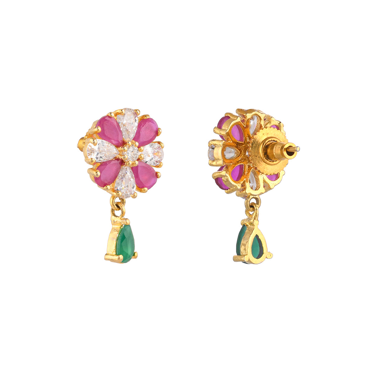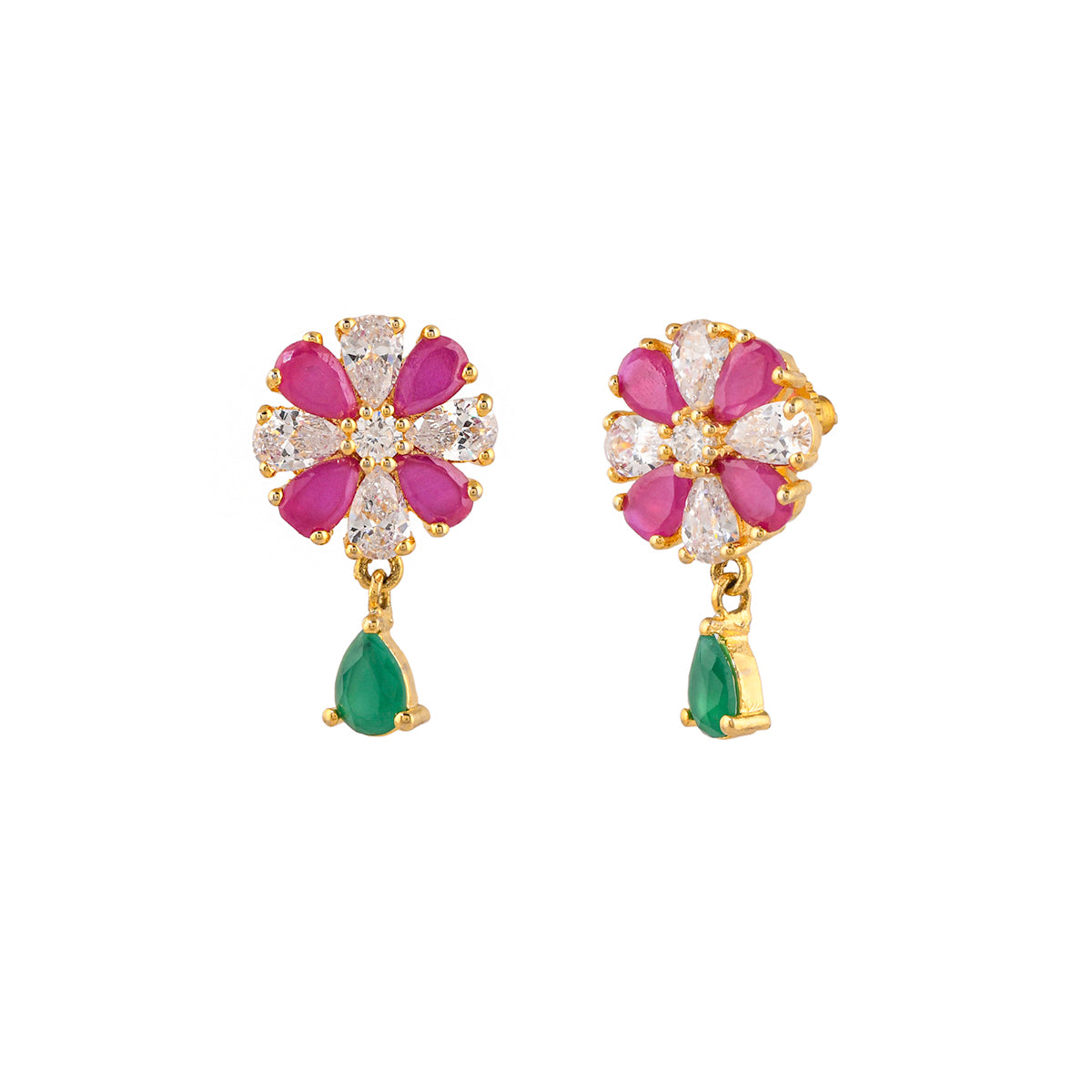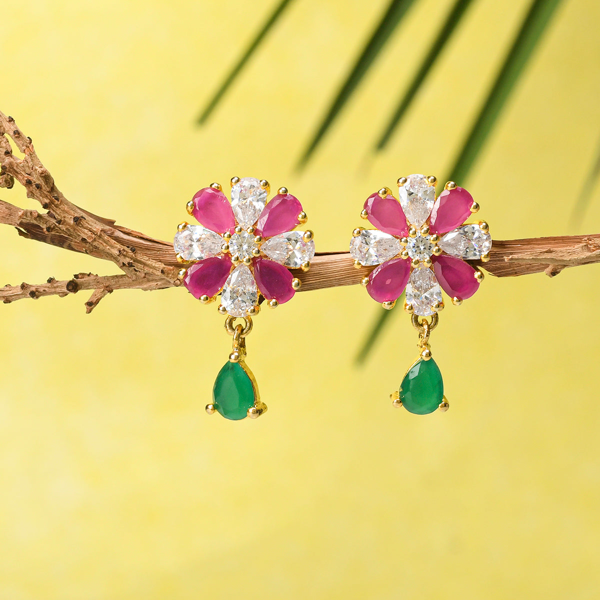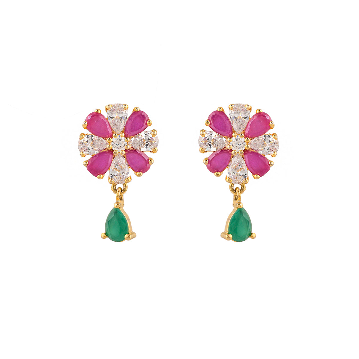 Embellished with teardrop cut zirconia gemstones, arranged in a floral pattern, these earrings have been fashioned out of brass. Yellow gold plated for added charm, the earrings will look splendid with a summer dress or designer saree.
