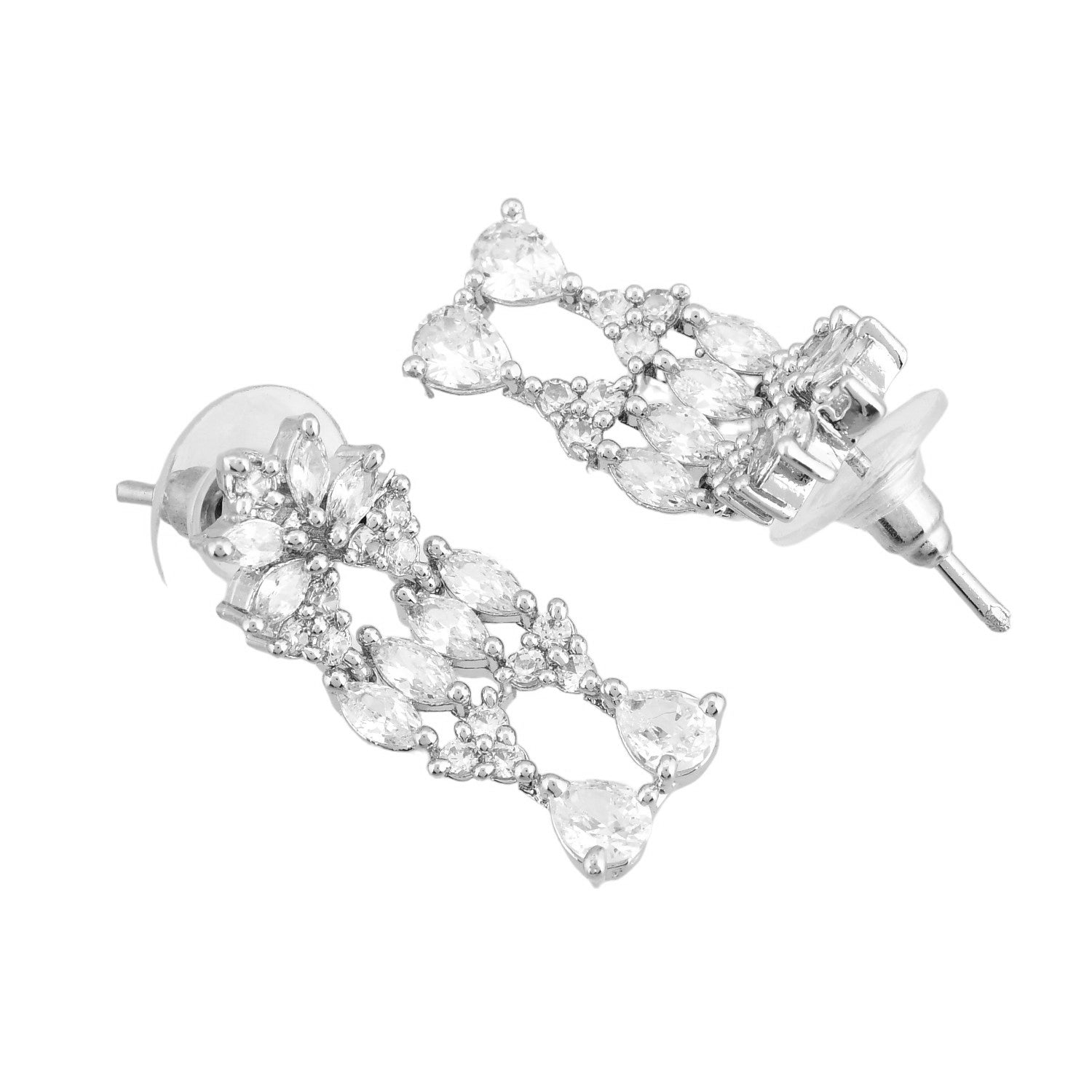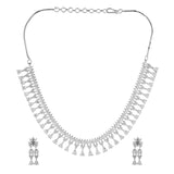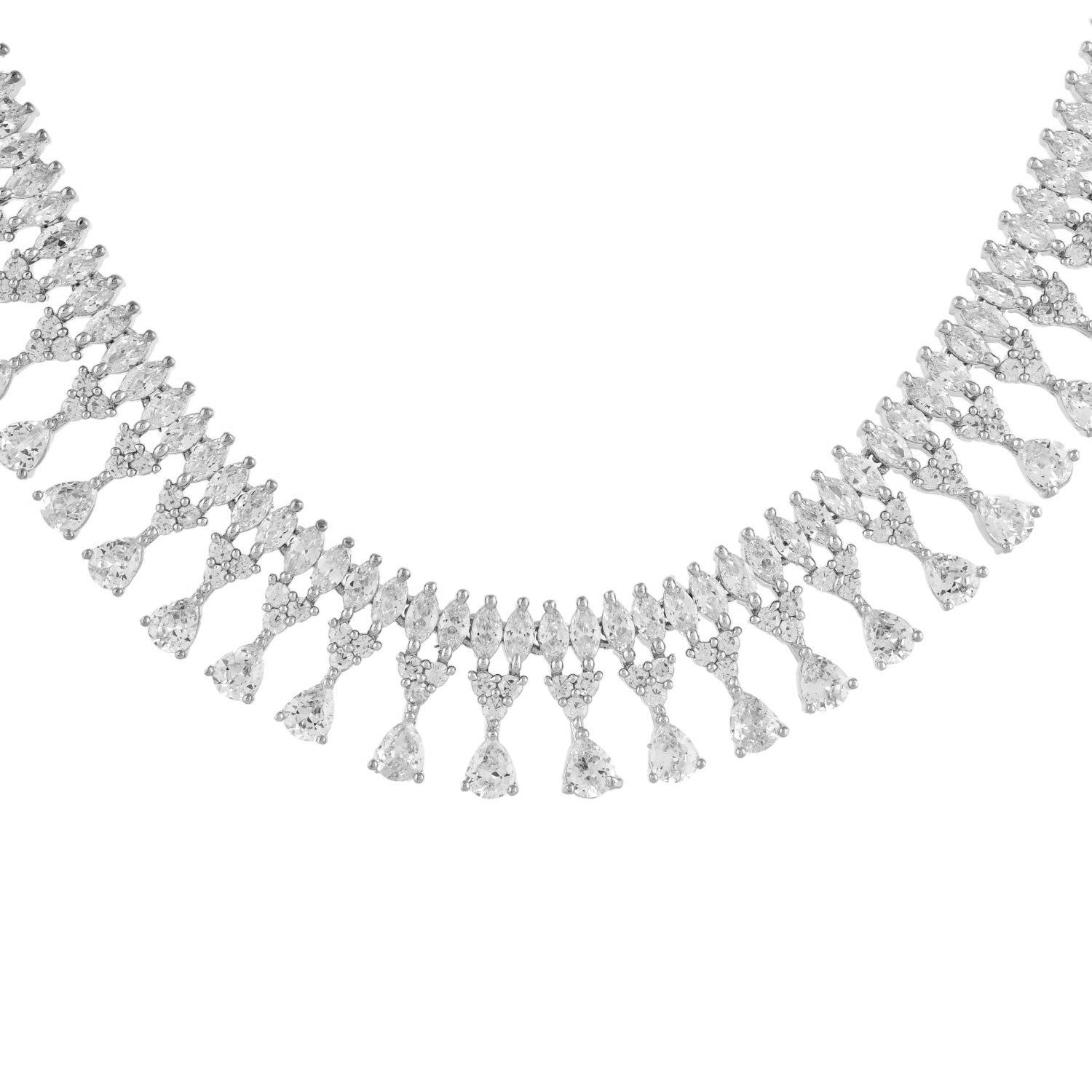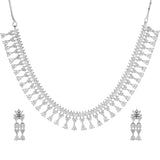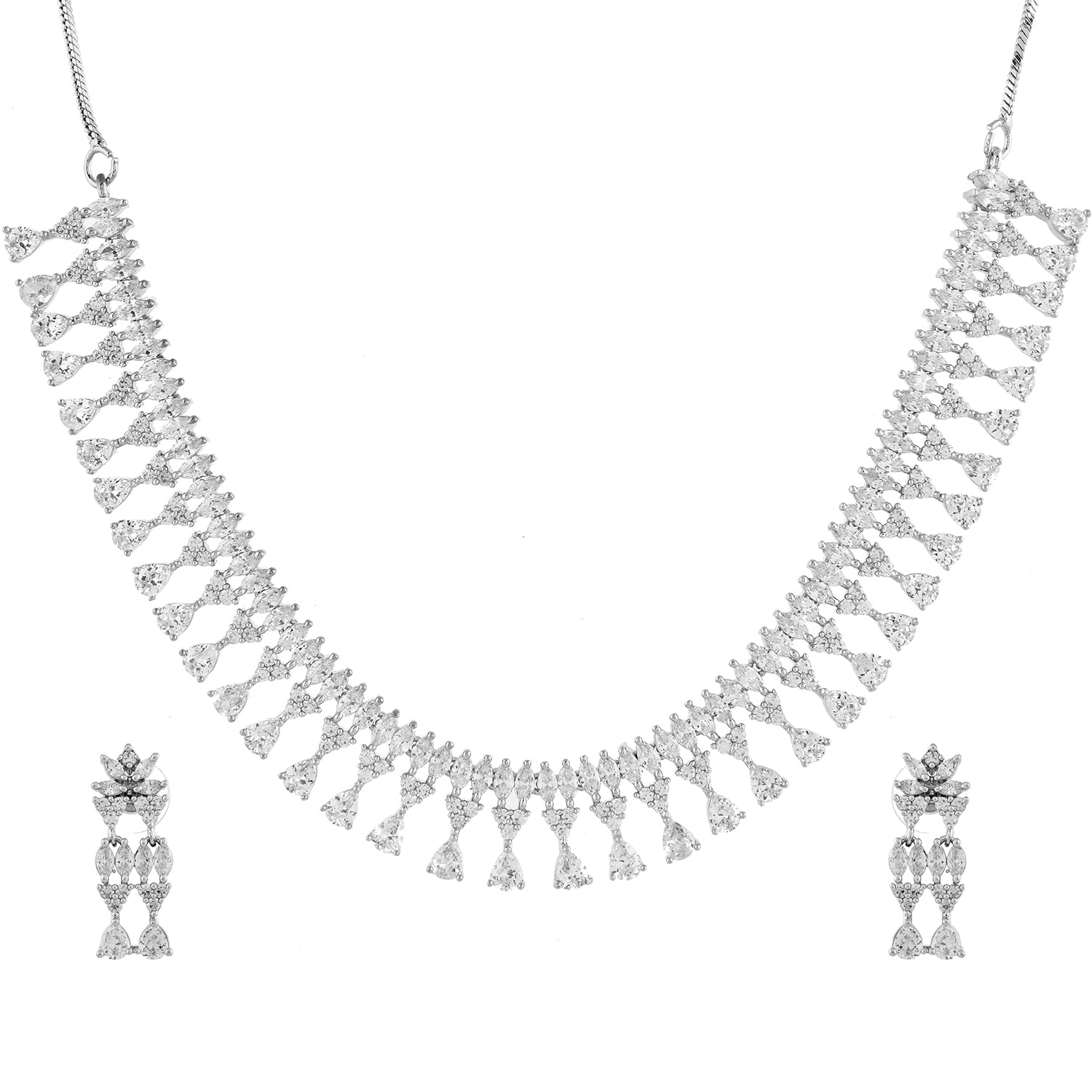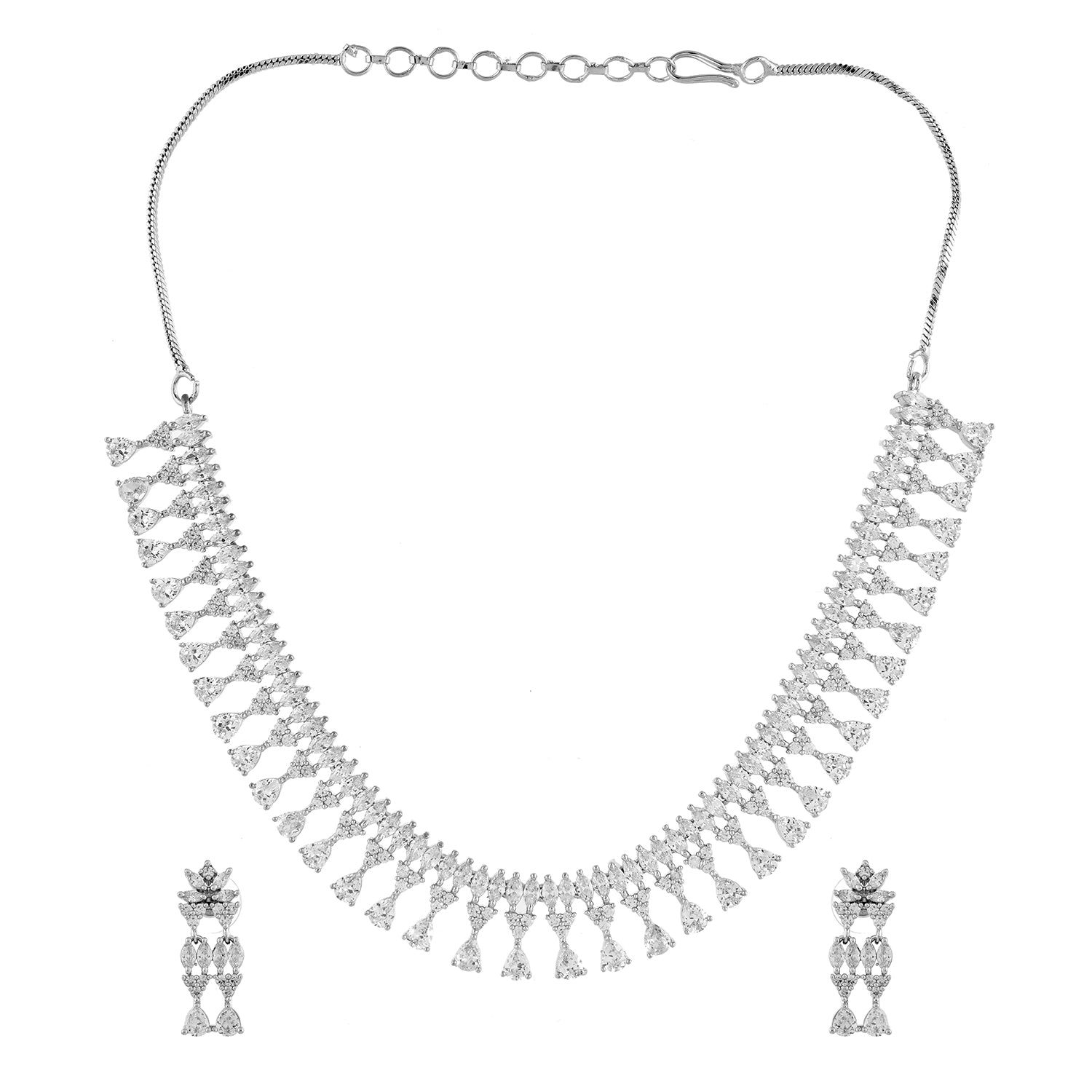 a stunning American diamond necklace set meticulously designed to captivate attention. Crafted from high-quality brass and adorned with white rhodium plating, this ensemble seamlessly blends traditional allure with contemporary finesse. The necklace, a true embodiment of grace, features an array of shimmering American diamond stoneThe matching earrings mirror the elegance of their counterpart, with each stud and drop adorned with American diamonds. Whether you’re attending a wedding, a festive celebration, or simply want to make a statement, this cubic zirconia-adorned treasure from Voylla promises to elevate your style. It’s an ideal gift for women-be it your sister, mother, or a dear friend on special occasions like Diwali, Rakshabandhan, or as a thoughtful Rakhi gift. Add a touch of brilliance to your ensemble with this American diamond necklace set, perfect for both pooja wear and festive gatherings. s meticulously arranged in teardrop silhouettes.