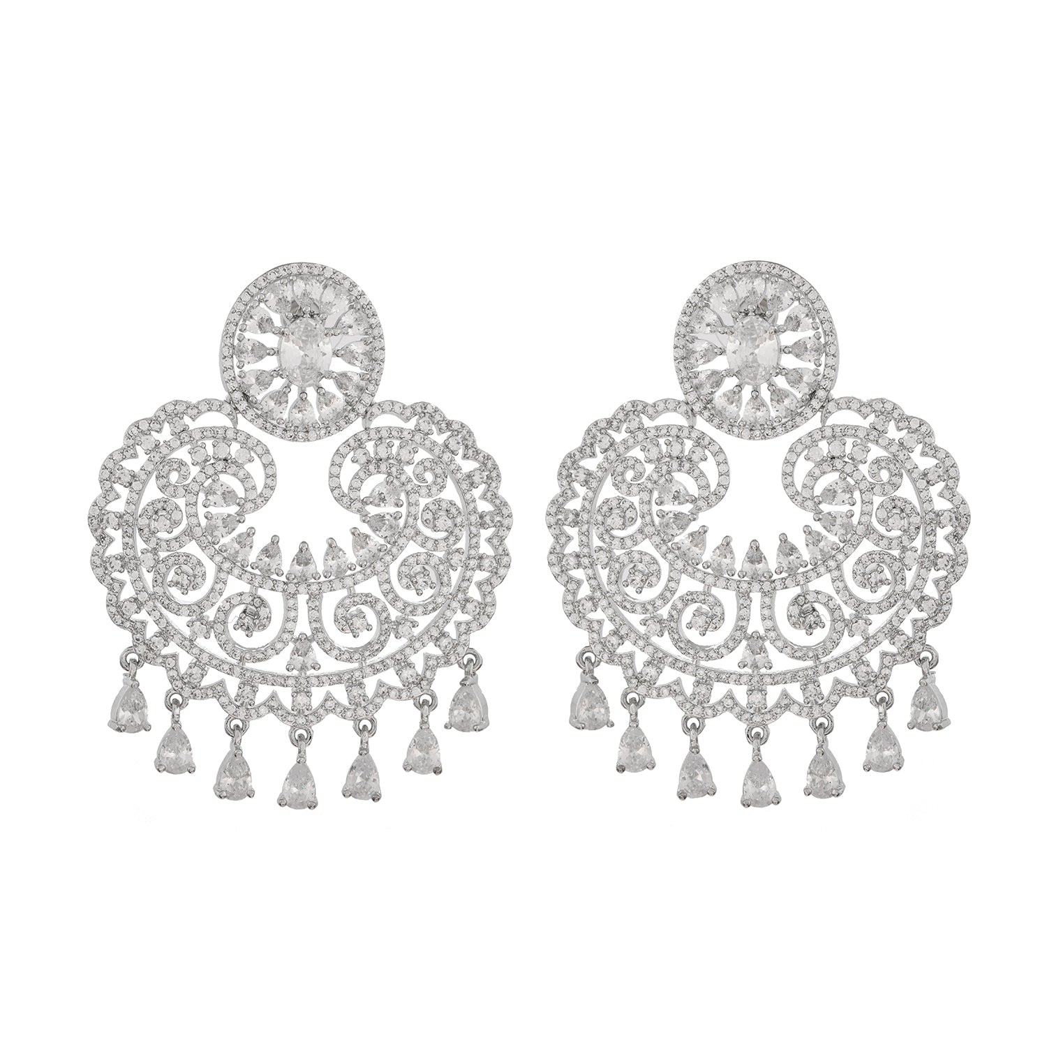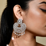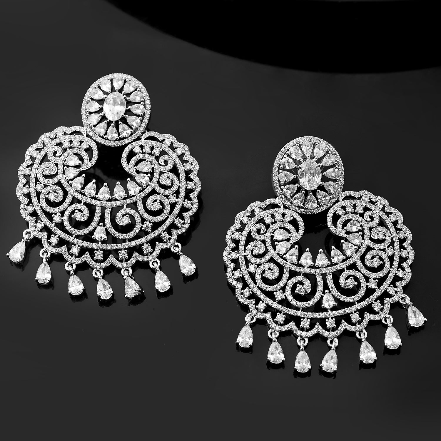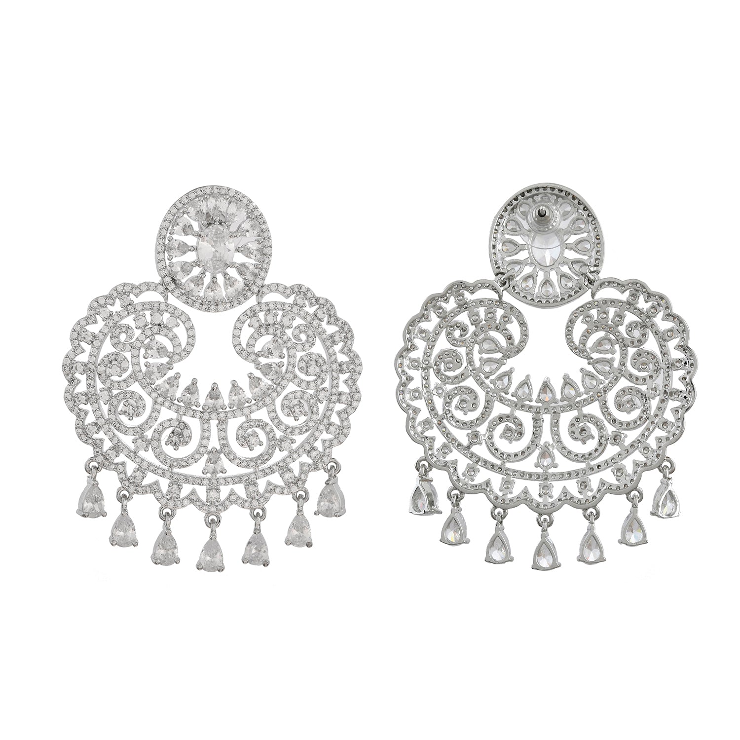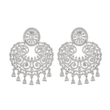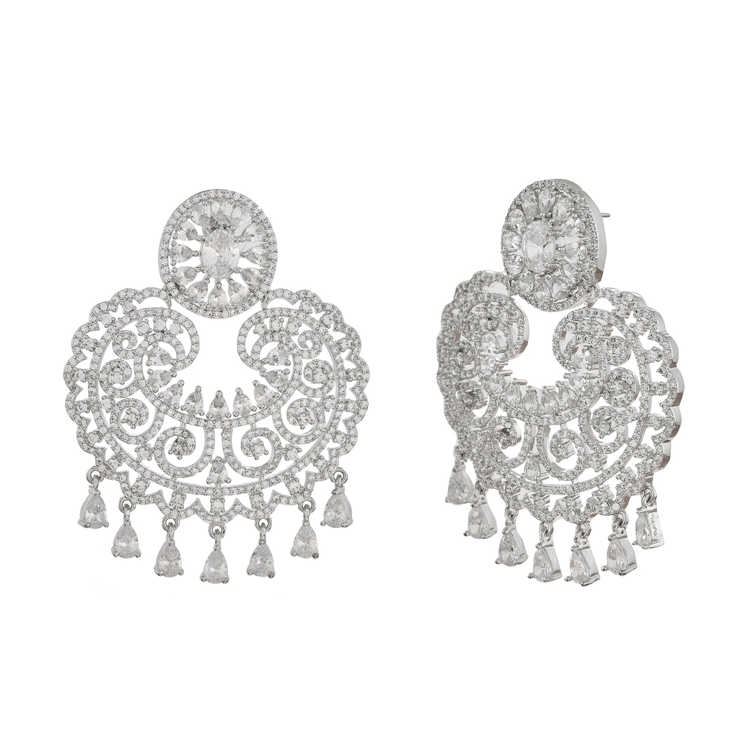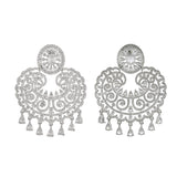 These stunning Voylla earrings are crafted from high-quality brass and feature an elegant white rhodium plating. The intricate design showcases a bold and sophisticated aesthetic, perfect for making a statement. Each earring is adorned with sparkling American diamonds, arranged in a mesmerizing pattern that exudes luxury and grace. The earrings boast a circular motif with delicate filigree work, complemented by dangling teardrop-shaped diamonds that add a touch of glamour. Ideal for festive occasions, weddings, parties, and special events, these earrings make a perfect gift for women, whether it's for Valentine's Day, Diwali, Rakshabandhan, Christmas, New Year, or any other celebration. Surprise your loved ones, be it your sister, girlfriend, wife, mother, or friend, with these exquisite earrings that are sure to enhance any outfit.