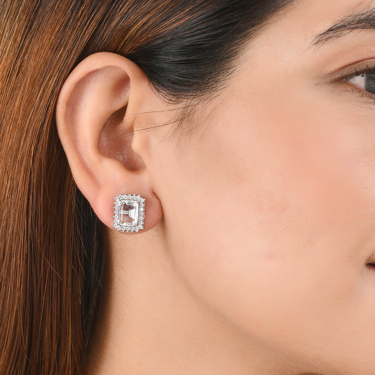 Silver plated brass earrings fashioned into a classic Victorian inspired design. Emerald cut zircons adorned, the earrings are lightweight and comfortable. Pair with a cocktail dress or designer saree.