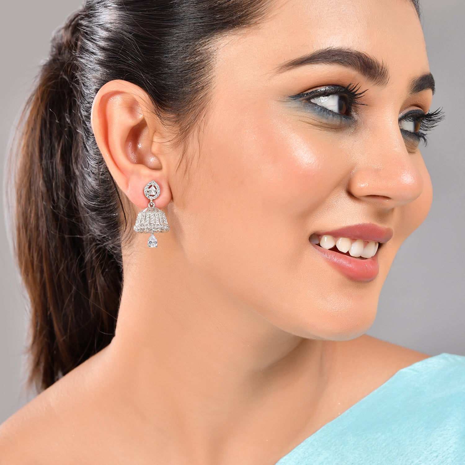 Classic jhumka drop earrings made from brass and embellished with cluster setting white zirconia gemstones. Silver plated for added charm and a good match for formal looks of all kinds.