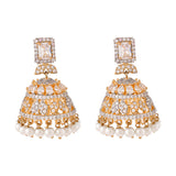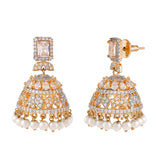 Zirconia gemstones adorned casual jhumki earrings, made from brass and two tone plated. Featuring a high polish finish and designed for style and comfort.