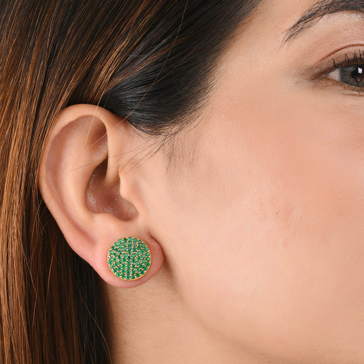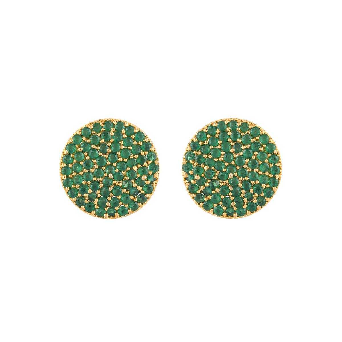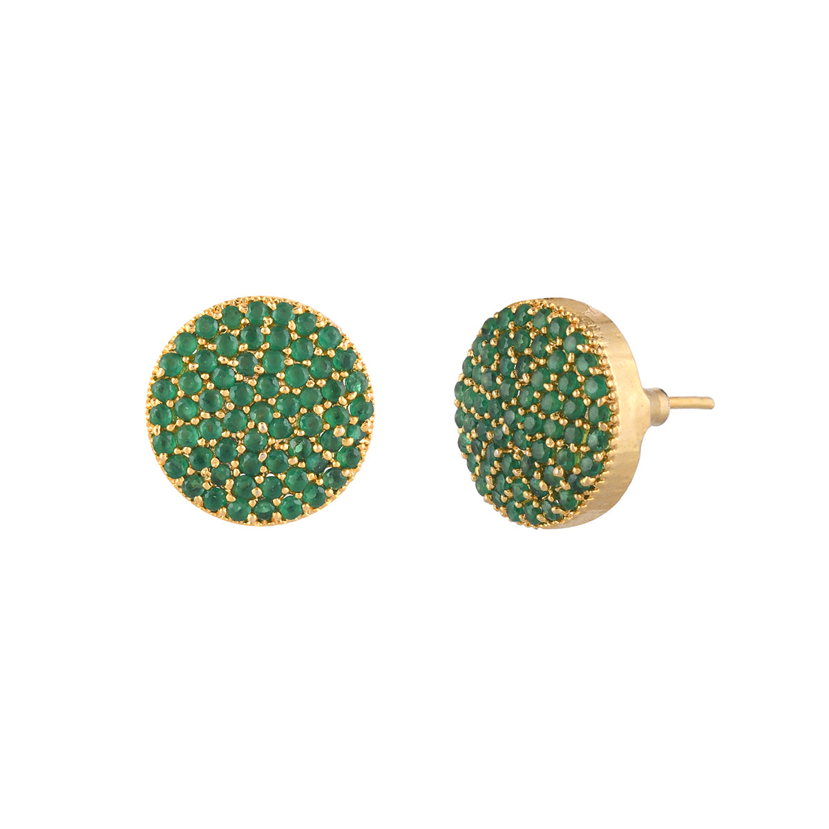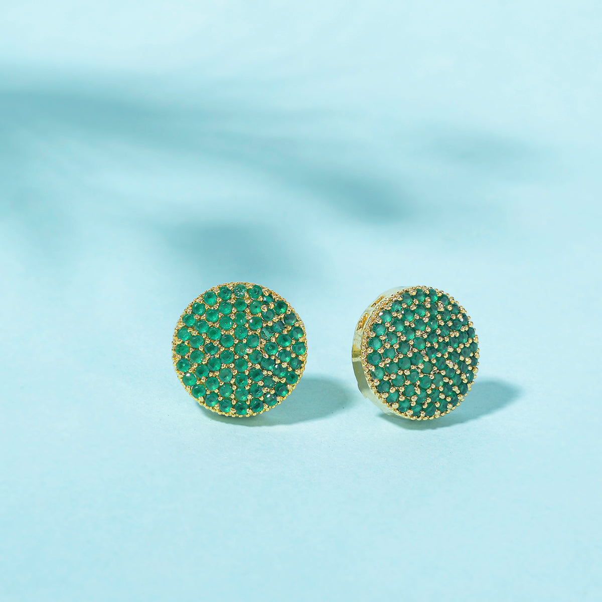 Round, large stud earrings made from brass and yellow gold plated. Embellished with green round cut zircon gemstones in a cluster setting, the earrings will pair well with formal looks of all kinds.