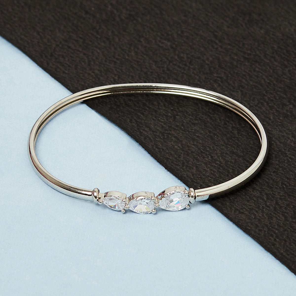Adorn this stylish bracelet, crafted from brass. This silver-toned bracelet goes with all attires making it easily pairable. Three shiny CZ stones are embellished in the center. Pair it up with an ethnic or a western outfit for a smart look.