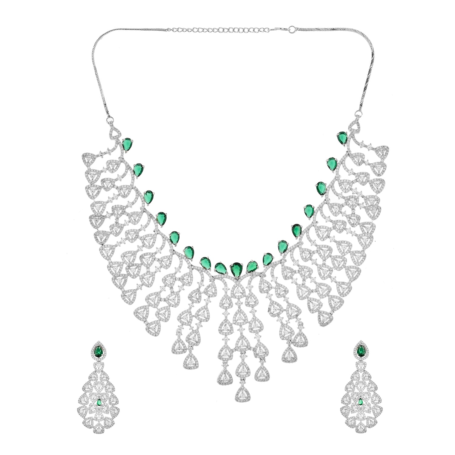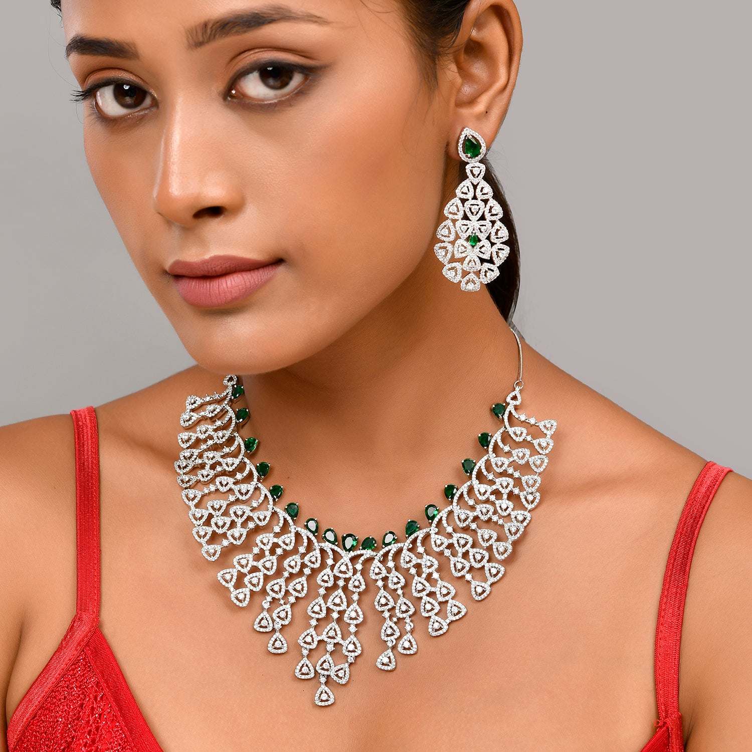 Enhance your festive look with the Voylla American Diamond Necklace Set, a perfect blend of elegance and tradition. This exquisite necklace set for women features a stunning design with green and white cubic zirconia stones, meticulously set in rhodium-plated brass.The necklace has a cascading design with multiple layers of stones, while the earrings complement the necklace with a similar design.Ideal for Navratri, Diwali, Durga Puja, Rakhi, and other festive occasions, this necklace set is a must-have accessory. Whether you're looking for a gift for your wife, sister, girlfriend, mother, or friend, this Voylla necklace set is sure to impress. Celebrate the festive season in style with this dazzling piece of jewelry.