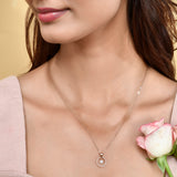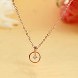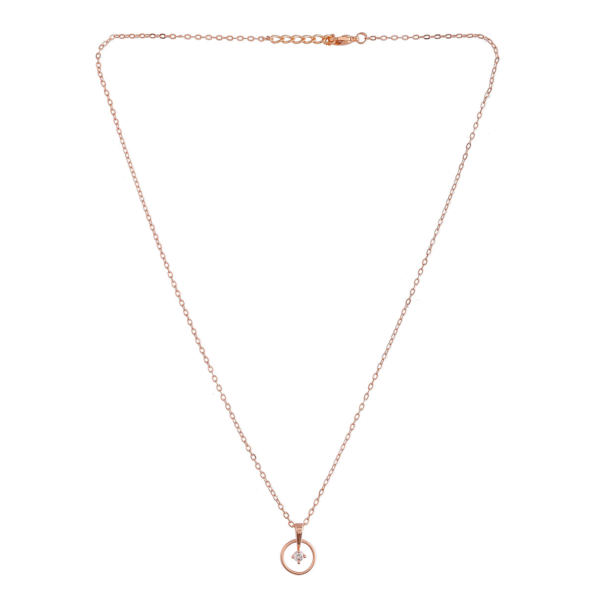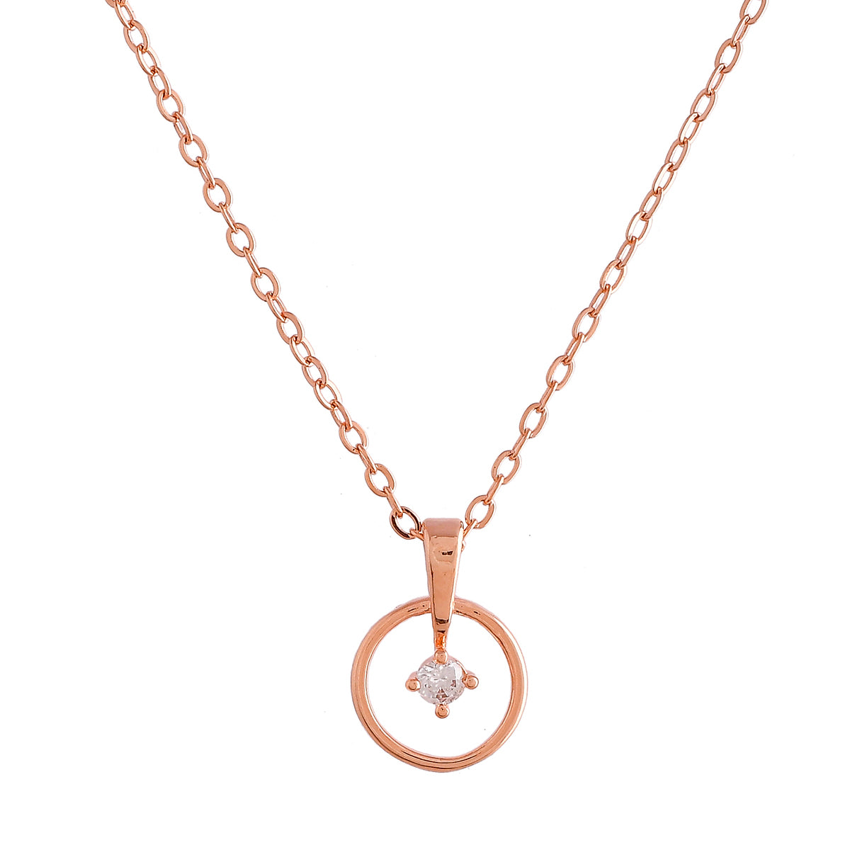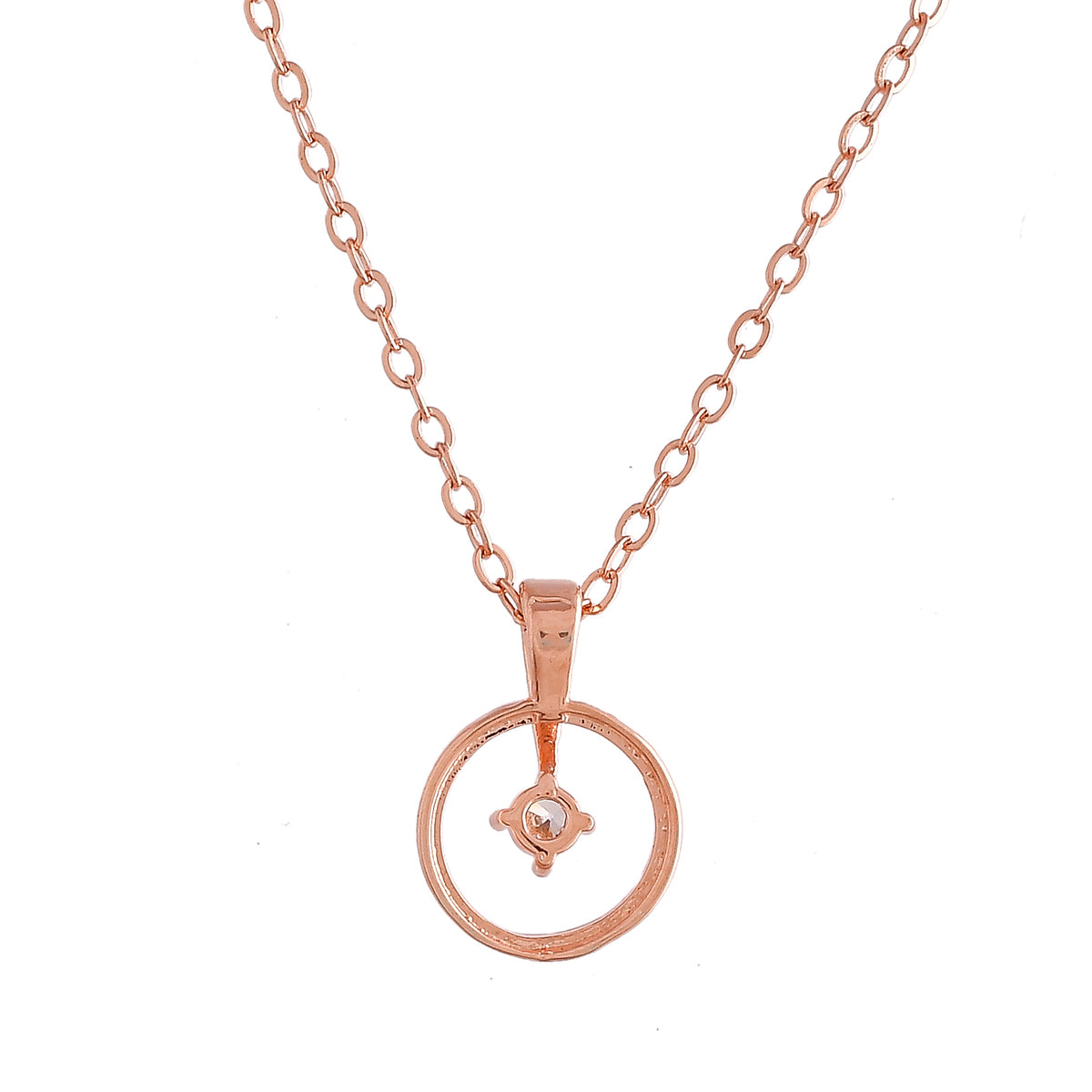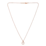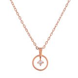 Circle motif pendant embellished with a single, drop style round cut zirconia gemstone. Made from brass and rose gold plated, the pendant has been threaded in a thin rope chain and is perfect for everyday wear.