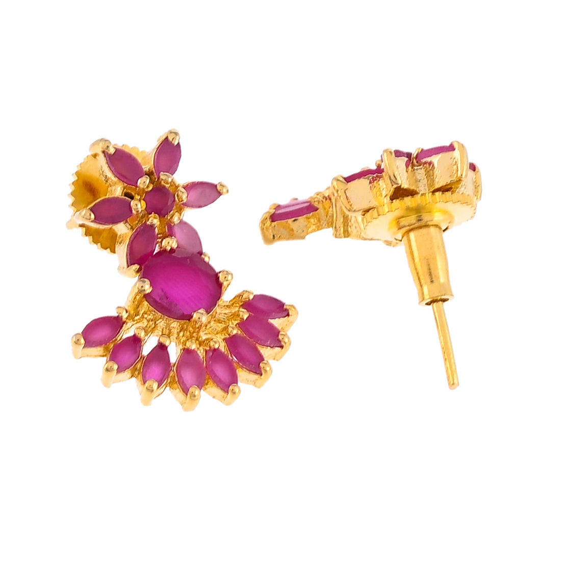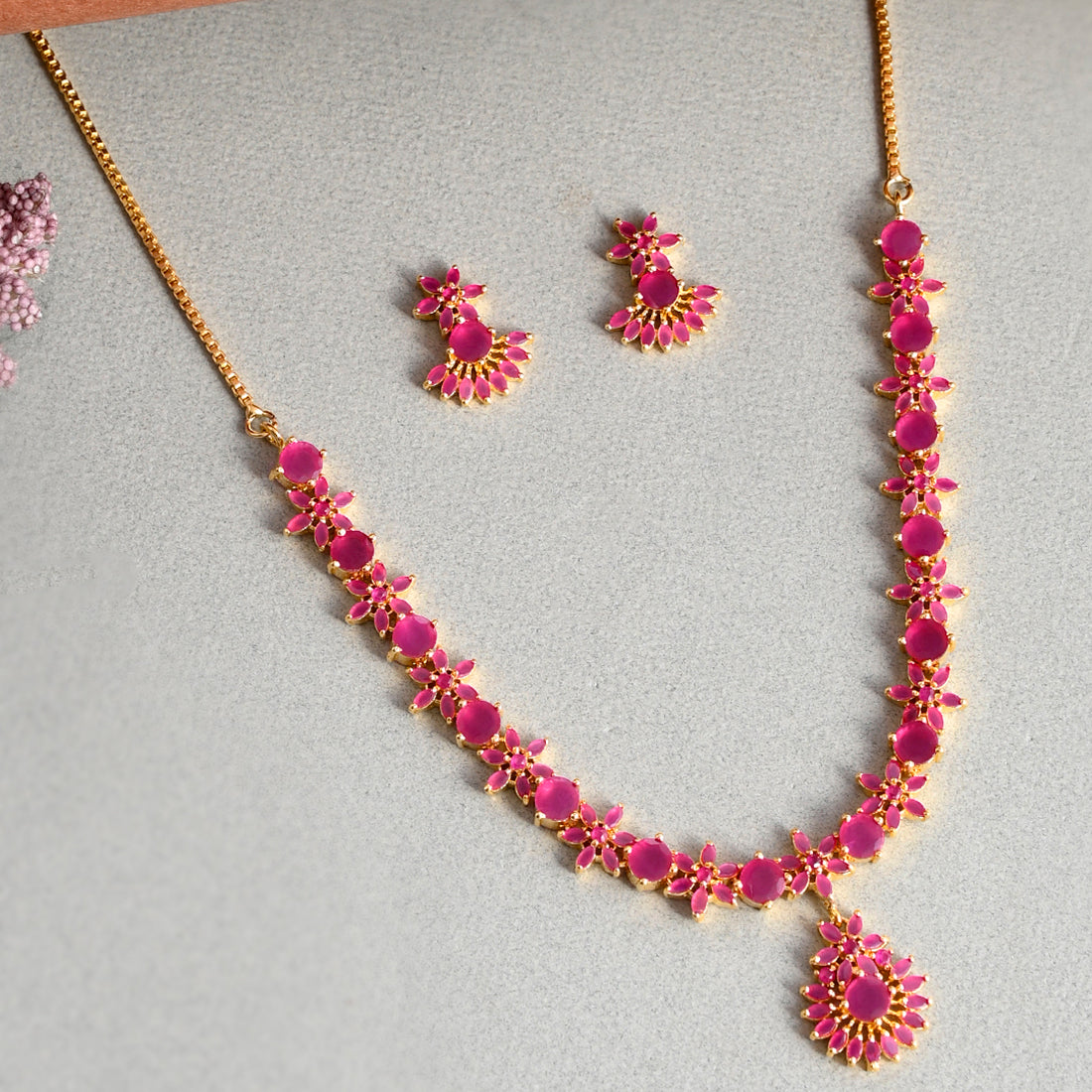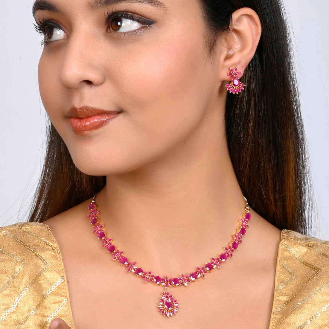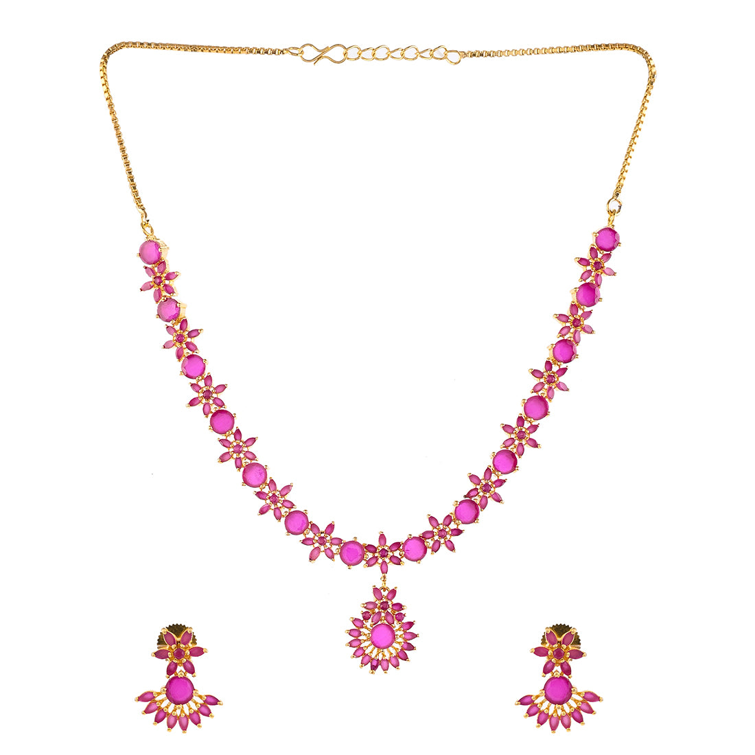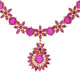 Yellow gold plated jewellery set with cluster setting pink CZ gemstones. Fashioned out of brass. Good for ethnic looks.