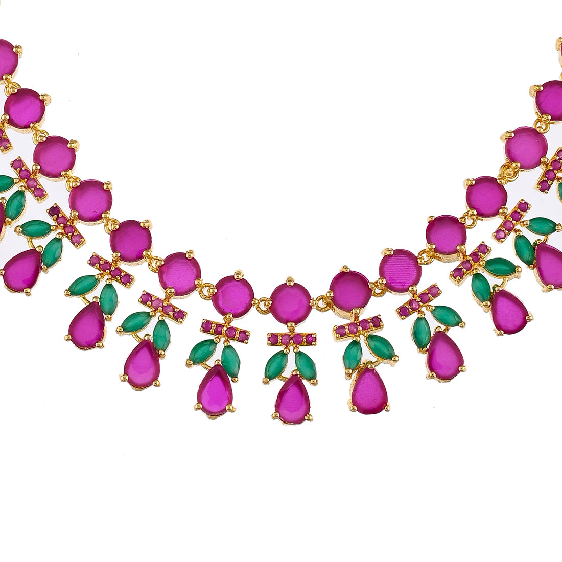 Brass jewellery set with pink and green cluster setting CZ gems. Sparkling Essentials Gold plated, lightweight and versatile.