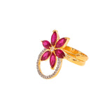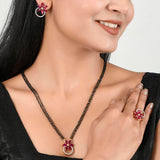 Red CZ gemstones adorned beaded mangalsutra, stud earrings and adjustable ring, all in a lovely box set. Made from brass and gold plated, each piece is lightweight, comfortable and versatile.