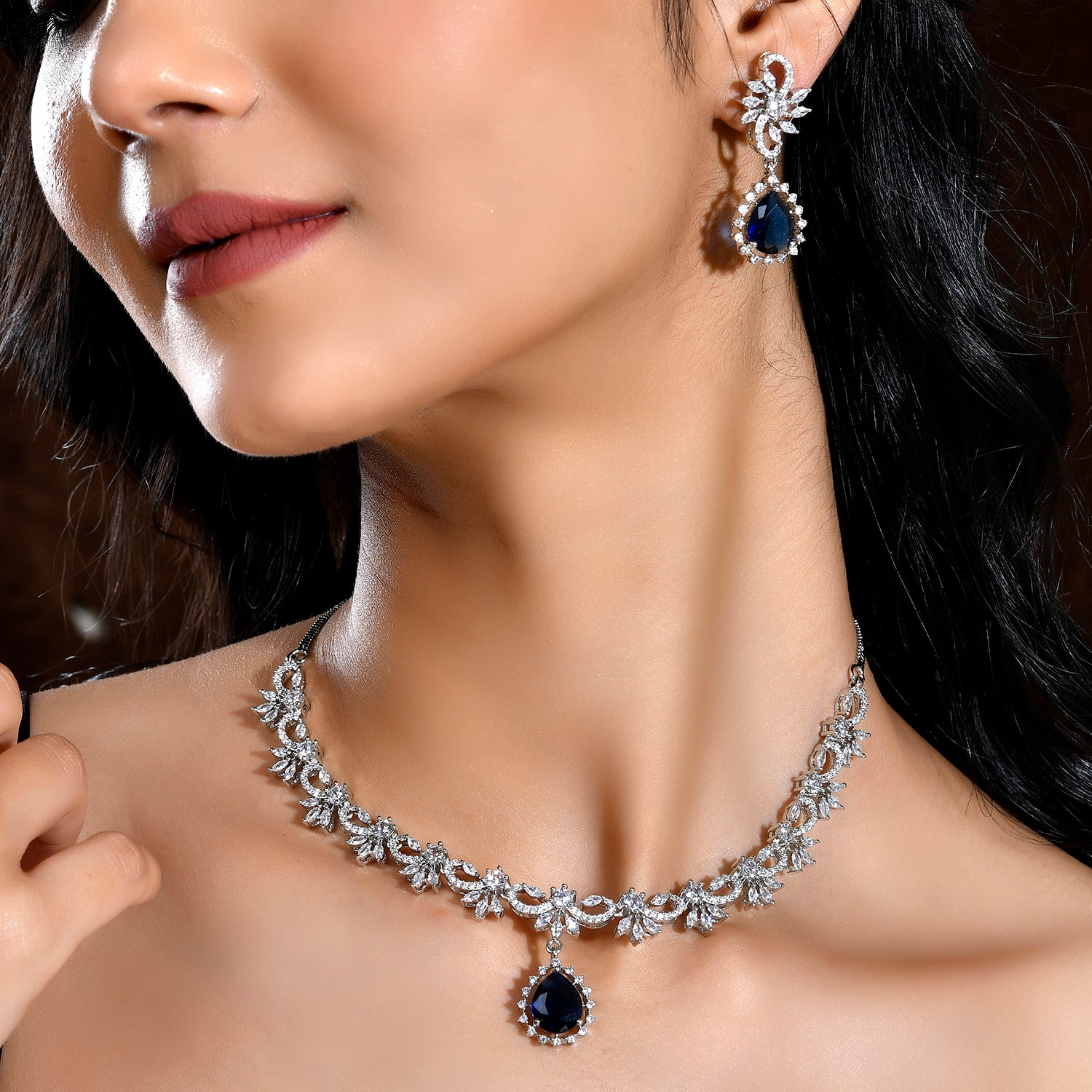 The Sapphire Blossom American Diamond Necklace Set is an exquisite piece from the Sparkling Essentials collection, crafted with meticulous attention to detail. This stunning set features a beautifully designed necklace and matching earrings, adorned with shimmering American diamonds set in high-quality brass with a rhodium plating for a luxurious finish. The necklace showcases an intricate floral pattern with marquise-cut stones, culminating in a striking teardrop-shaped deep blue sapphire gemstone that adds a touch of elegance and sophistication. Perfect for party wear, weddings, festive occasions, or as a glamorous accessory for cocktail events, this necklace set is versatile and stylish. The blue sapphire and sparkling white combination makes it an ideal gift for women, whether for Valentine's Day, Diwali, Rakshabandhan, Christmas, or New Year. It is a thoughtful gift for a sister, girlfriend, wife, mother, or any special woman in your life.